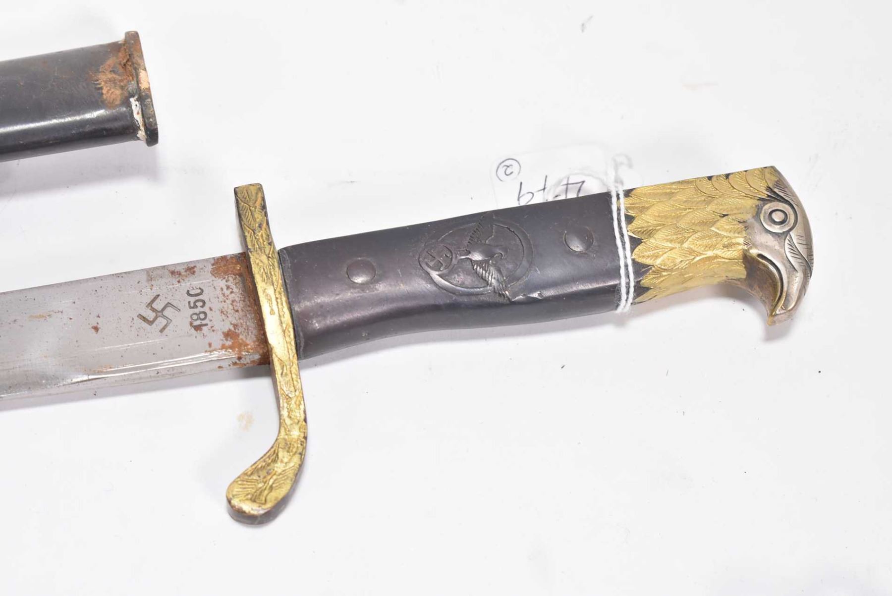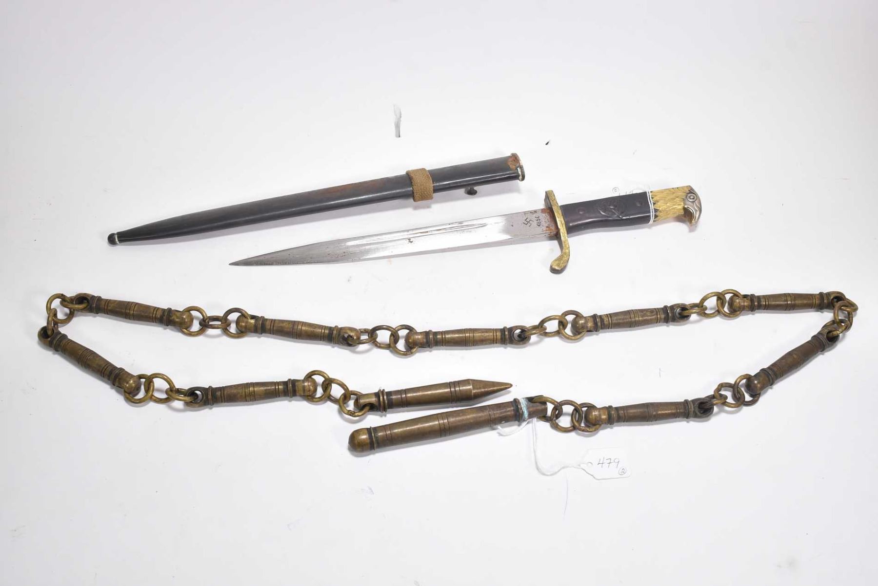 Heavy metal nine section chain whip and a replica gilt eagle Nazi dagger with sheath