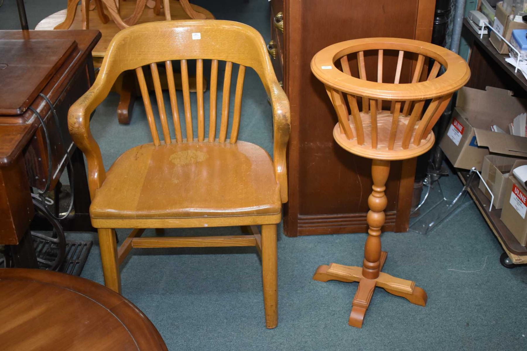 Heavy oak office chair and a center pedestal fern stand