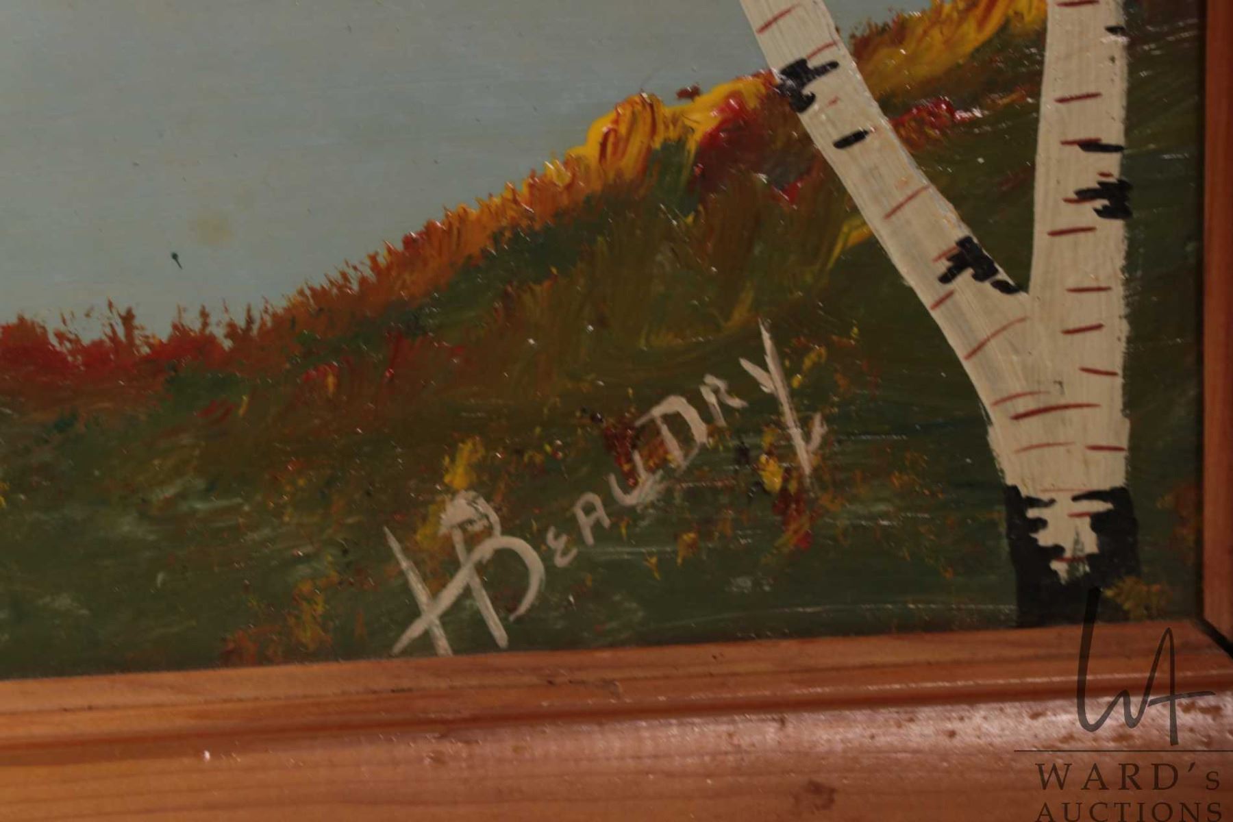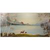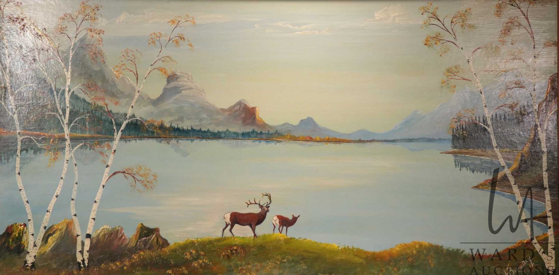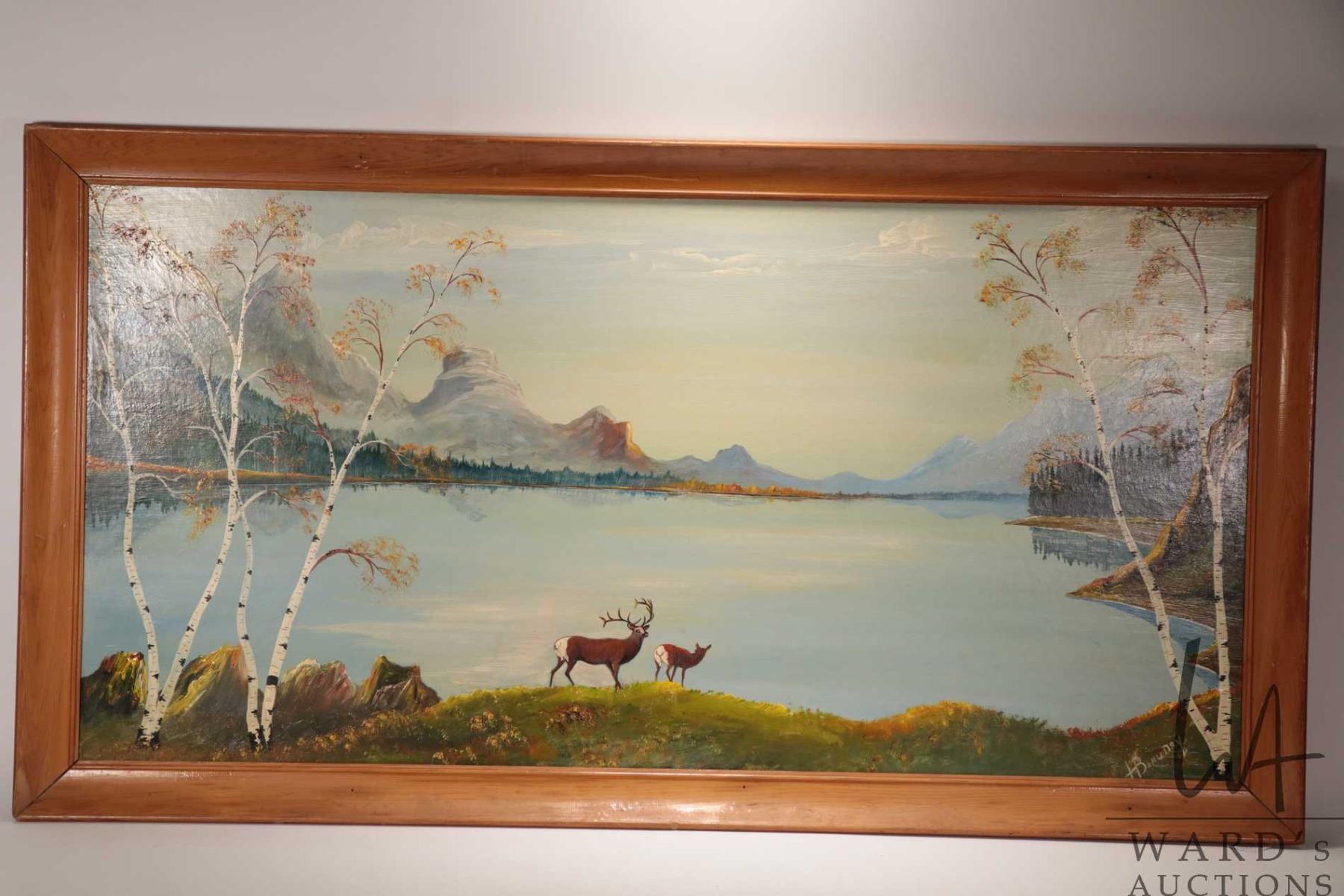 Henry Beaudry ( 1921-1916) framed oil on massonite painting of deer in a mountain lake setting, 23 1/2" X 47 1/2". Note: This is too large to ship. Local pickup only
