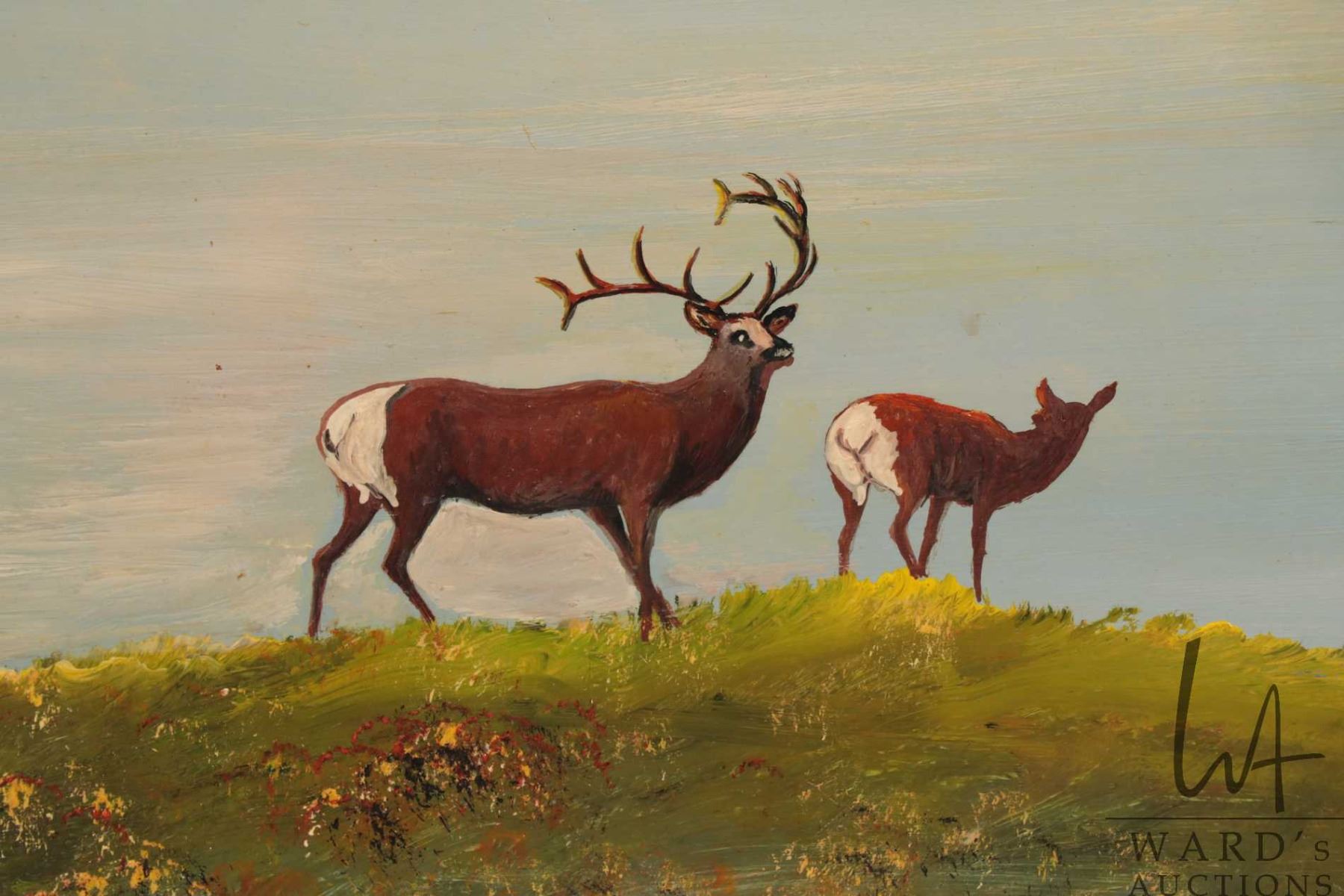 Henry Beaudry ( 1921-1916) framed oil on massonite painting of deer in a mountain lake setting, 23 1
