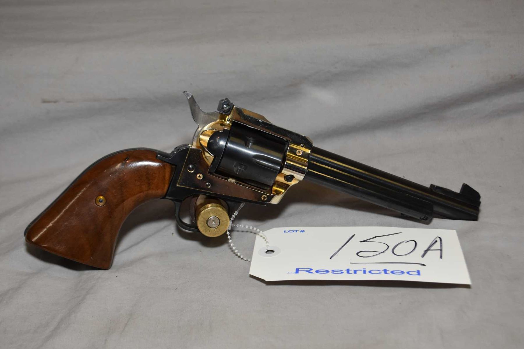 Herbert Schmidt Model 21 .22 LR Cal 6 Shot Revolver w/ 140 mm bbl [ blued finish, gold finished receiver starting to fade, slight cylinder ring, wooden varnished grips with a few marks ] Ser # 749451 Restricted Handgun Cert # TCI FRT # 25690 - 2