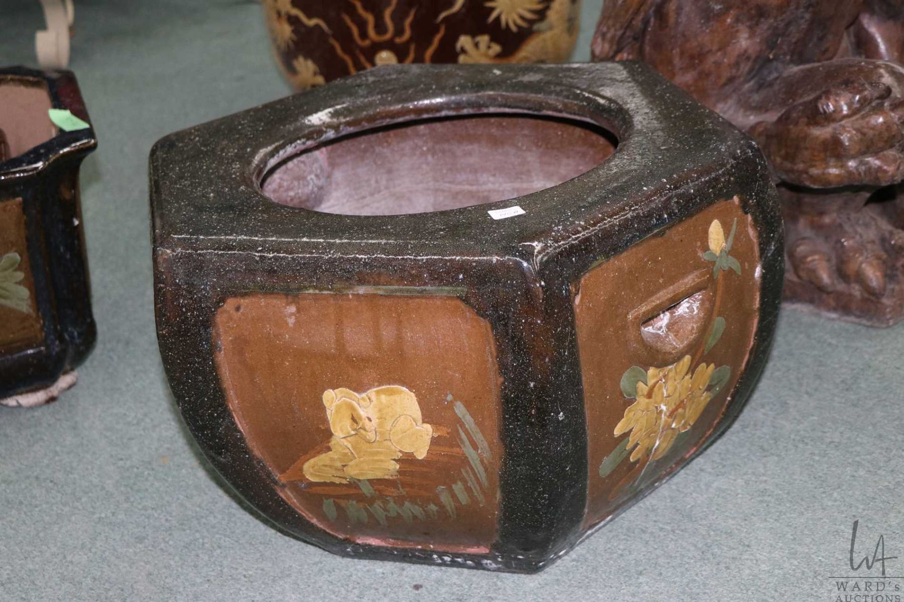 Hexagon shaped Oriental motif planter 20" diameter and 13" tall. Note: Not available for shipment. Local pickup only