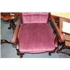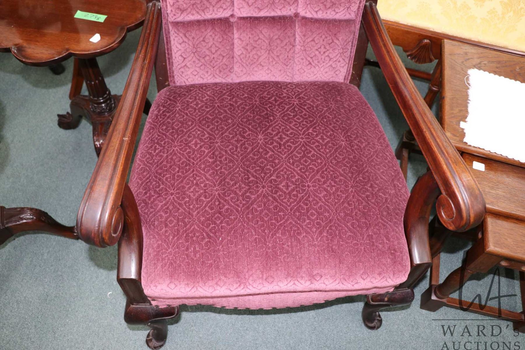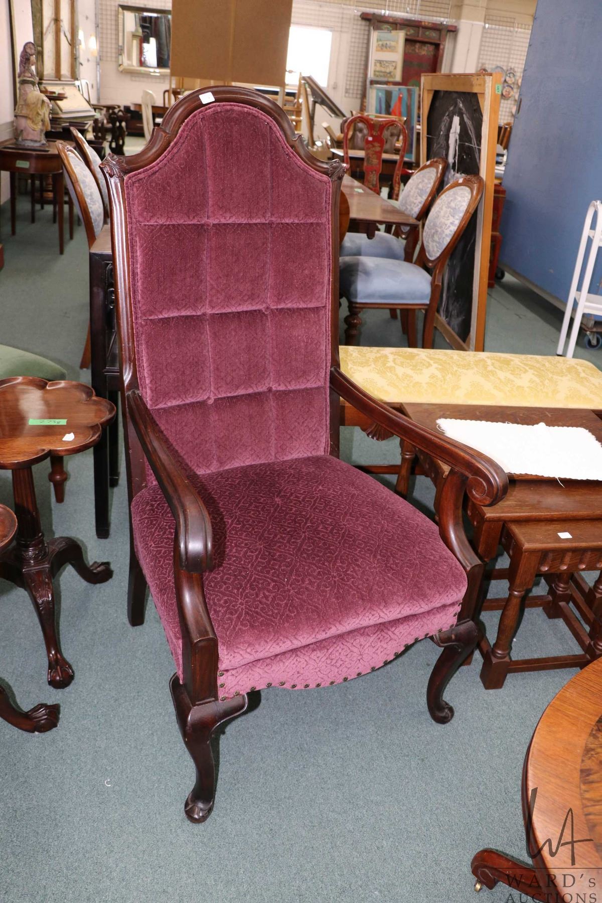 High back, open arm parlour chair with cabriole feet, decorative show wood and button tufted back