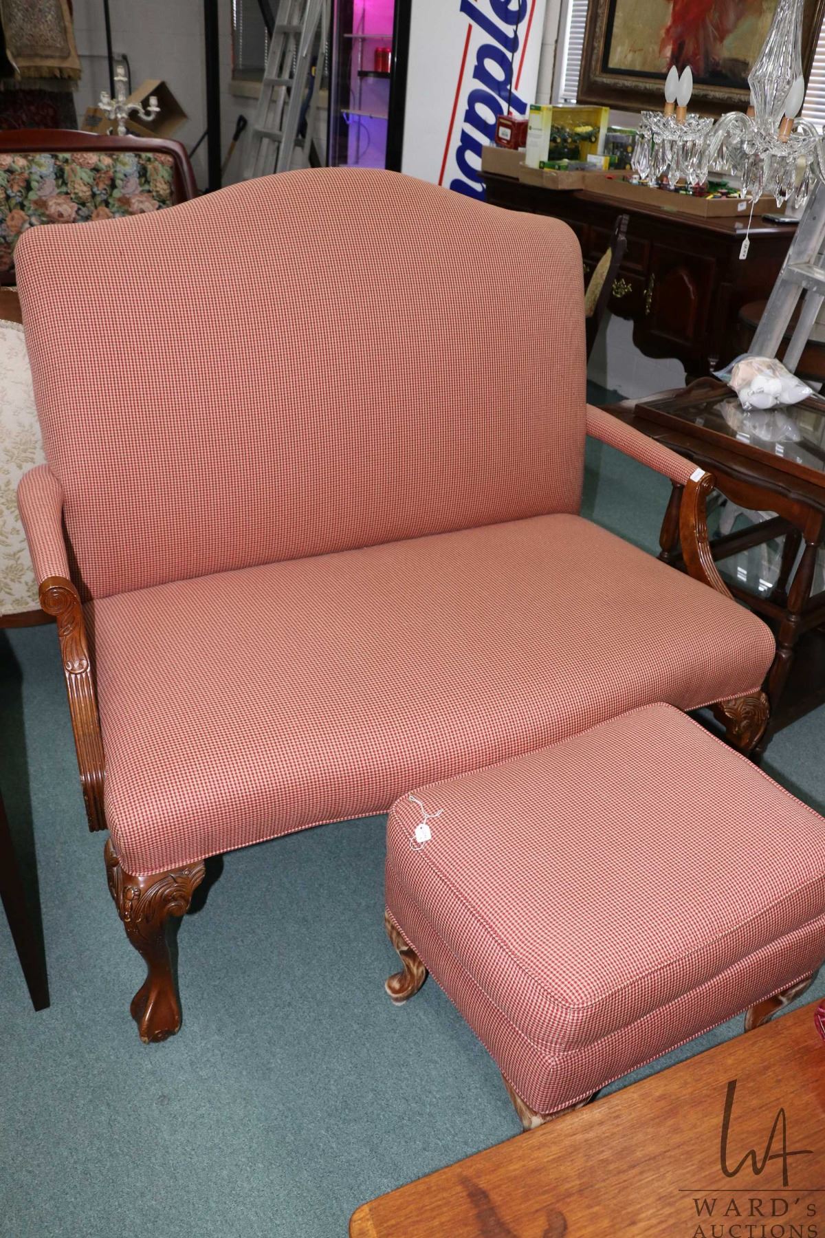 High back, open arm upholstered two seat settee with large carved ball and claw feet and small non-matching ottoman, upholstered to match