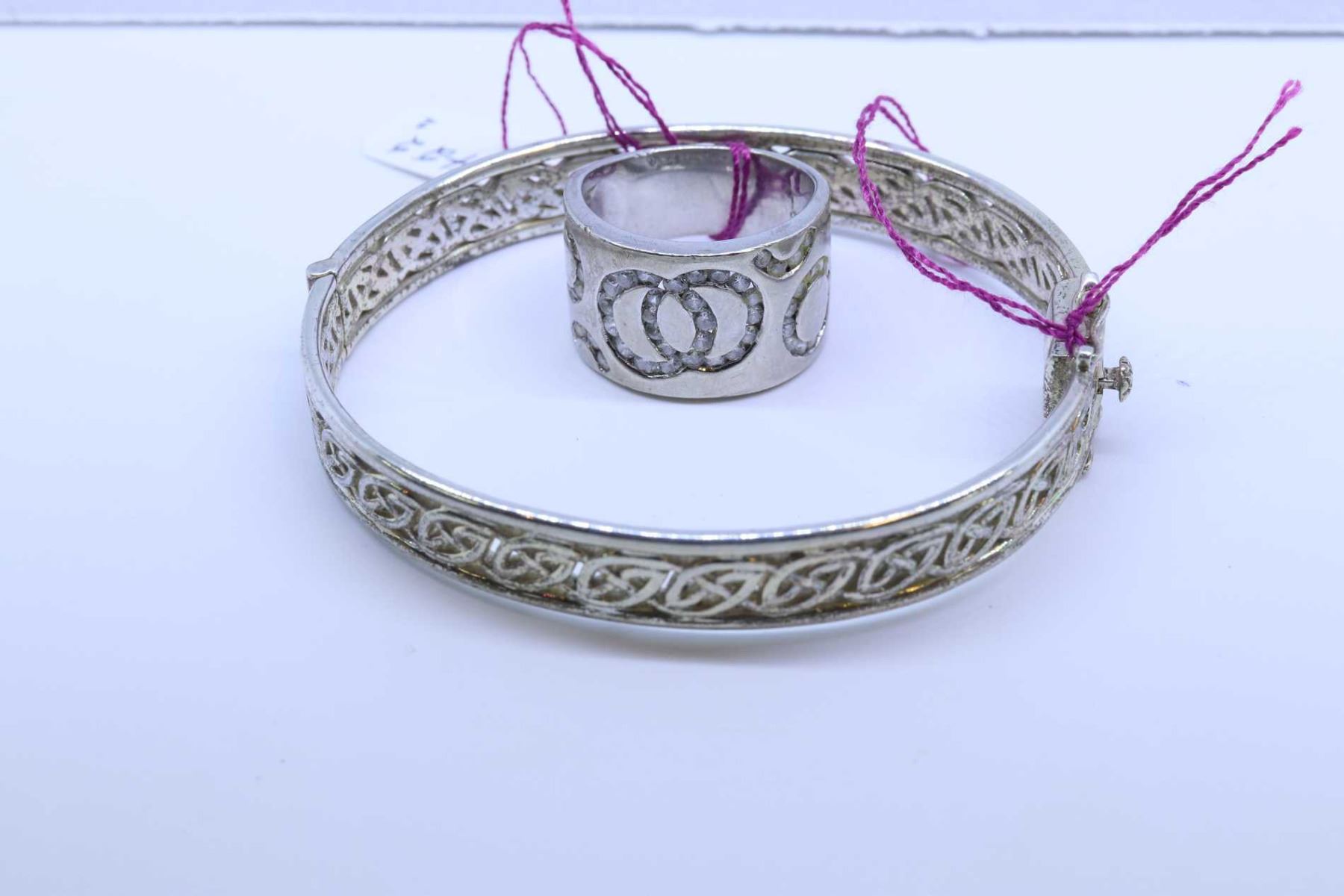 Hinged silver Celtic motif bracelet (no markings seen" and a sterling ring set with diamante style gemstones