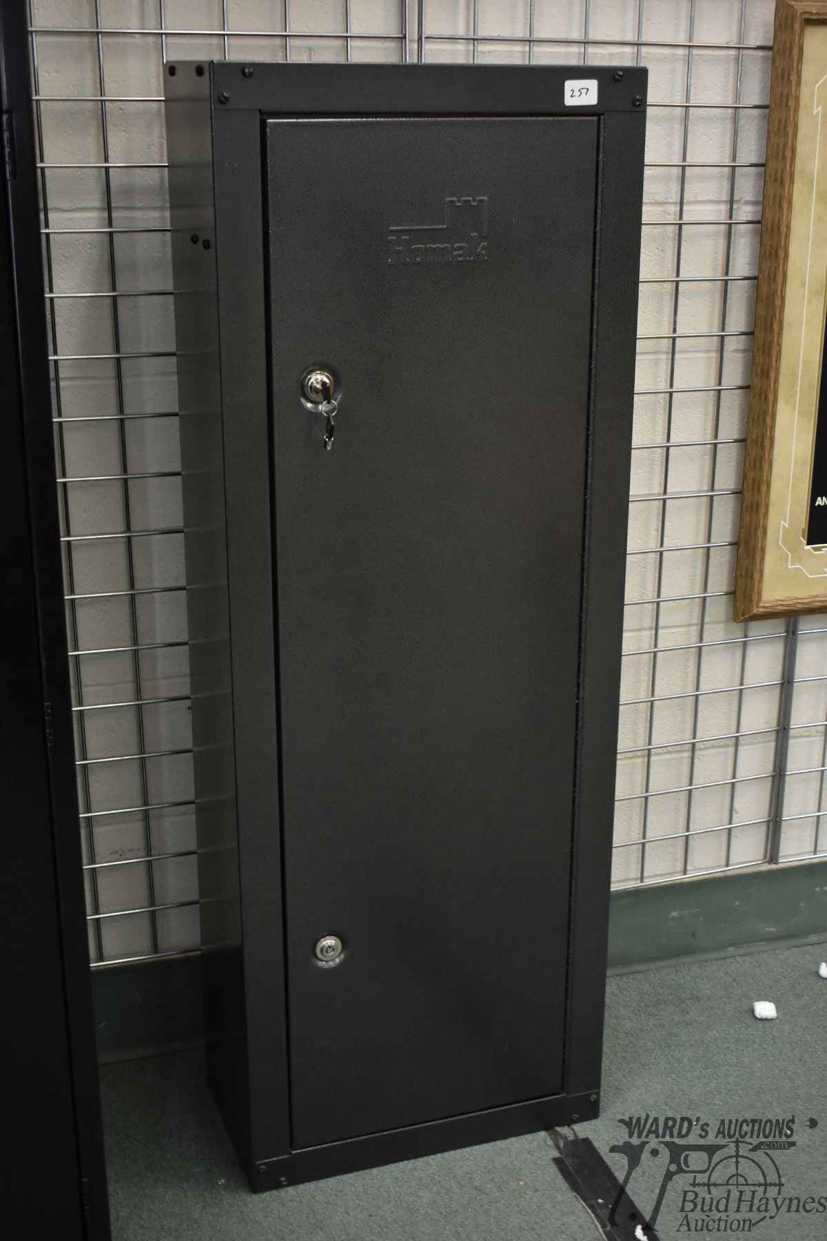 Homak eight gun metal locker w/ duel locks and ammo shelf measuring 53" H x 19" W x 10" D. Has keys