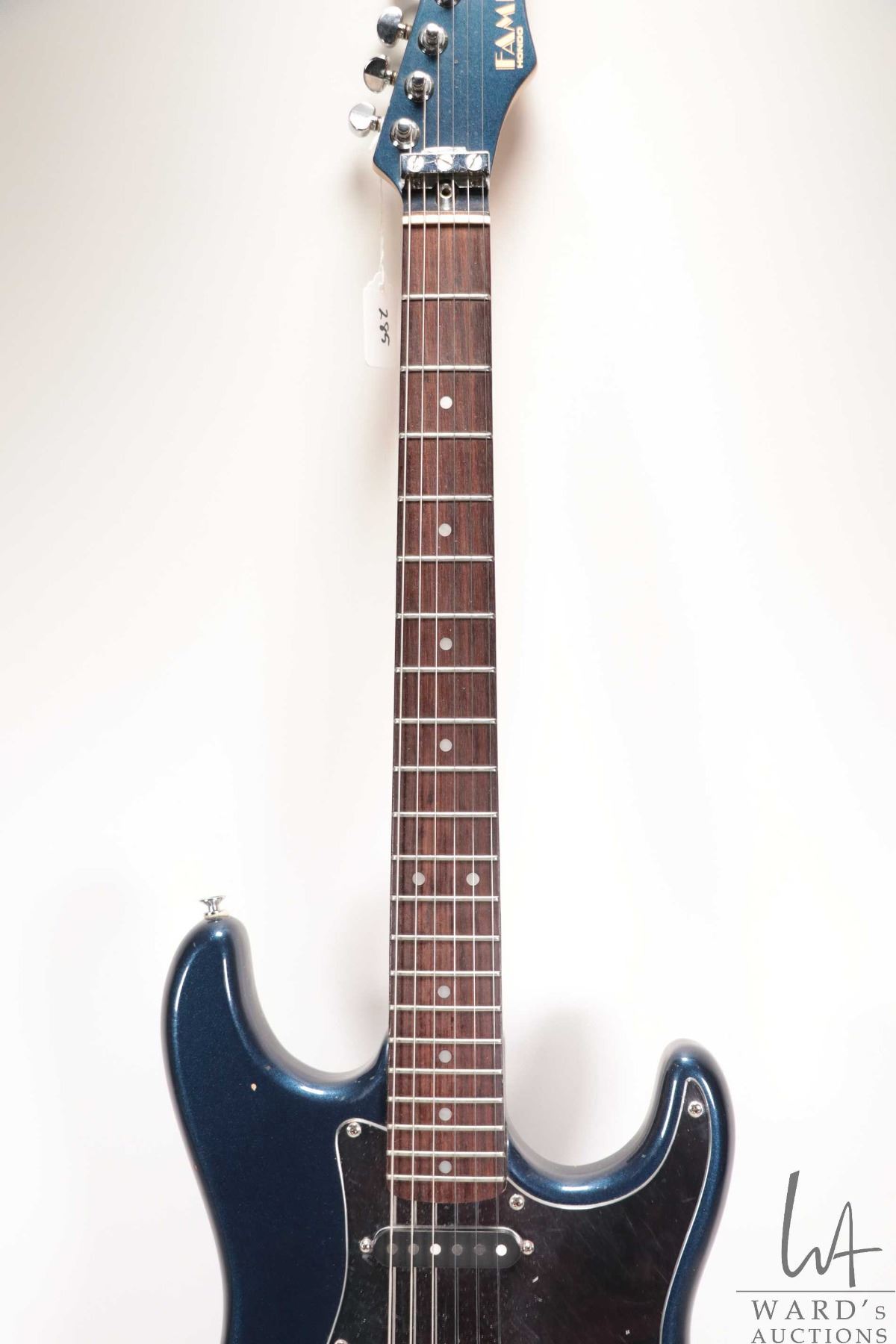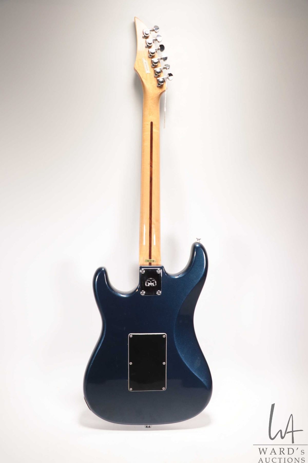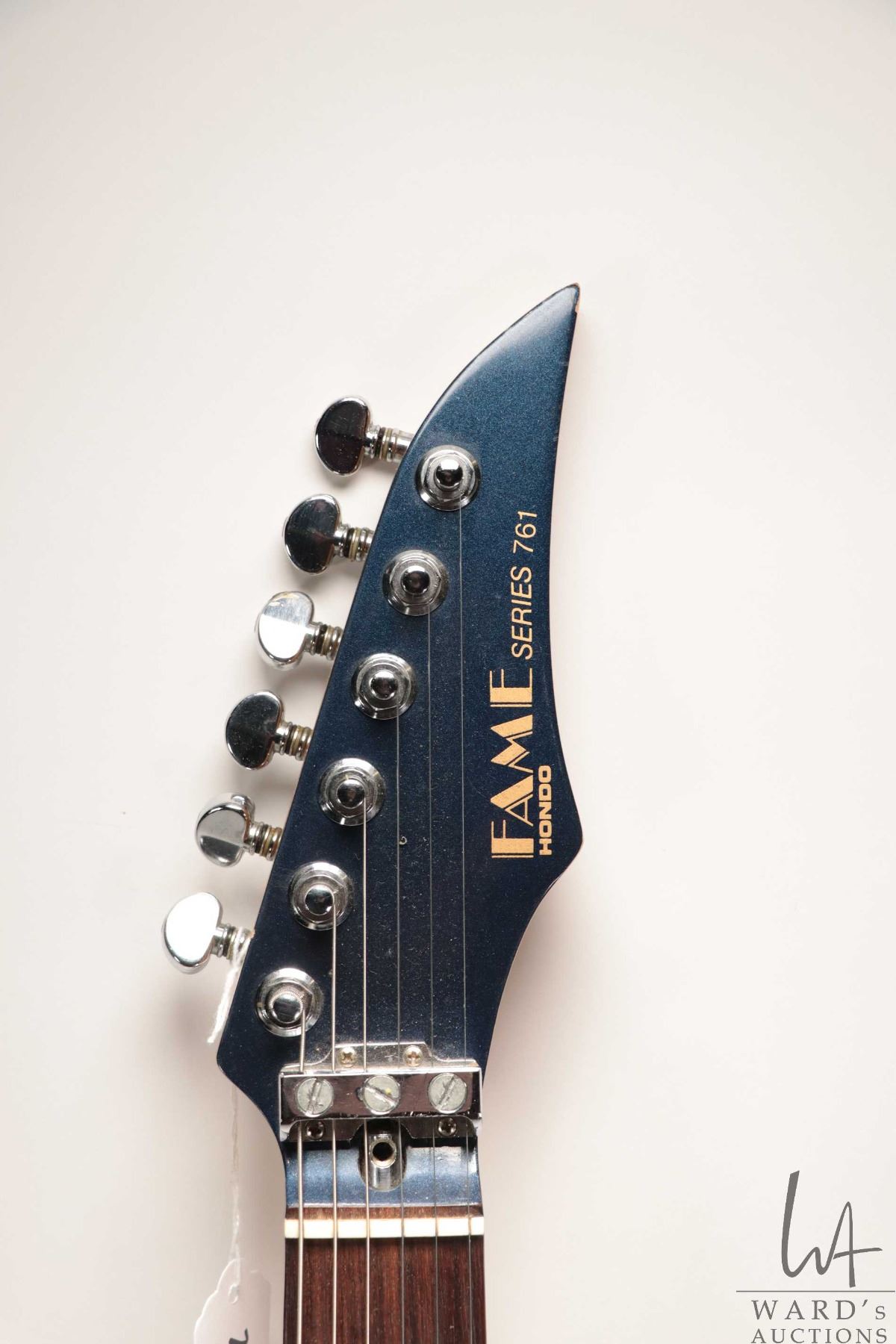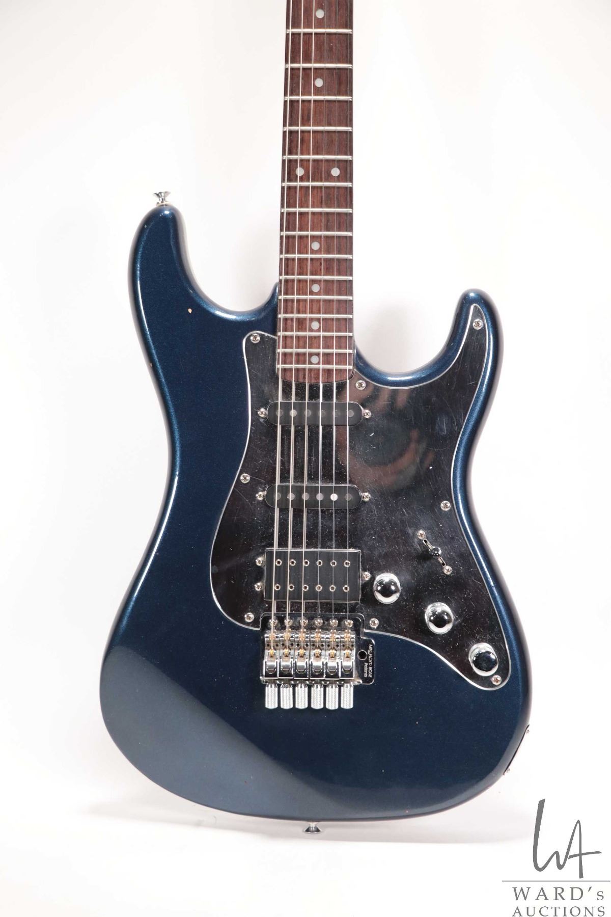 Hondo of Japan, Series 760 guitar. Metallic navy vintage Stratocaster style, HSS pickup with chrome pick guard, three way switch, three control ( note: missing one knob), Floyd Rose bridge, missing Tremolo bar. Serial no. 6046004. Includes Voyageur soft case with sling back