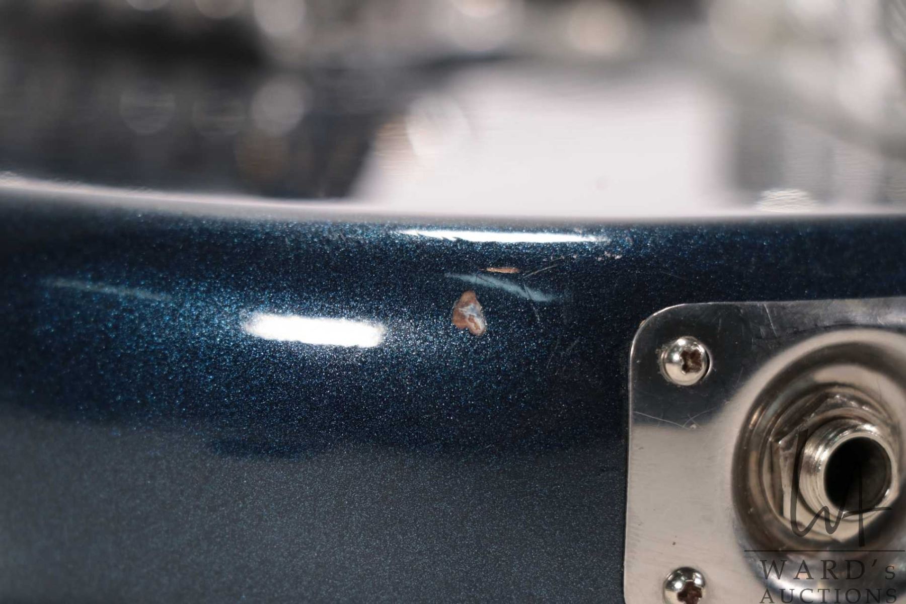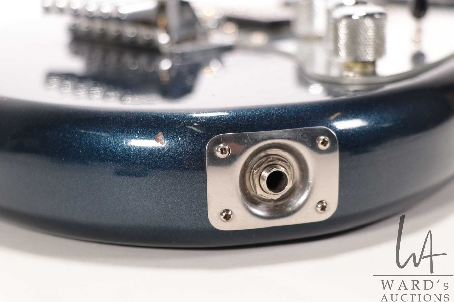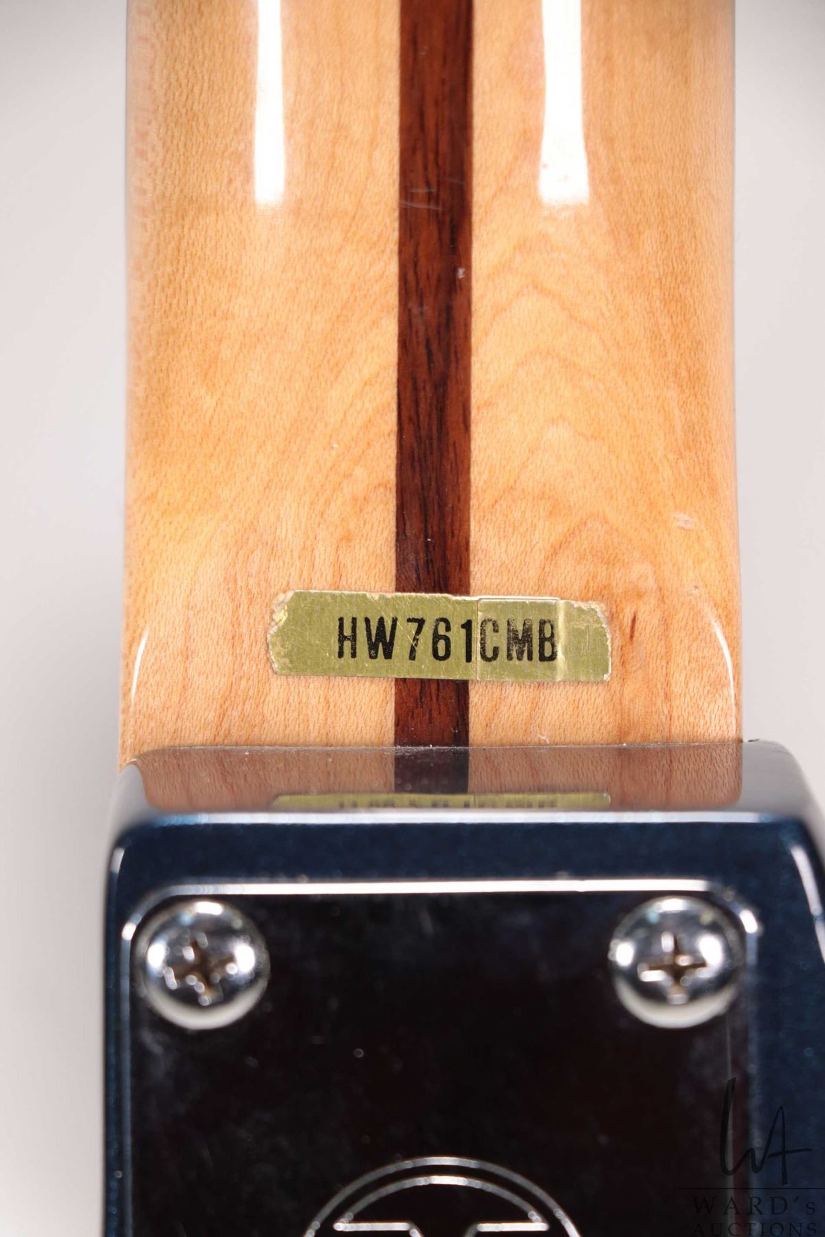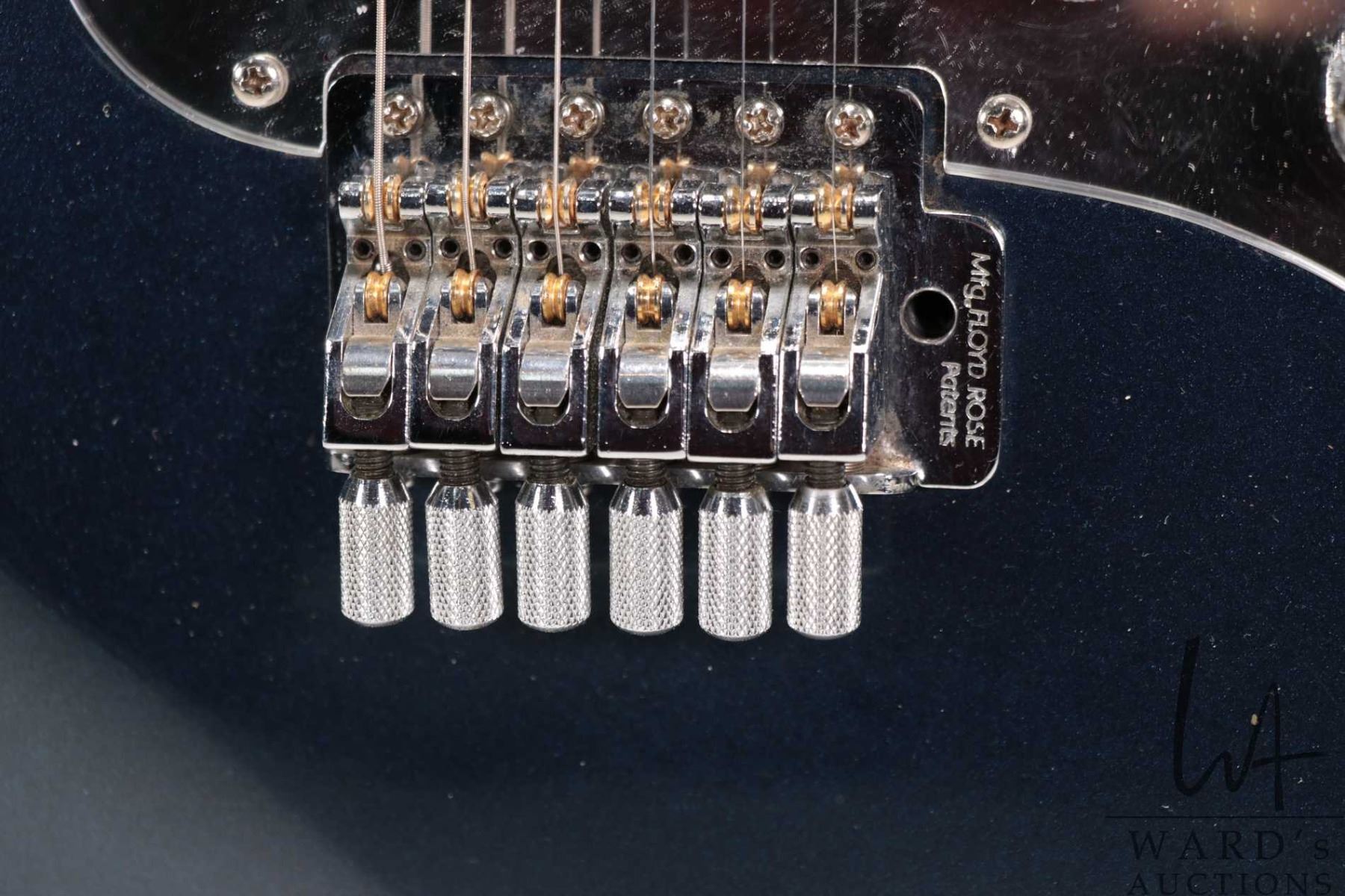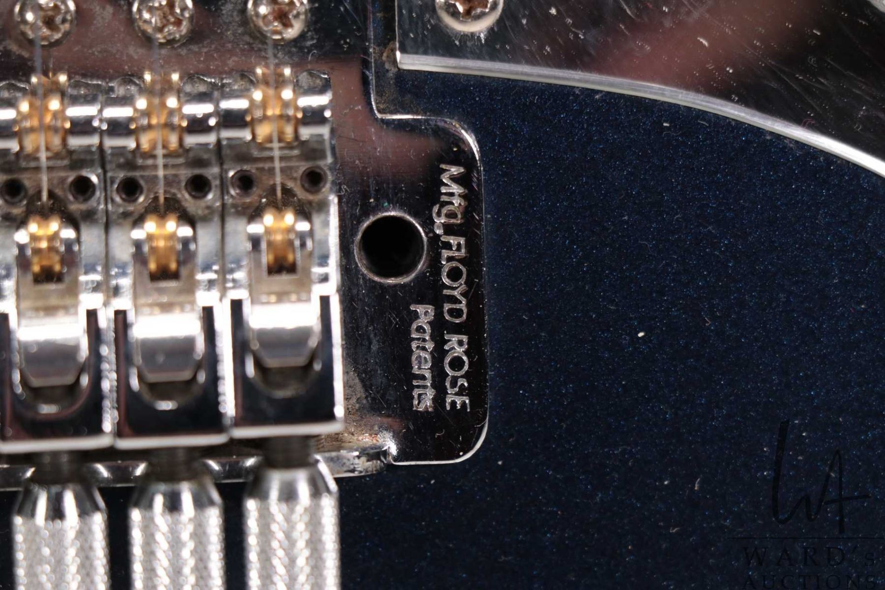 Hondo of Japan, Series 760 guitar. Metallic navy vintage Stratocaster style, HSS pickup with chrome pick guard, three way switch, three control ( note: missing one knob), Floyd Rose bridge, missing Tremolo bar. Serial no. 6046004. Includes Voyageur soft case with sling back
