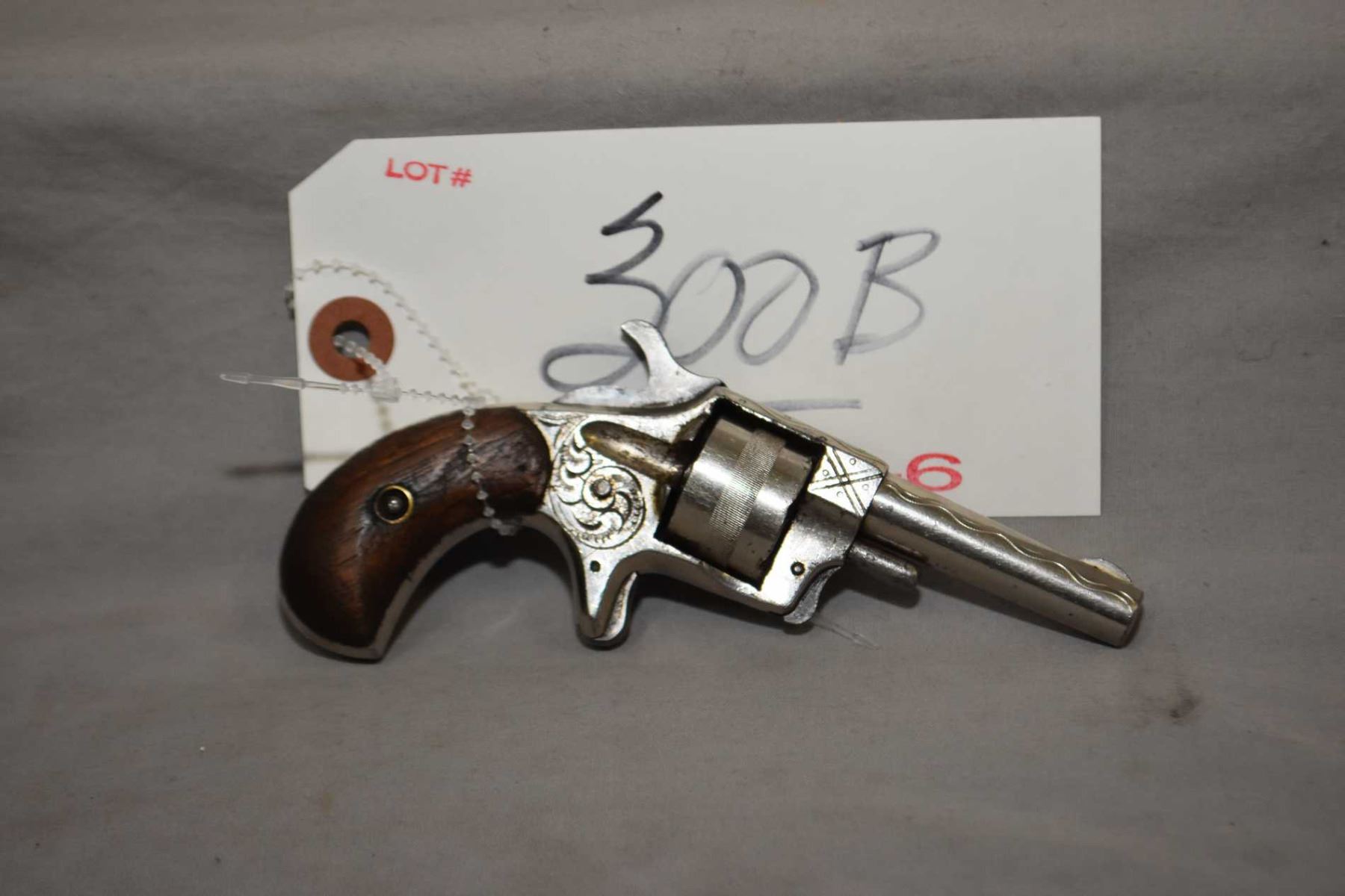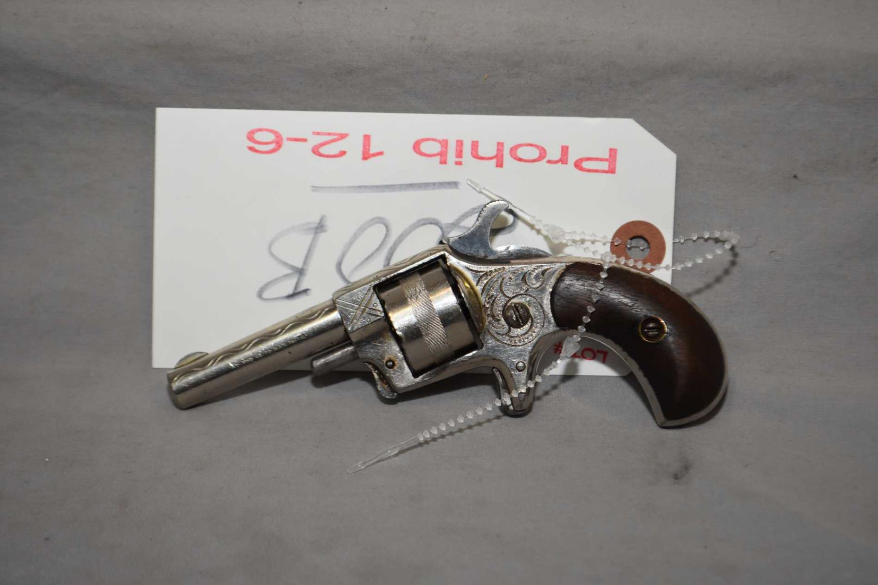 Hood Firearms Model Robin Hood No. 1 .22 Short Cal 7 Shot Revolver w/ 62 mm bbl [ lightly engraved nickel finished, spur trigger. bird's head walnut grips, some marks to wood and metal ] Ser # 6465 Prohib 12 -6 Cert # K - 188719 FRT # 19860 - 1 EXPECT DELAYS TO TRANSFER
