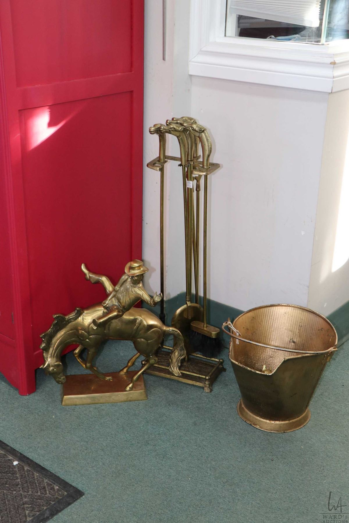 Horse motif brass set of companion tools, a brass figure of a bucking horse and rider and a coal bucket and contents including four horse motif coat hooks, a horse motif door knocker and a cowboy boot