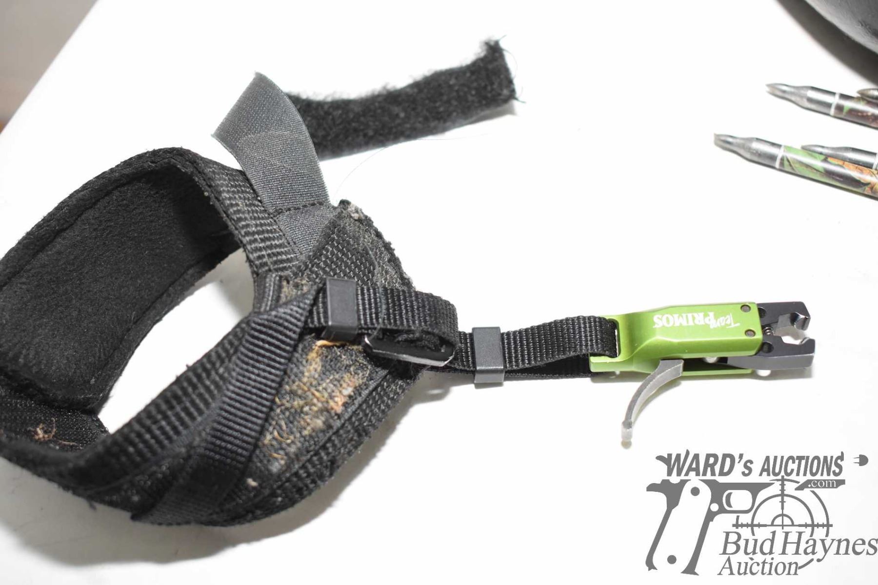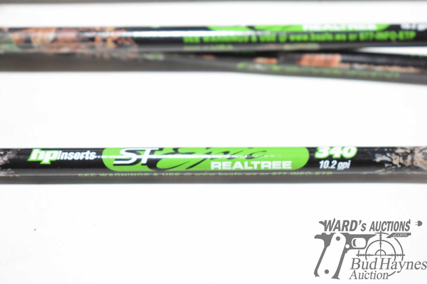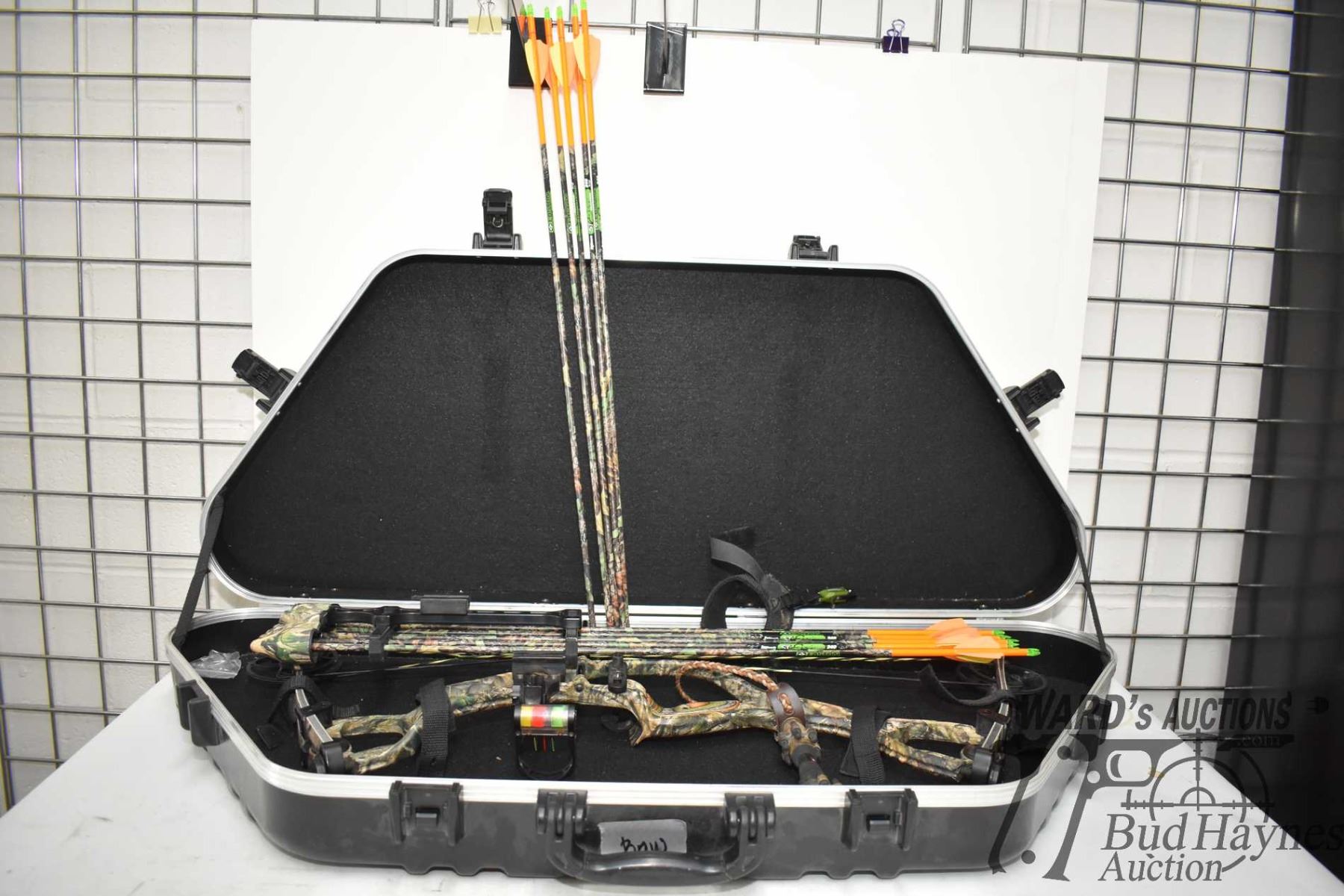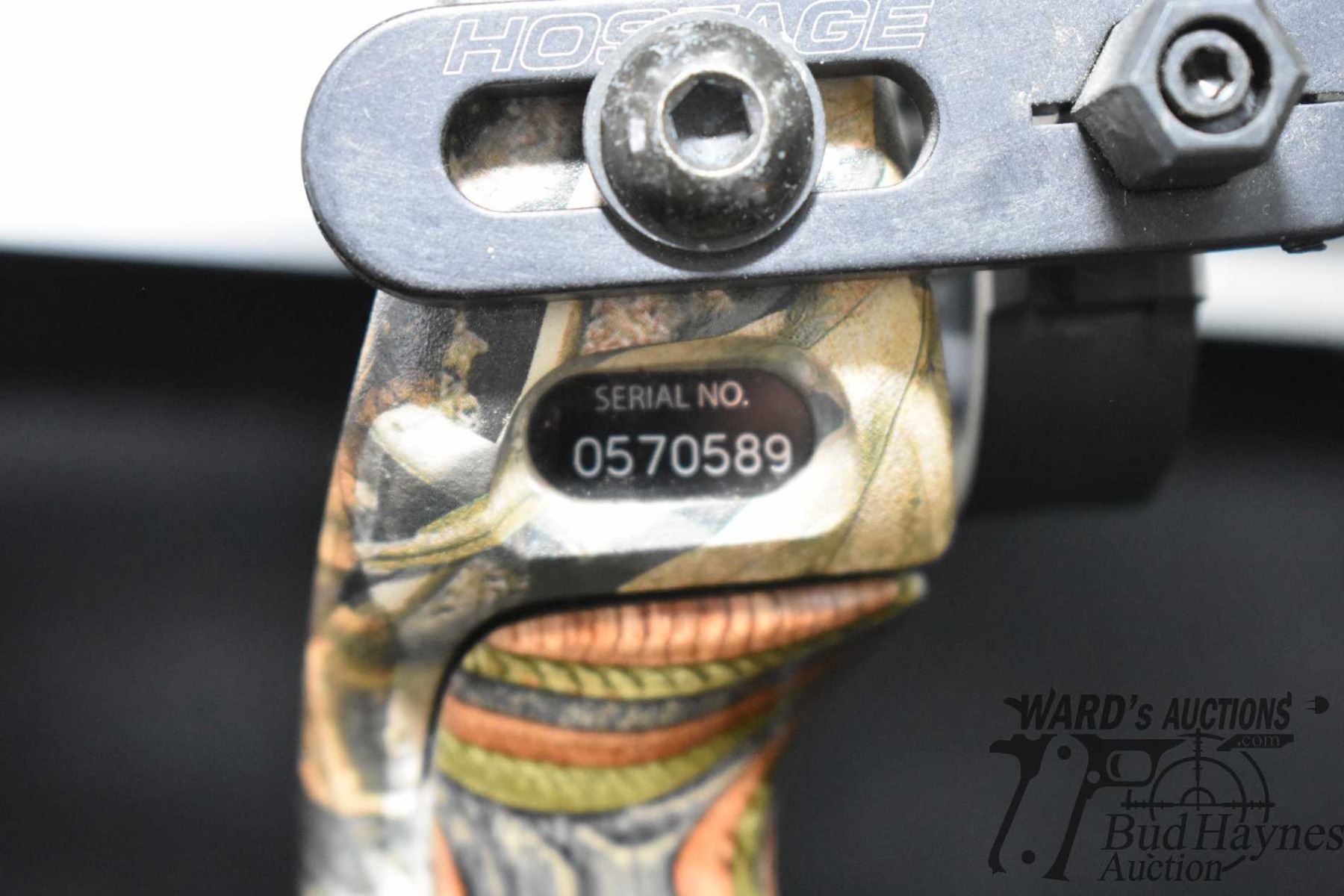 Hoyt LH Alphamax 32 compound bow w/ cobra sight, fuse counter weight, hostage arrow support and Realtree cammo. Comes w/ five hunting and five target arrows, trigger and locking hard case