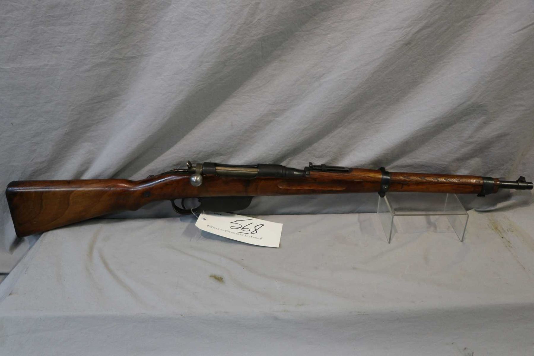 Hungarian Mannlicher Model 1895 Carbine .8 x 56 R Cal Full Wood Military Bolt Action Carbine w/ 20" bbl [ blued finish, barrel sights, receiver marked Budapest, good wood, w/ left side swivels,non - matching numbered wood, matching numbered bolt, various marks and scratches to wood and metal, ] Ser # 1847E