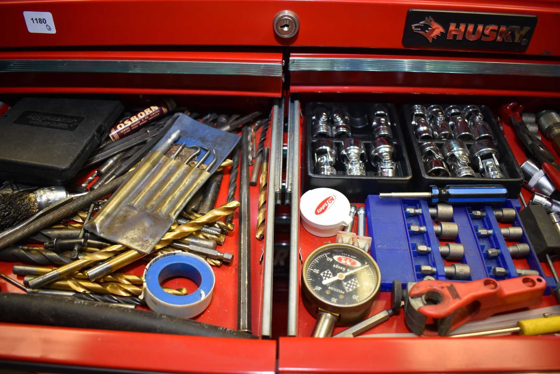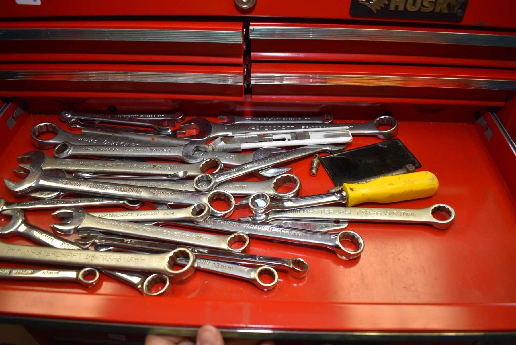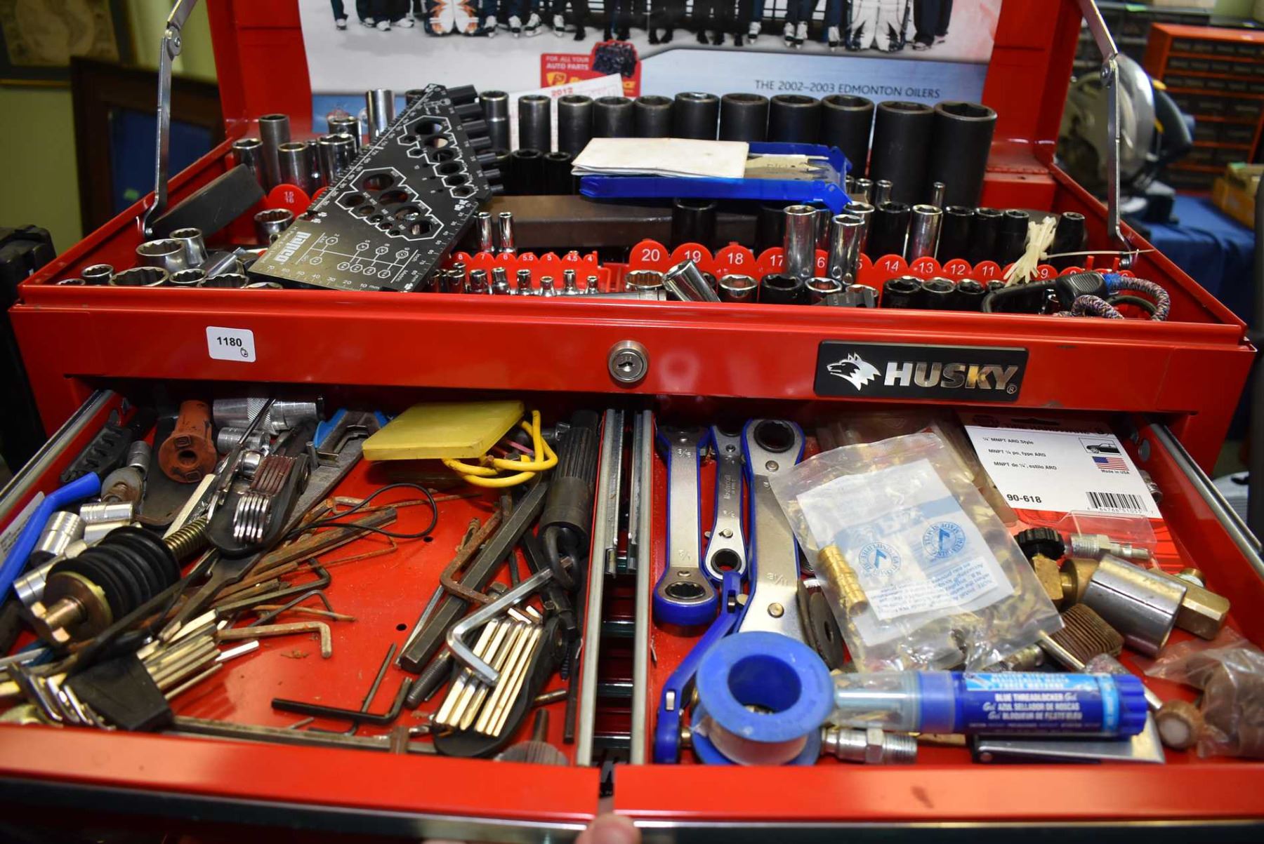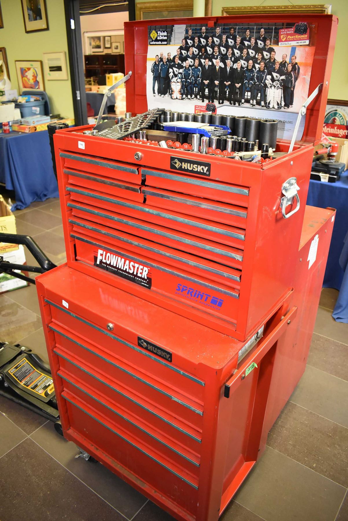 Husky brand mechanics roll box and top box containing a large selection of tools including Mac 1/2" drive deep impact sockets, Power Fist 3/8" drive impact sockets, large selection of other sockets, ranging in size and varied brands, 3/8" drive swivel sockets, metric and imperial wrenches, ratchets, screwdrivers, pullers, Power Fist 1/2" drive torque wrench, brake tools, pliers, multi-metre, Crowfeet wrenches, gauges, pry bars, hammers, rivet gun, tin snips, two 1/2" impact wrenches, Blue Point die grinder, Makita angle grinder etc.