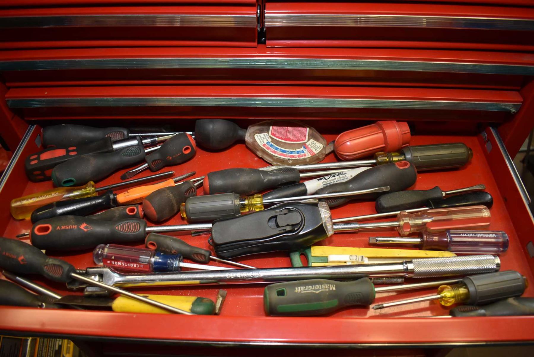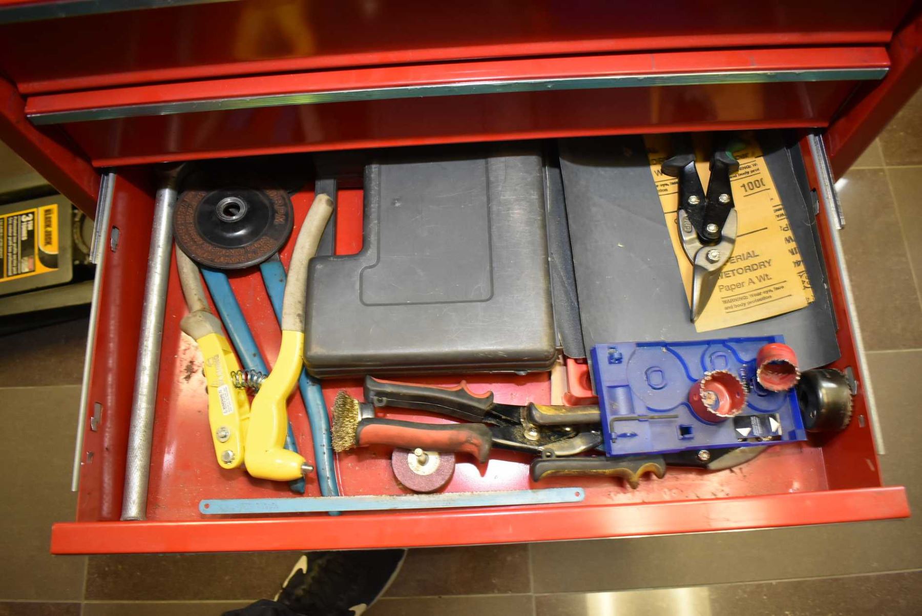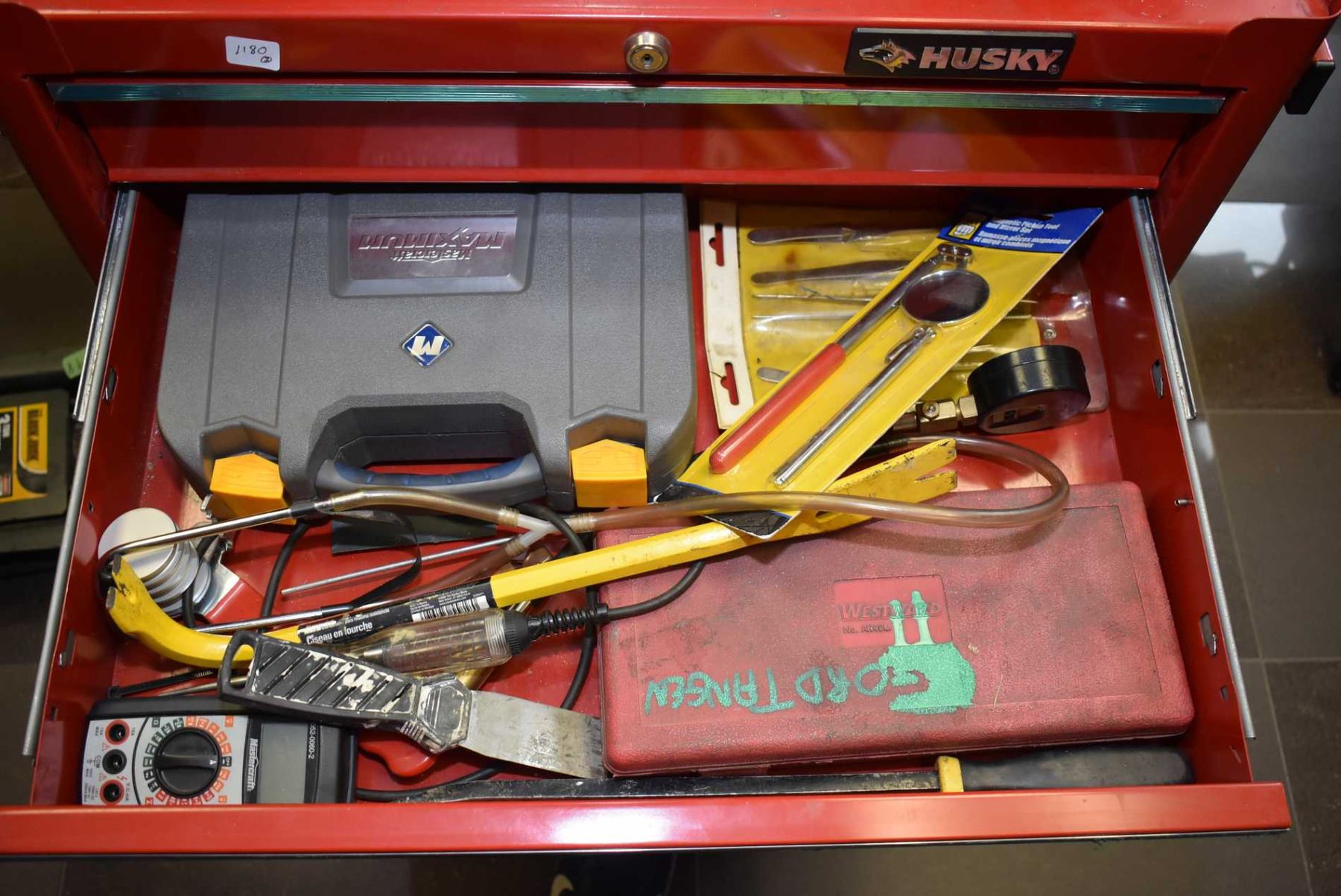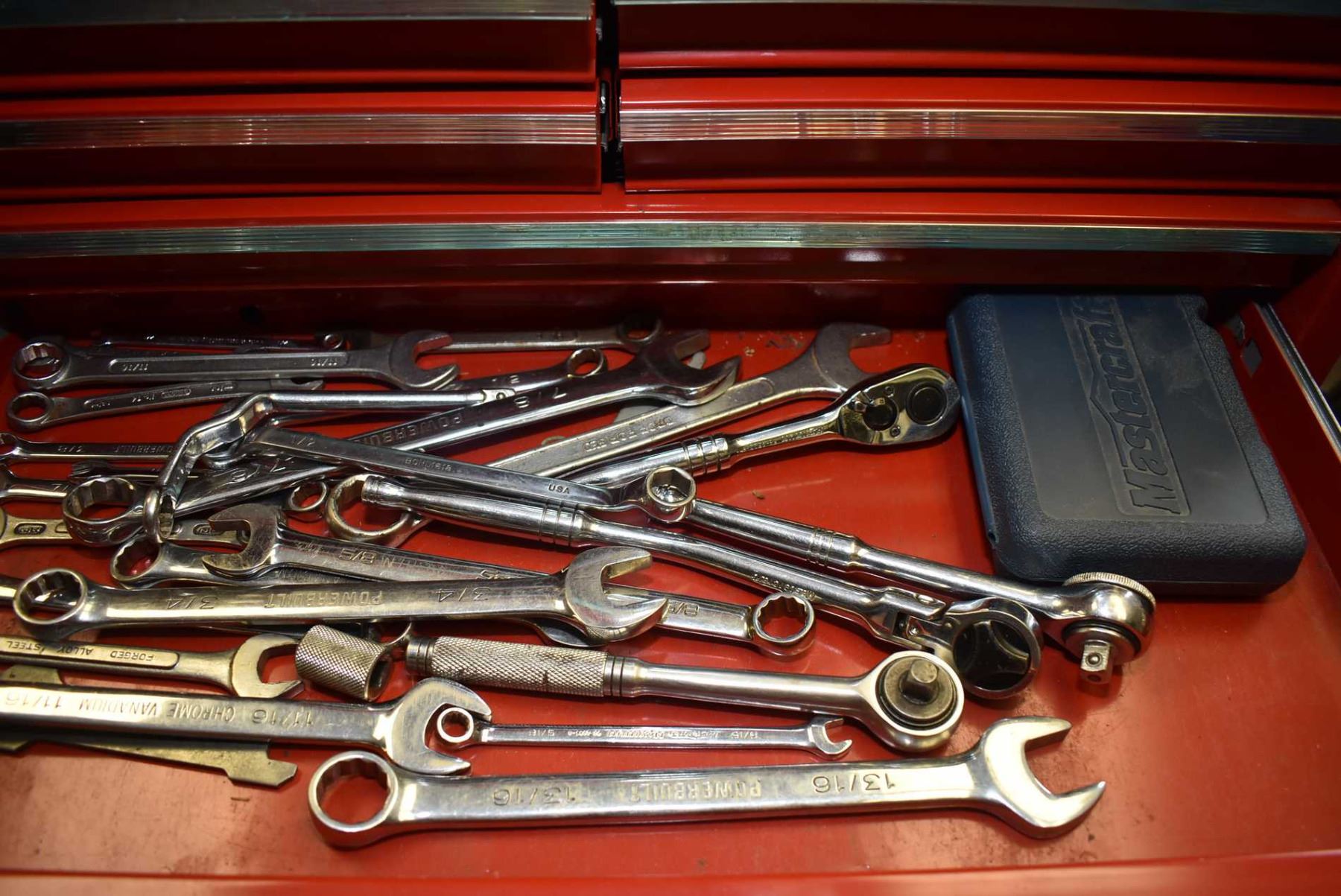 Husky brand mechanics roll box and top box containing a large selection of tools including Mac 1/2" drive deep impact sockets, Power Fist 3/8" drive impact sockets, large selection of other sockets, ranging in size and varied brands, 3/8" drive swivel sockets, metric and imperial wrenches, ratchets, screwdrivers, pullers, Power Fist 1/2" drive torque wrench, brake tools, pliers, multi-metre, Crowfeet wrenches, gauges, pry bars, hammers, rivet gun, tin snips, two 1/2" impact wrenches, Blue Point die grinder, Makita angle grinder etc.