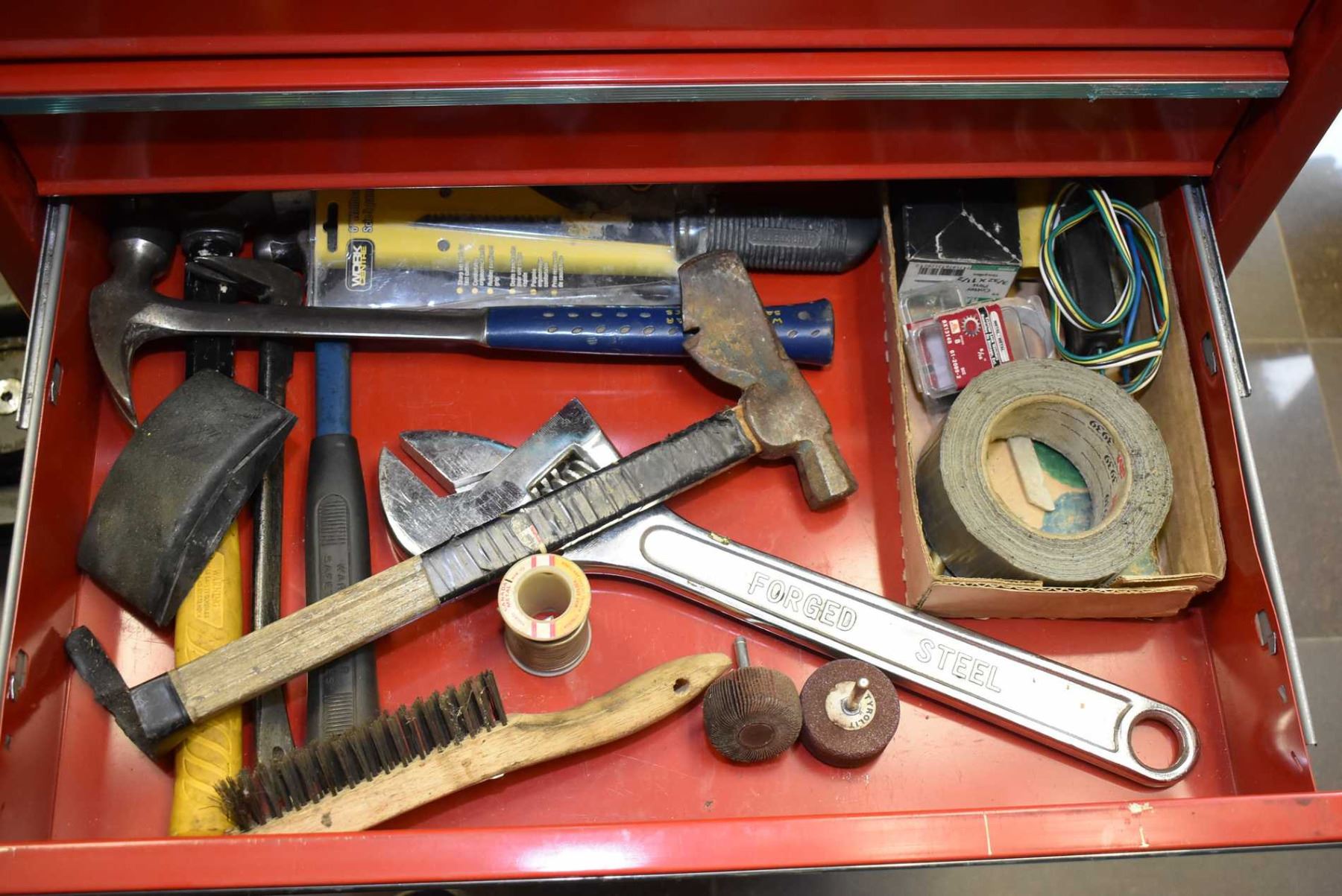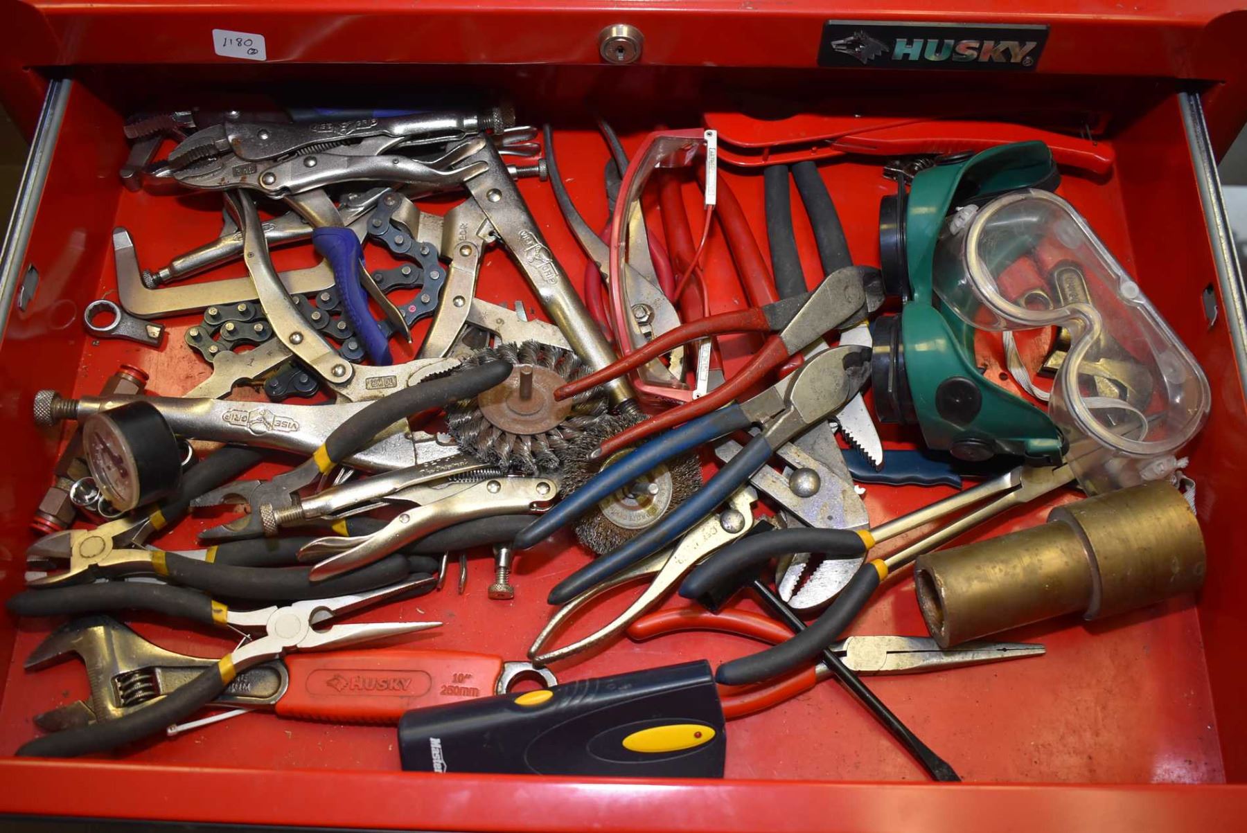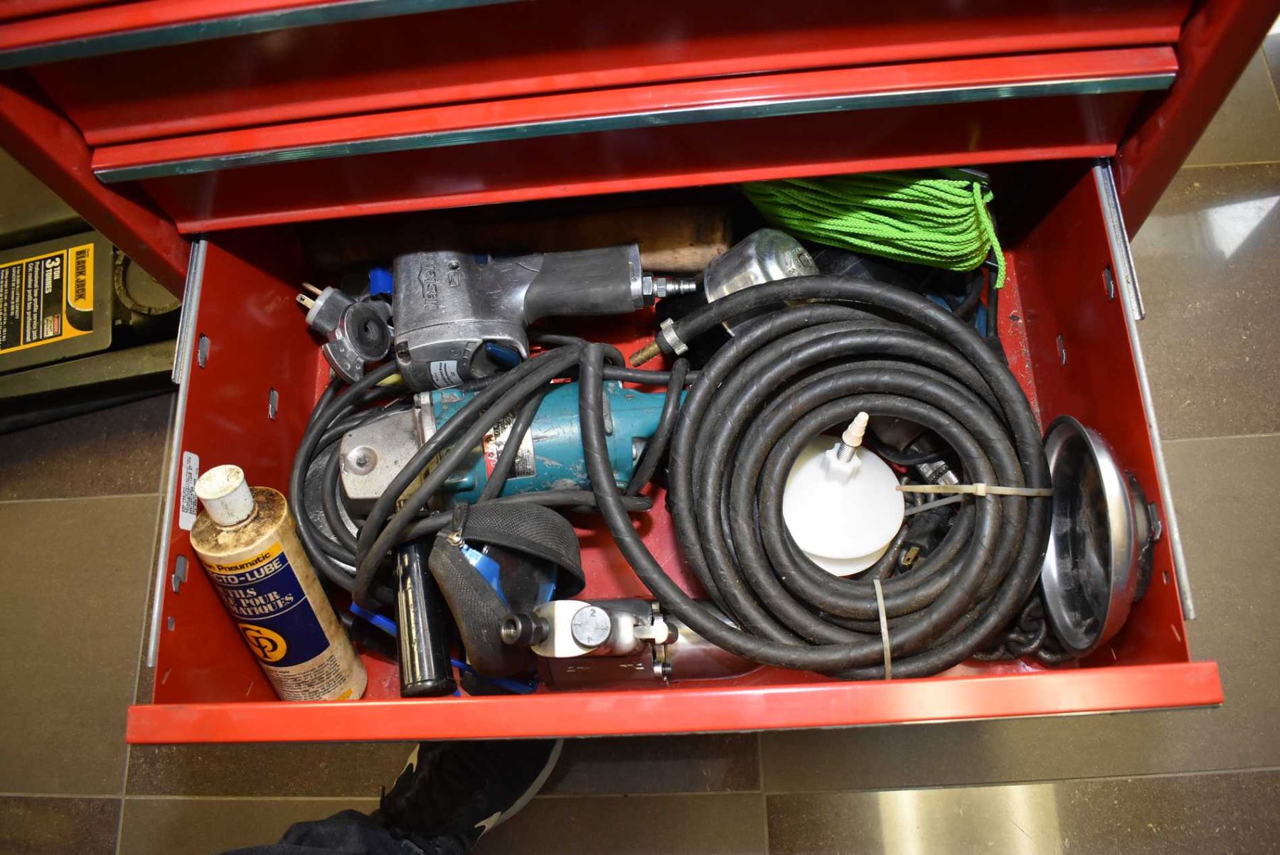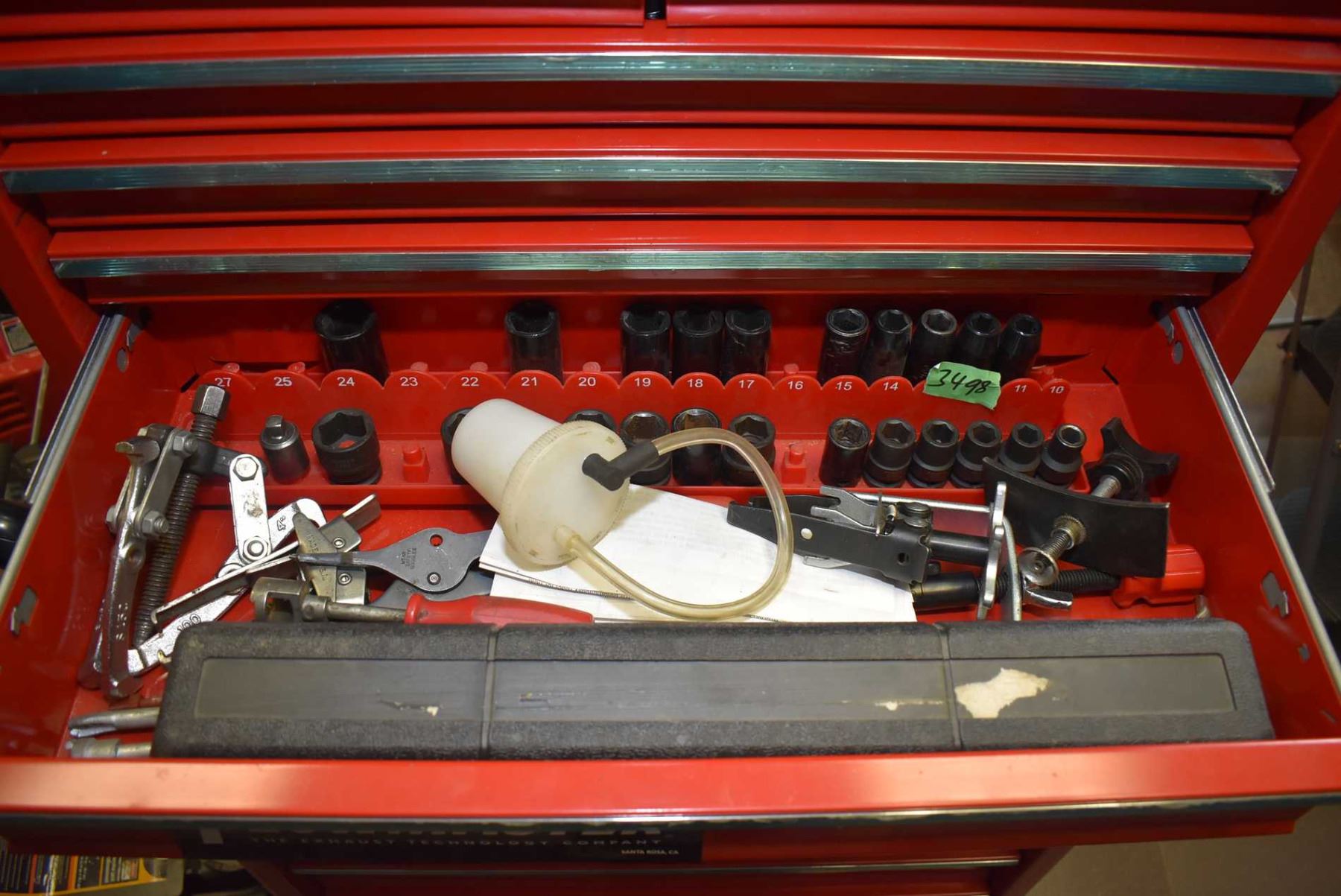 Husky brand mechanics roll box and top box containing a large selection of tools including Mac 1/2" drive deep impact sockets, Power Fist 3/8" drive impact sockets, large selection of other sockets, ranging in size and varied brands, 3/8" drive swivel sockets, metric and imperial wrenches, ratchets, screwdrivers, pullers, Power Fist 1/2" drive torque wrench, brake tools, pliers, multi-metre, Crowfeet wrenches, gauges, pry bars, hammers, rivet gun, tin snips, two 1/2" impact wrenches, Blue Point die grinder, Makita angle grinder etc.