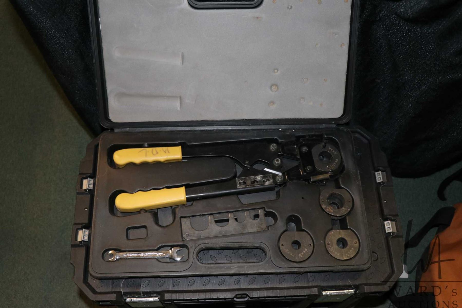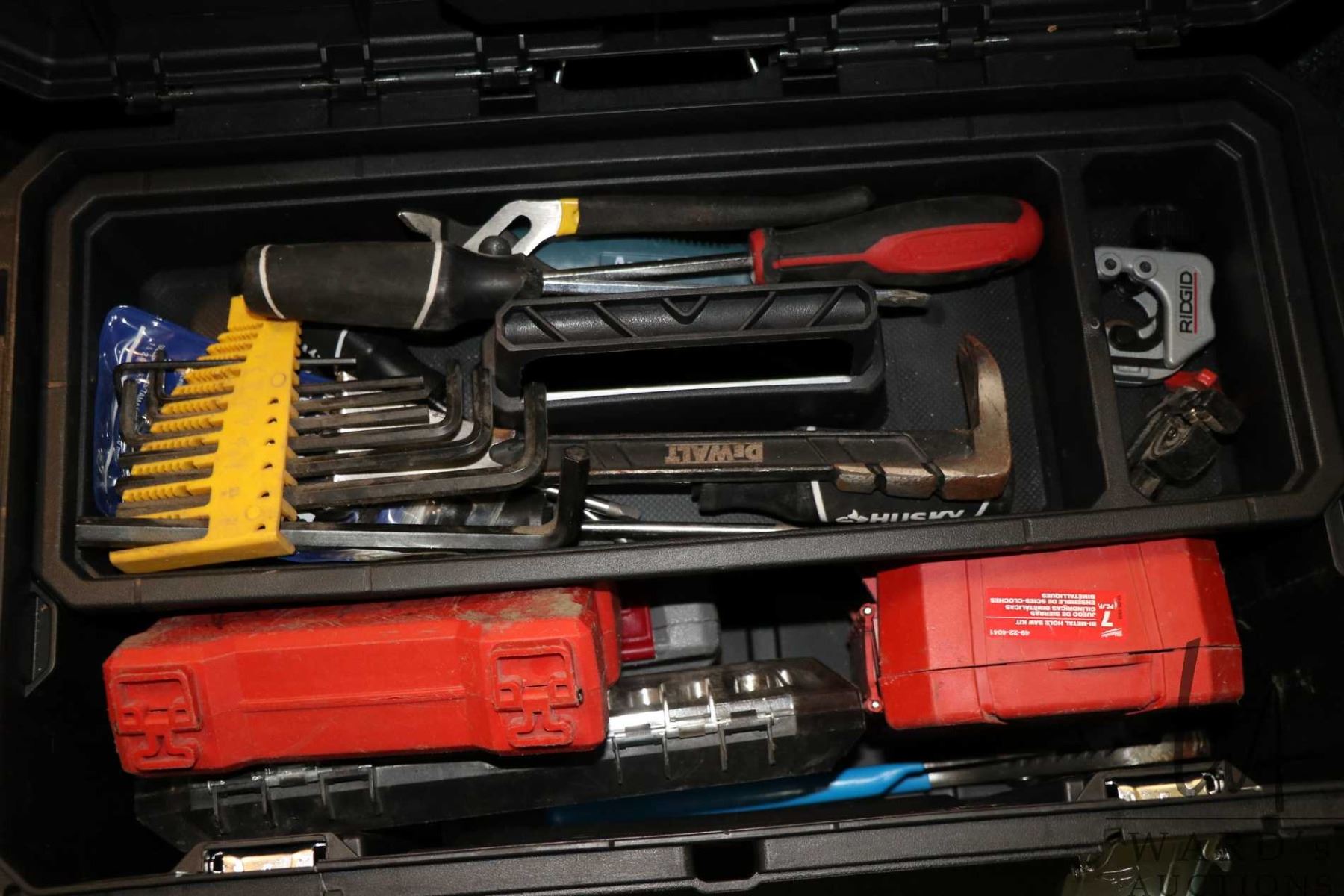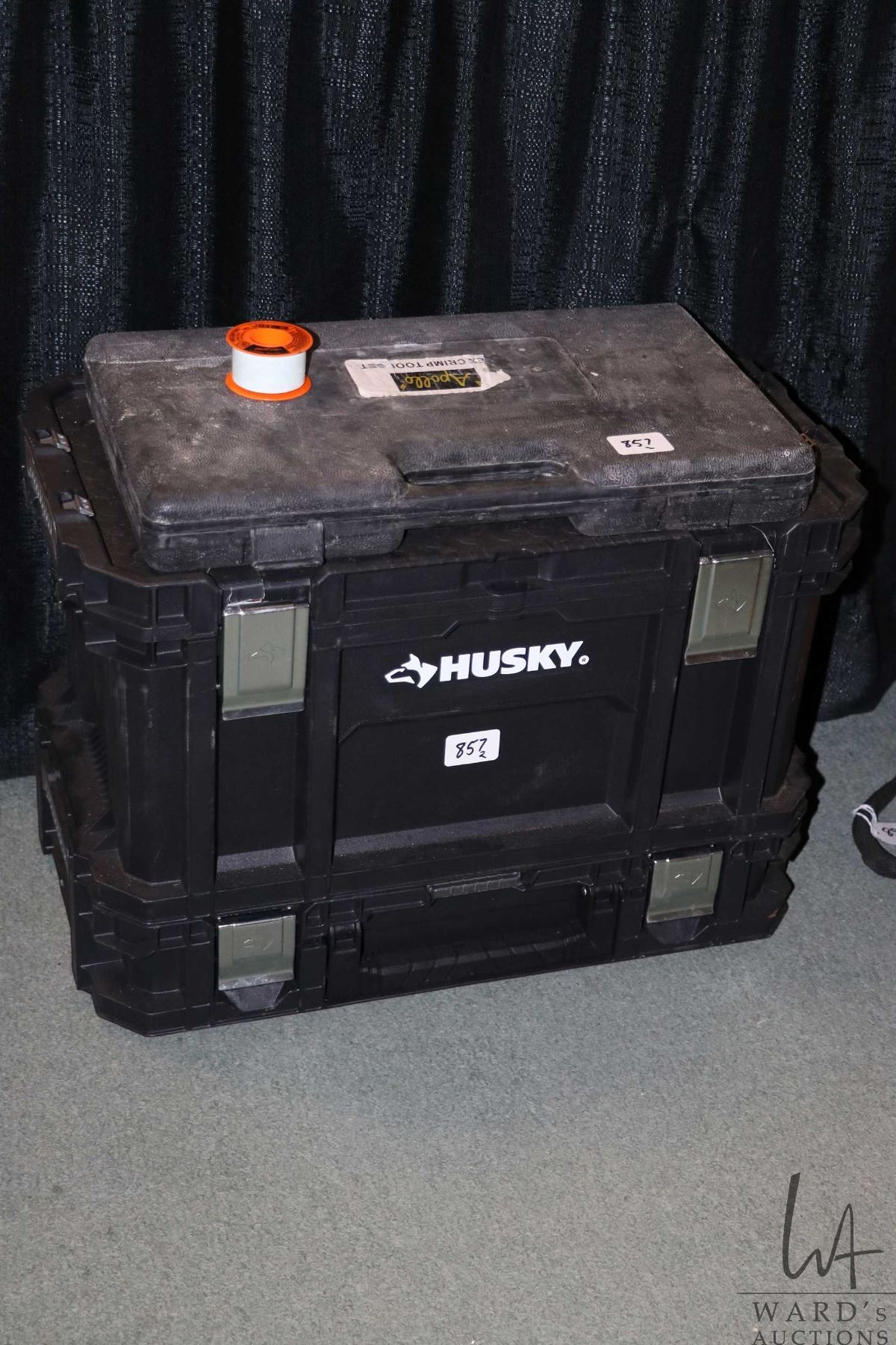 Husky tool box and contents including socket set, propane torch, hacksaw, hole saw kit, bits, drill bits, screwdrivers, Allen wrenches, pliers, pipe cutters and a Pex 3/8"- 1" crib tool set