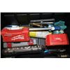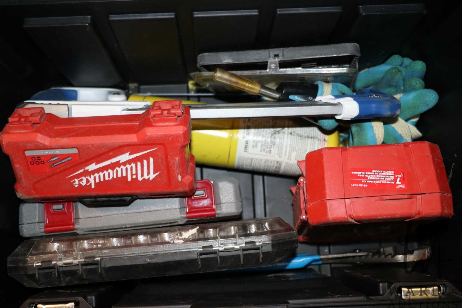 Husky tool box and contents including socket set, propane torch, hacksaw, hole saw kit, bits, drill