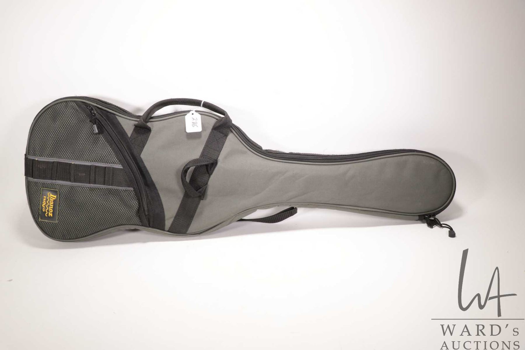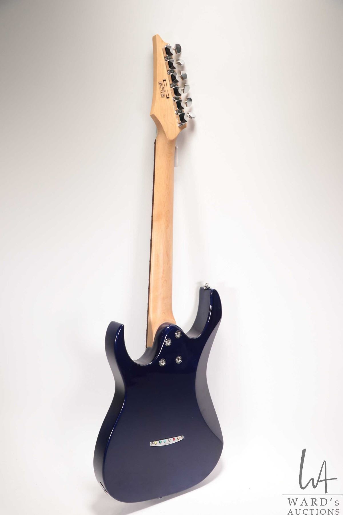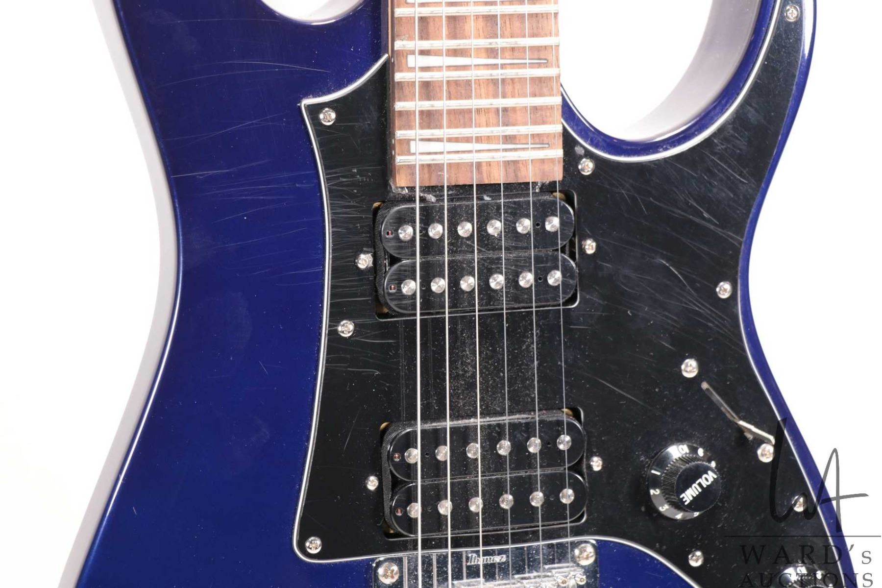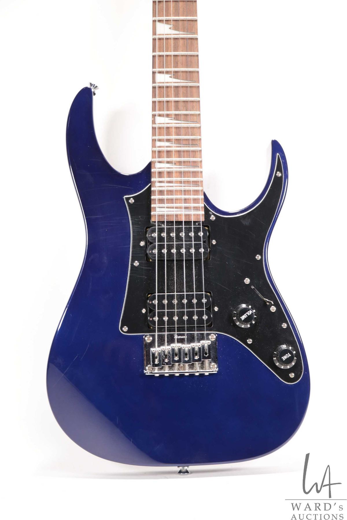 Ibanez Mikro guitar. Navy blue with double Humbuckers pearloid shark inlaid neck. Includes Ibanez Mikro sling back soft case