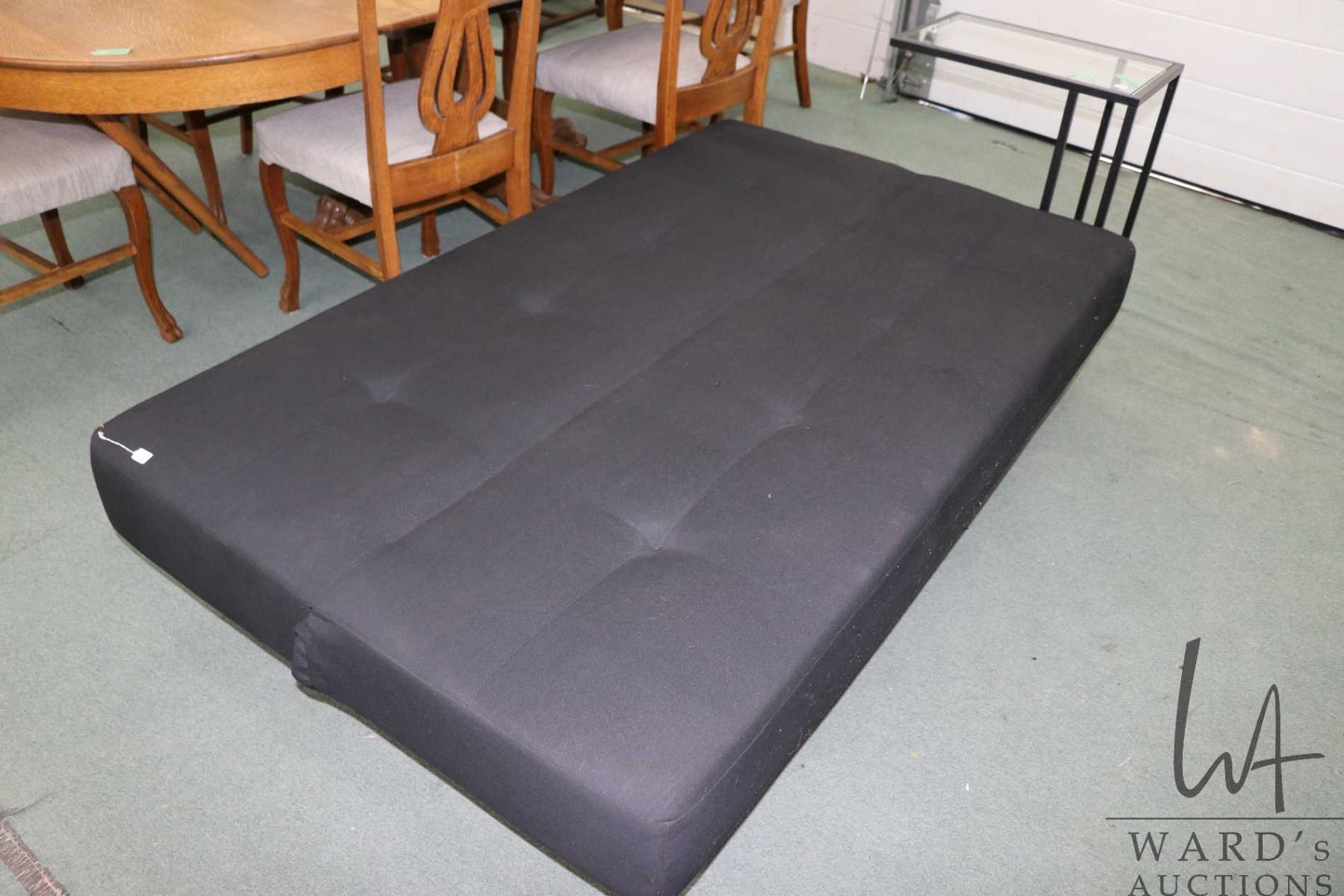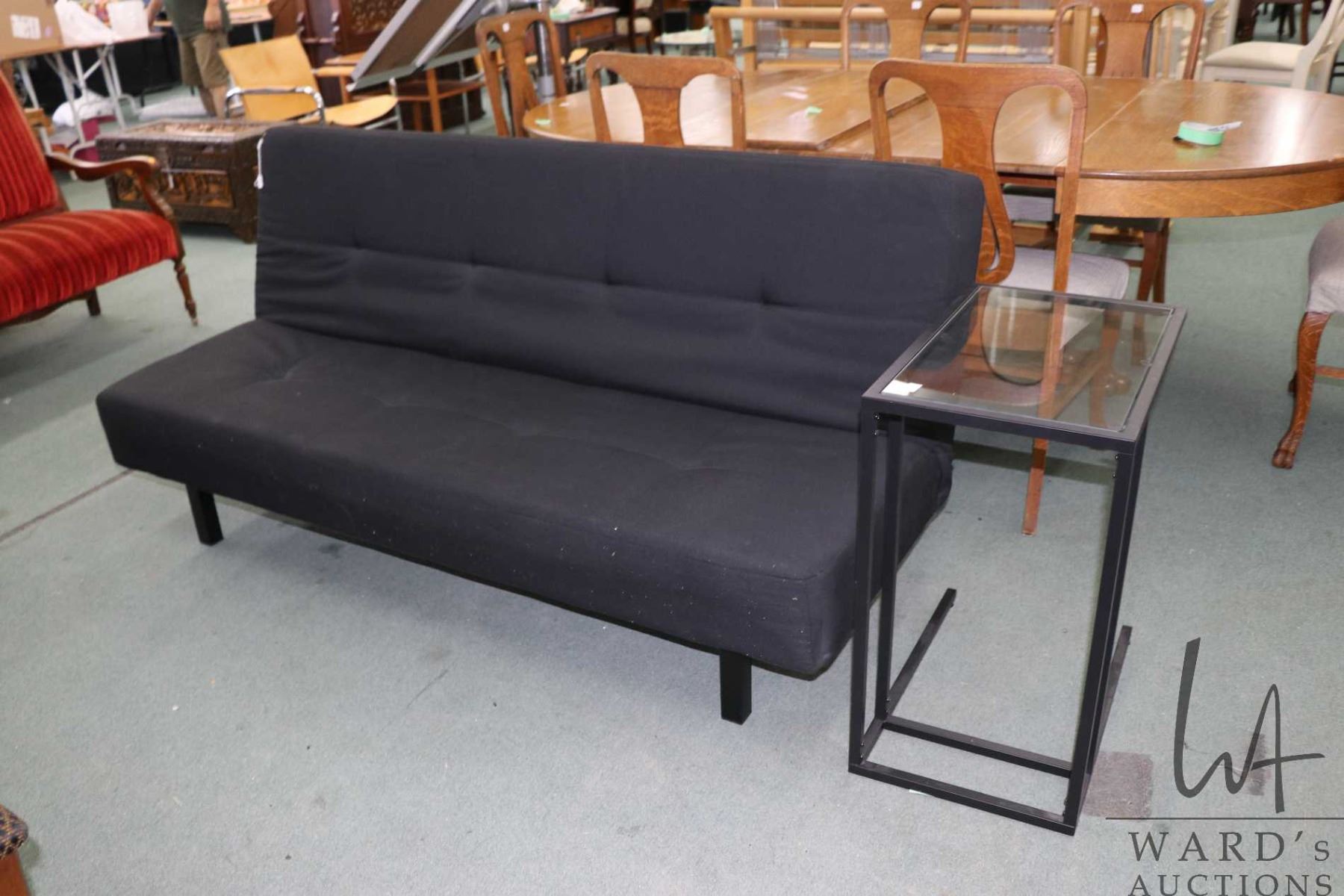 Ikea fold down futon style sofa bed and a metal and glass side table