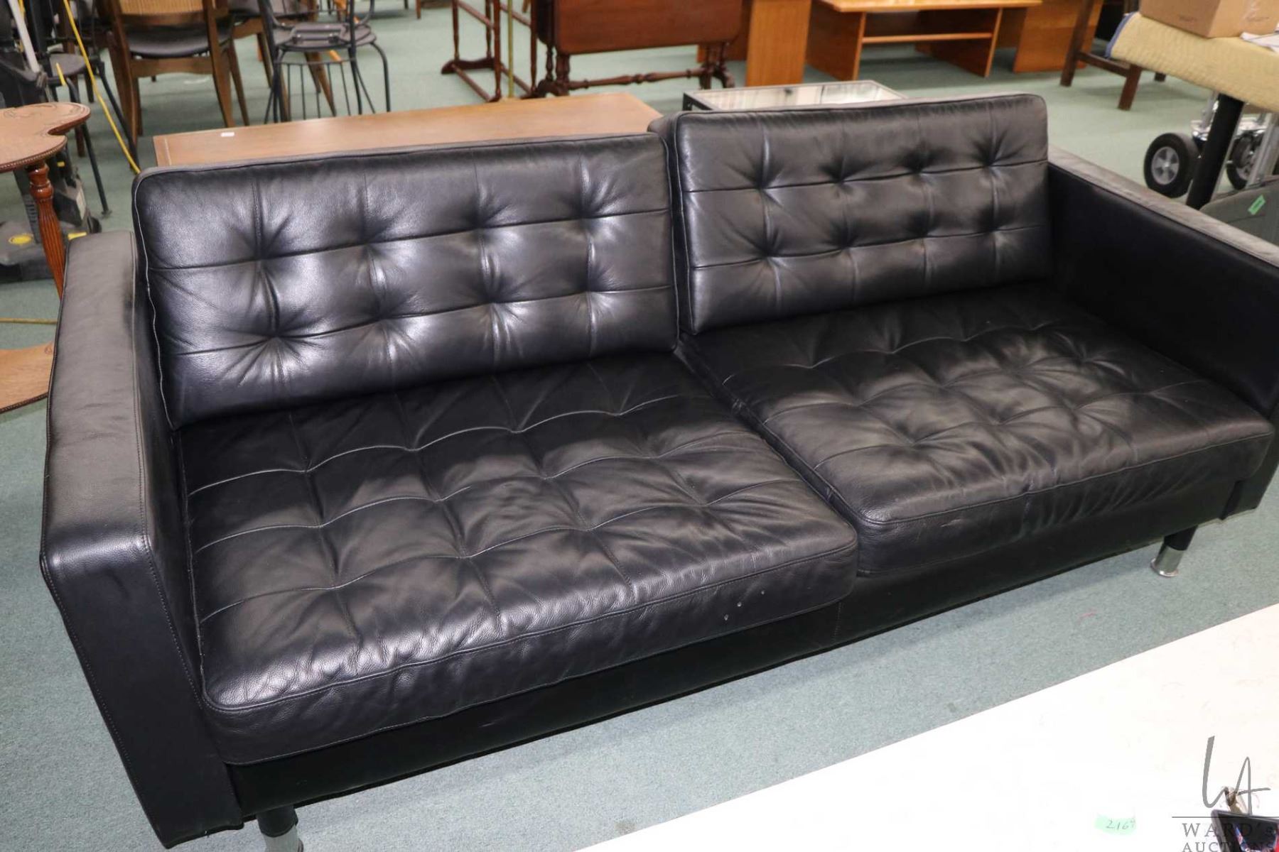 Ikea full sized "Landskrona" black leather like retro style sofa plus a glass and metal end table