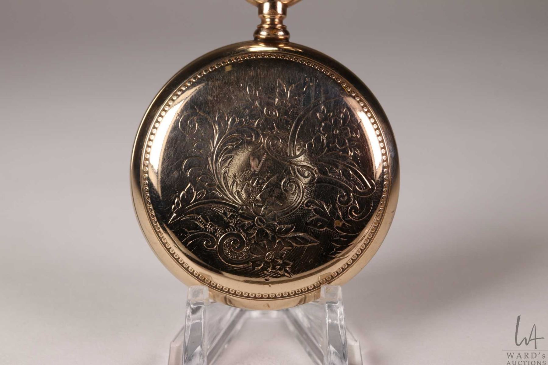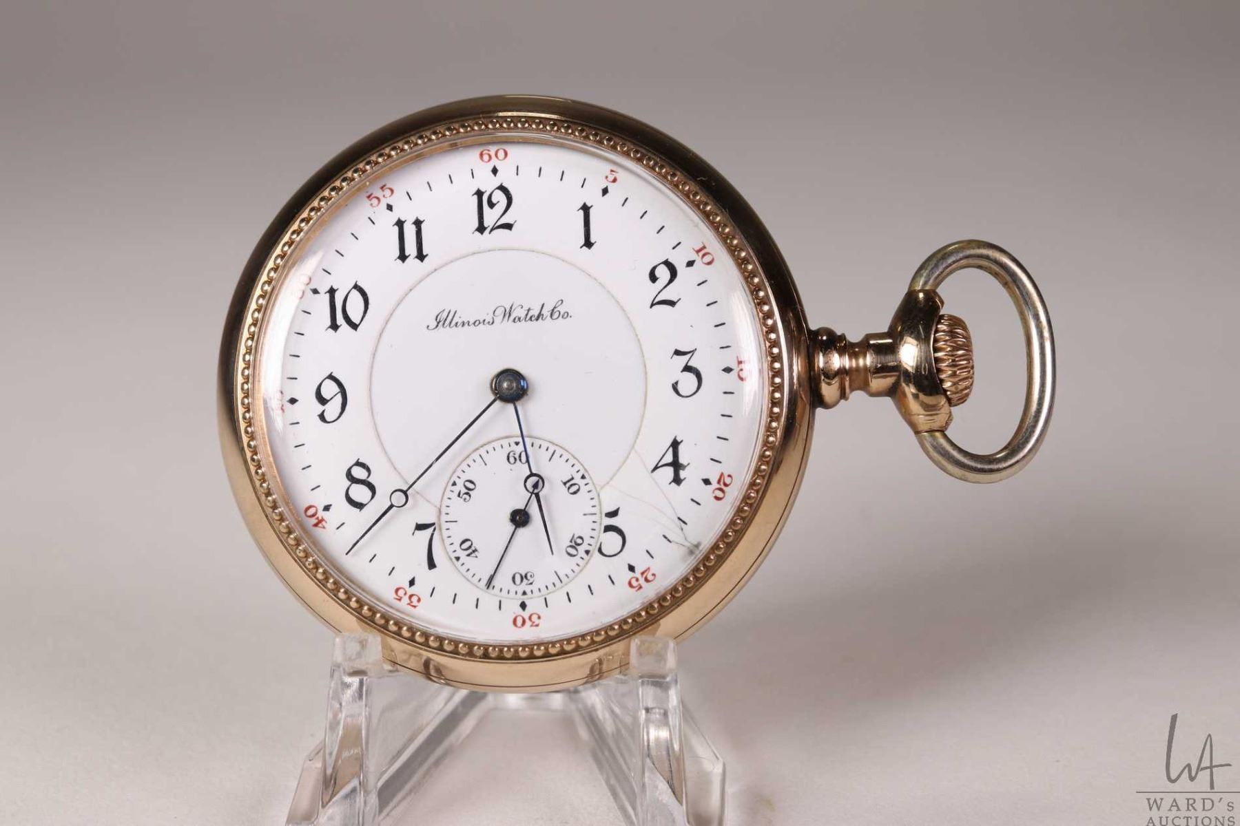 Illinois Watch Co. size 16S, 17 jewel, model 4 pocket circa 1907, serial 1991084, grade 185, with white enamel dial Arabic numbering with second sweep, note crack to enamel in front of 4, in 14kt filled gold 25 year engraved case, working at time of cataloguing