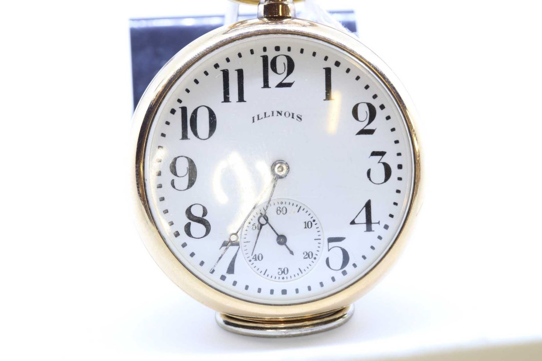 Illinois size 16 pocket watch, 17 jewel grade 604, serial #2630475, circa 1914, 3/4 split nickel plate, stem wind and set movement signed Illinois Watch Co. Springfield U.S.A. Single sunk white porcelain dial with bold black Arabic numbers and blued matching moon style hands. comes in gold filled S.W. C. Co. case with ornate leaf and floral engraving with blank shield on back cover. Working at time of cataloguing