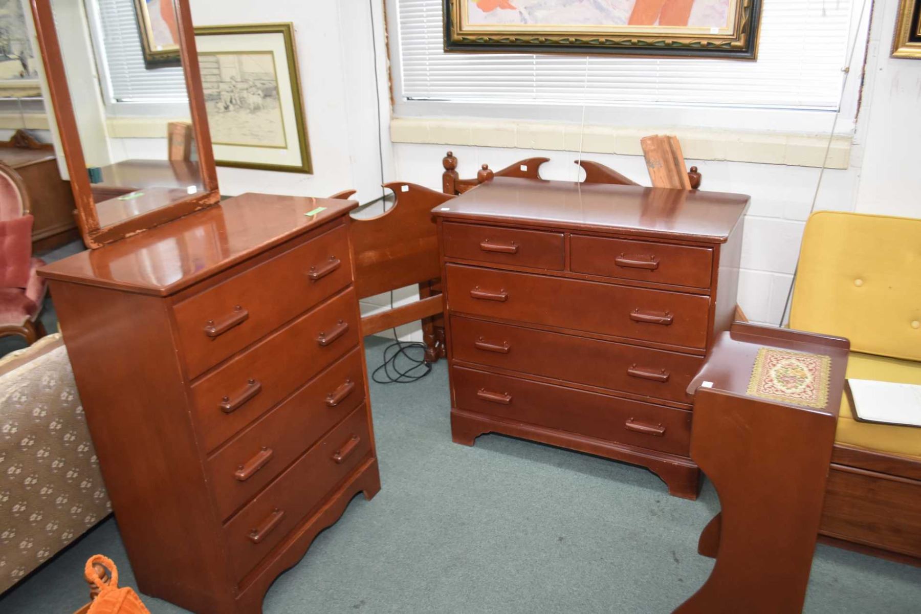 Imperial maple bedroom suite including four drawer mirrored highboy, five drawer lowboy, single drawer night table and two single beds