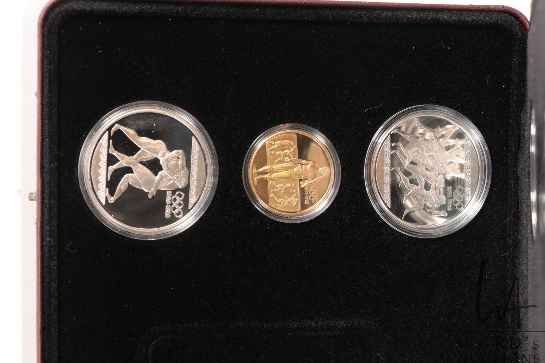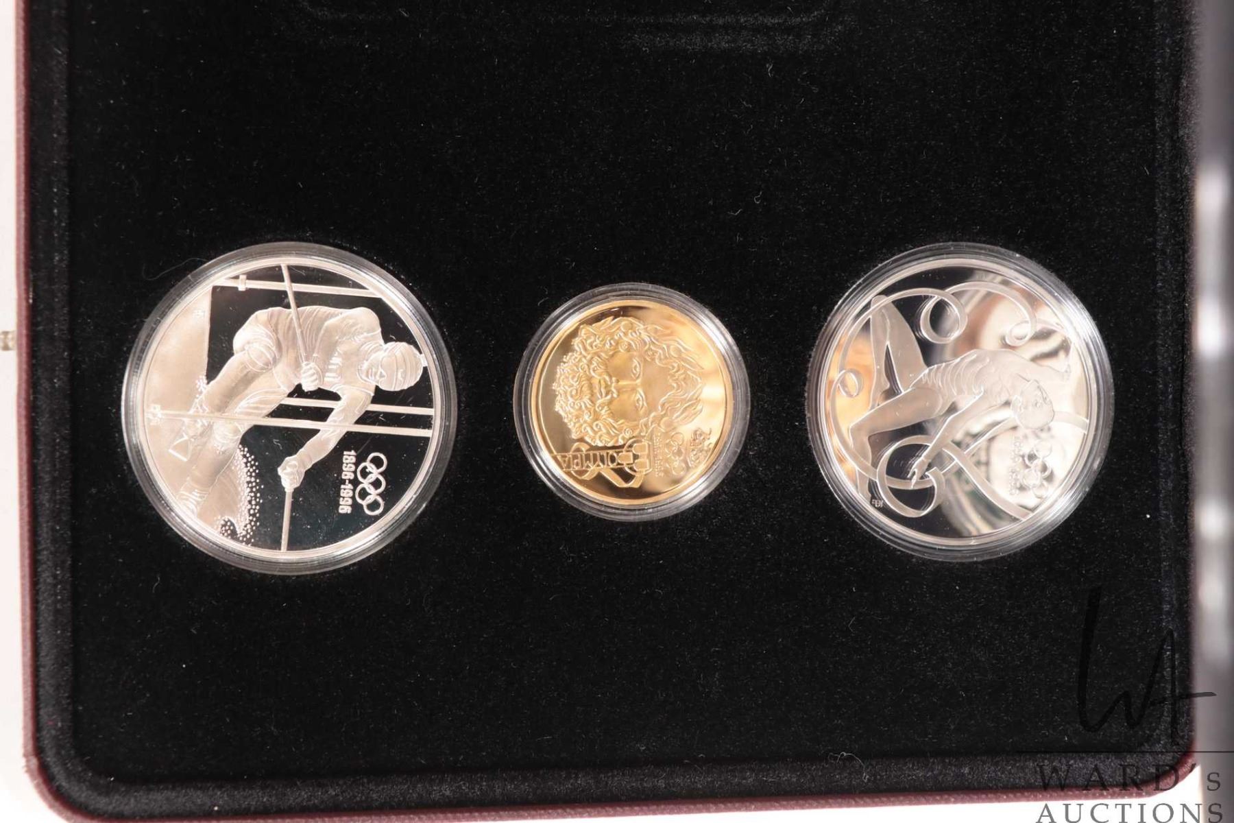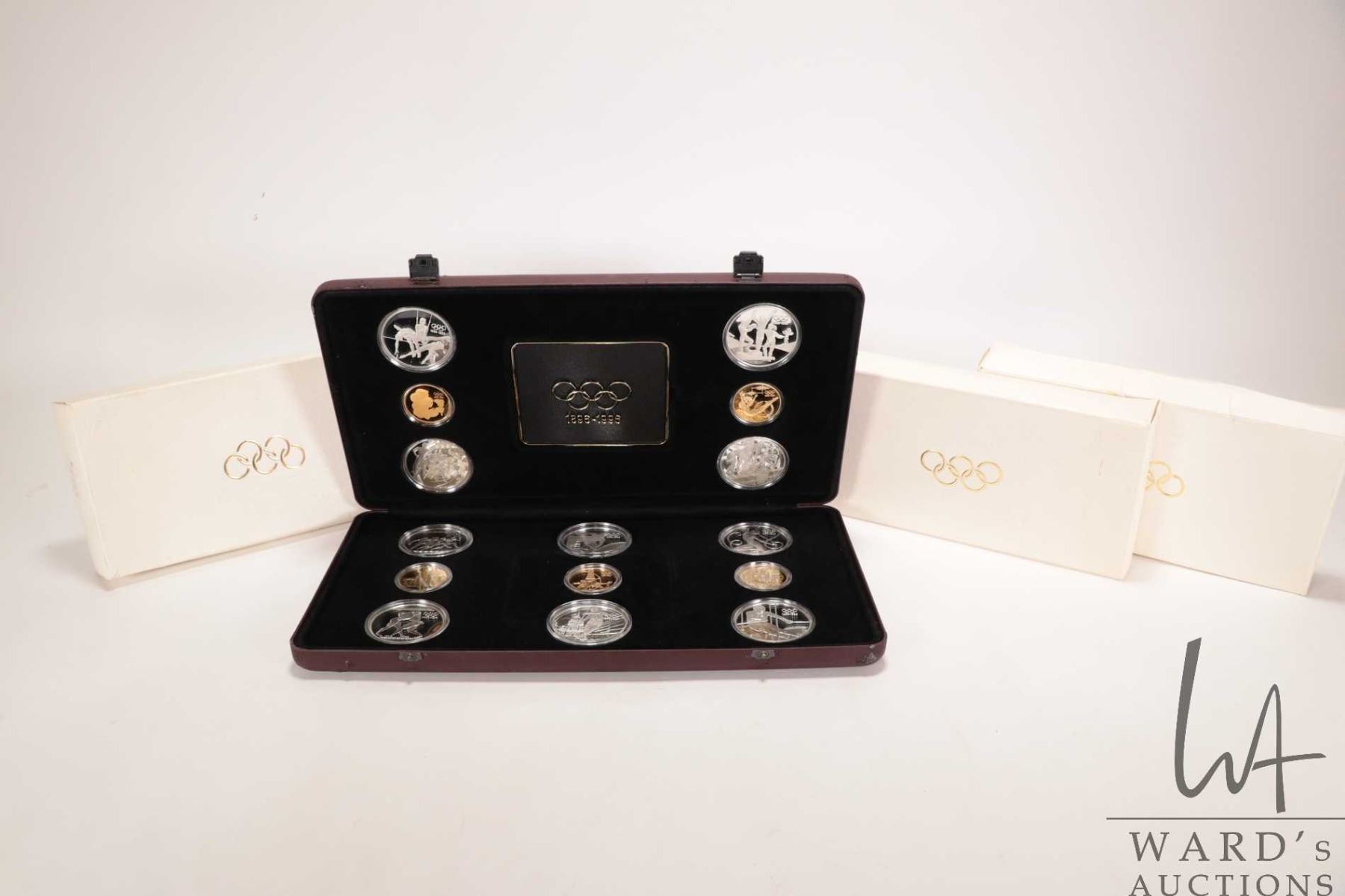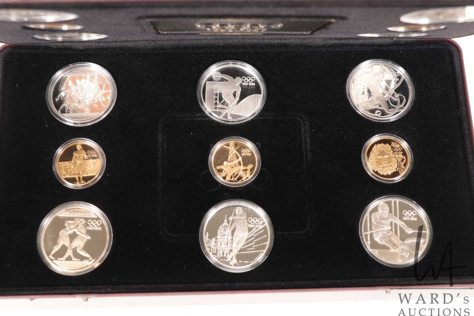 Impressive 1896-1996, 100th anniversary of the Olympic games, fifteen coin gold and silver set, issued by multiple countries including Royal Canadian Mint and contained five .22 kt gold proof coins and ten .925 sterling silver coins, each depicting athletes in various sports, housed in leather wrapped fitted case