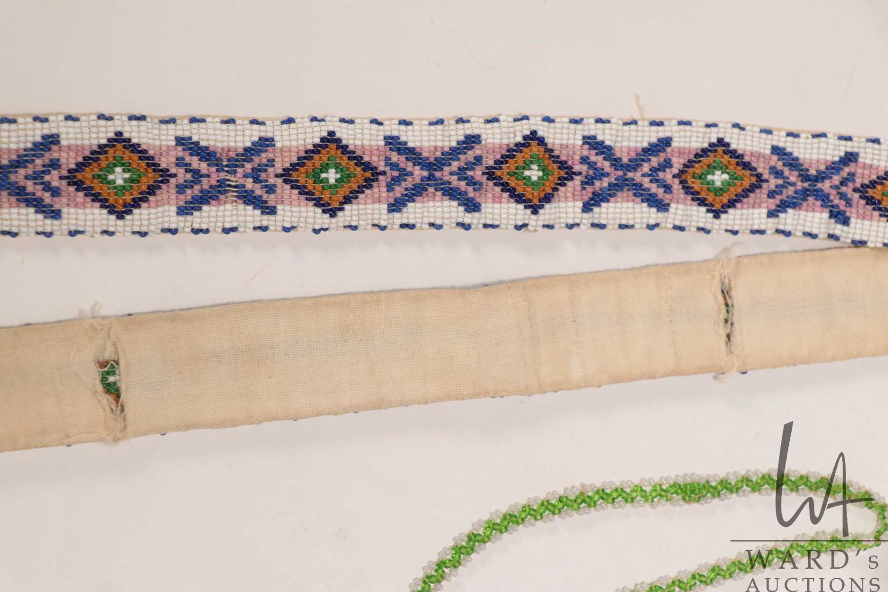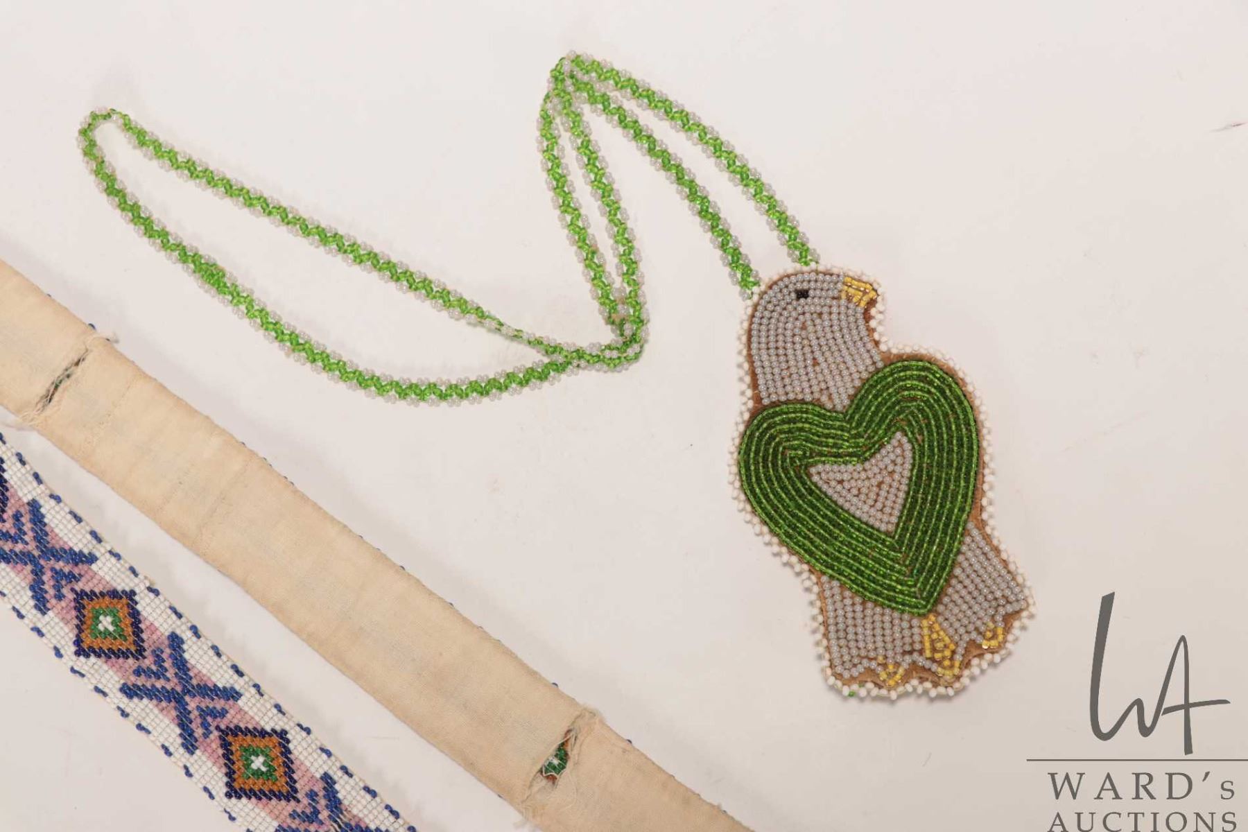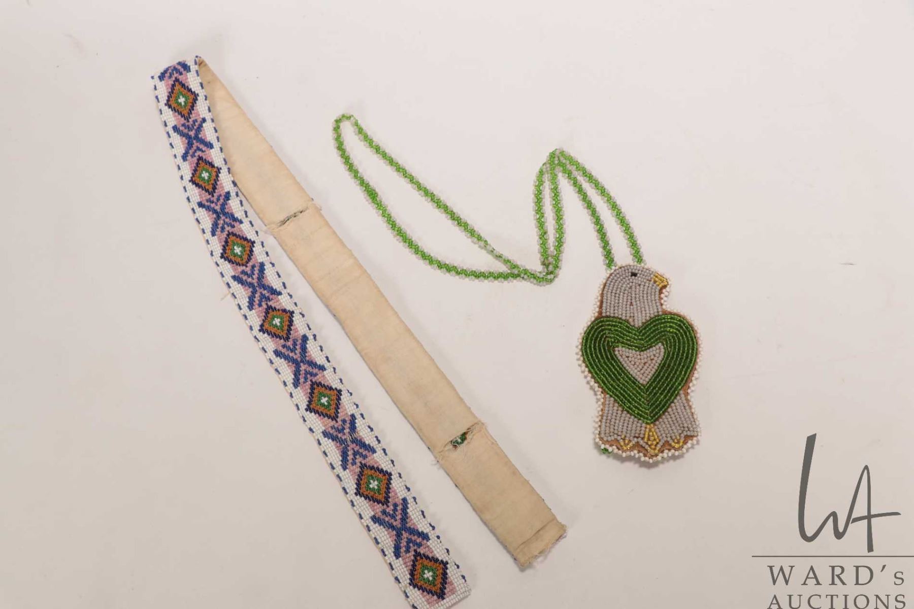 Indigenous beaded sash, 30" in length and a beaded bird necklace19"