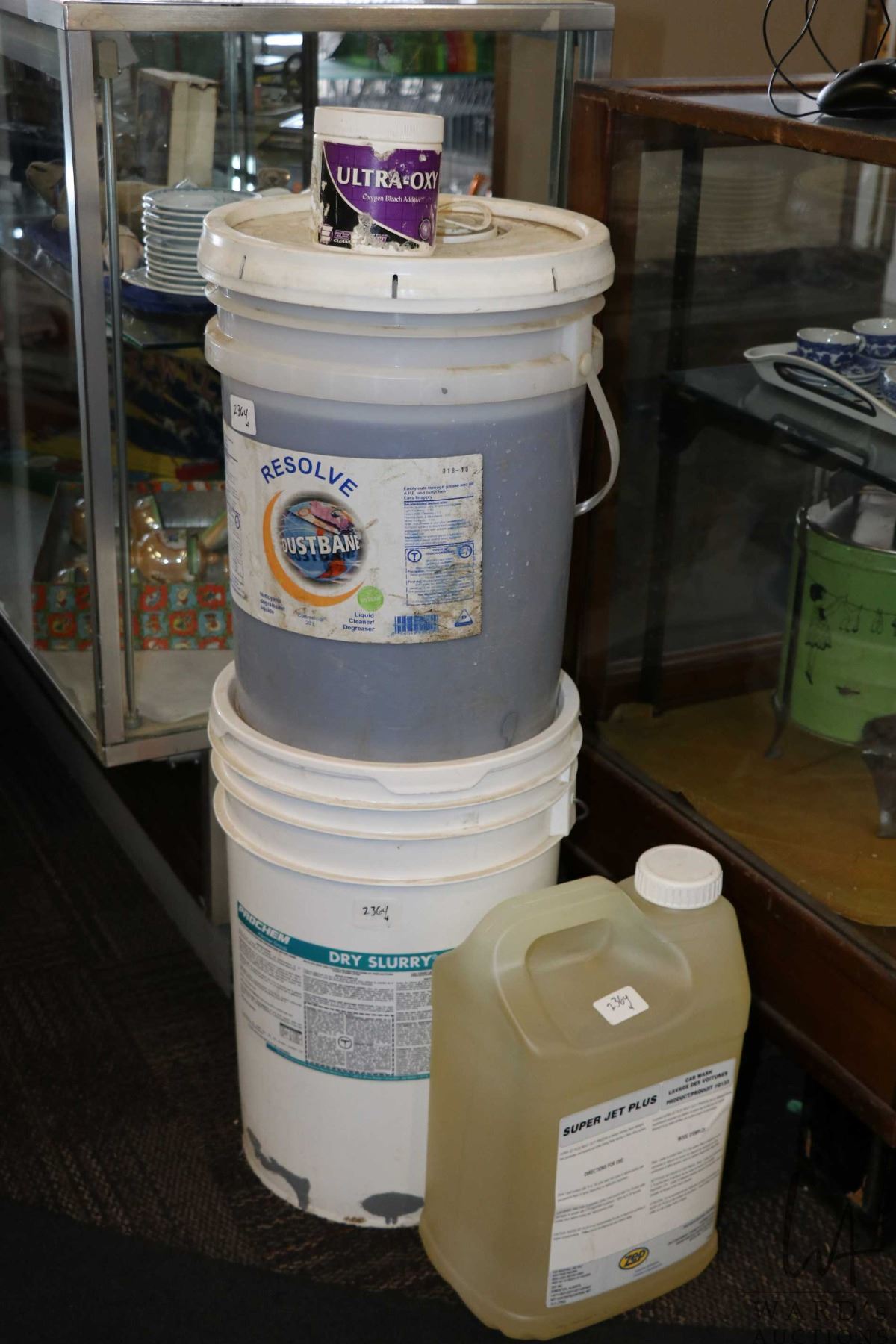 Industrial cleaners including 20 ltr pail of Resolve, 20 ltr pail of Pro-Chem dry slurry, 10 ltr jug
