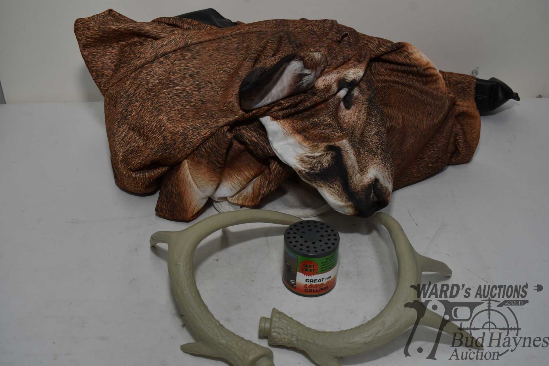 Inflatable buck decoy, two packs of filled dressing bags and a Primos The Great Big Can animal call.