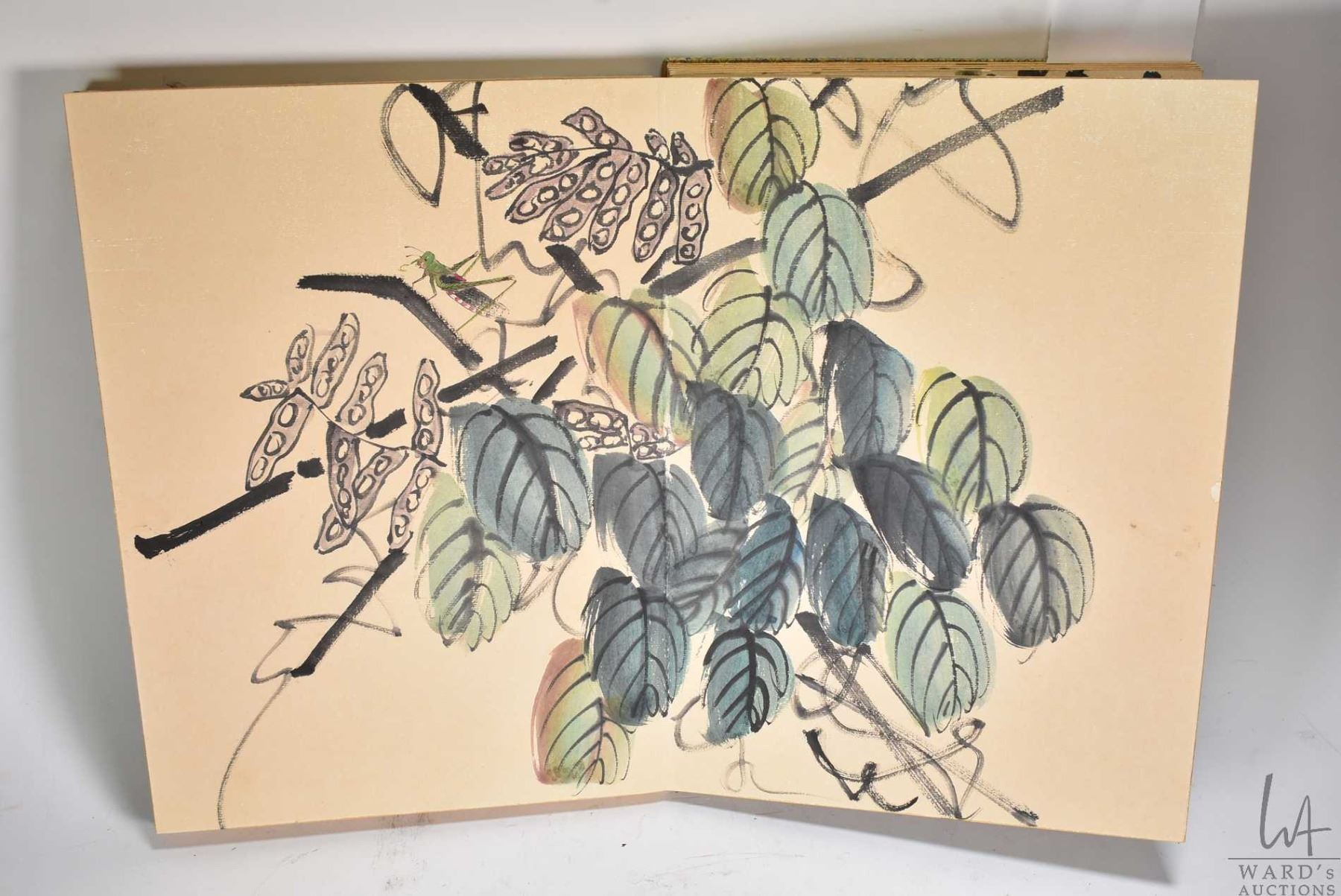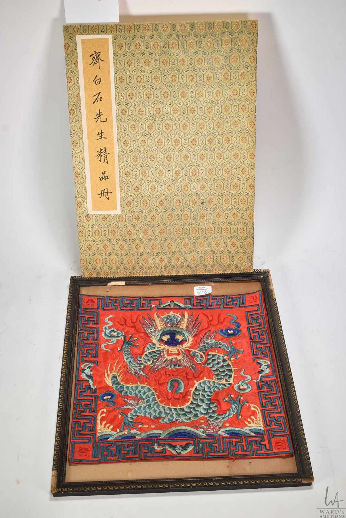 Ink and watercolour album signed Tschi Pai-schi, purportedly early 20th century and a embroidered dragon mounted in a frame
