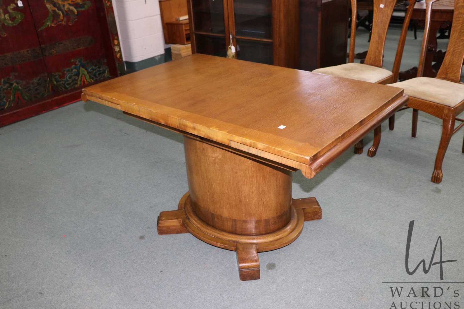 Interesting English oak, draw leaf dining table with large barrel pedestal 30" X 48" plus two 12" leaves