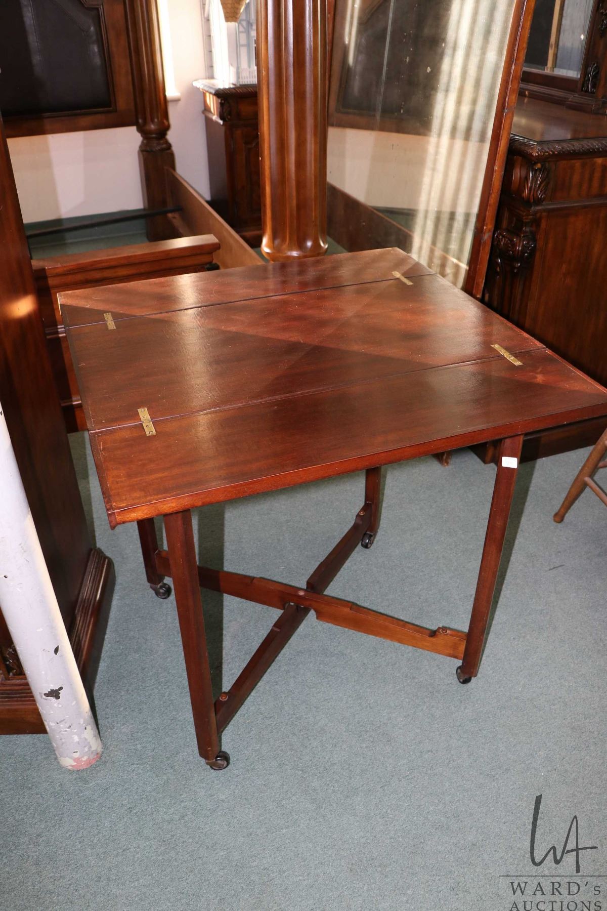 Interesting antique mahogany occasional tea table, 30" X 15" when folding, with spreading base to accommodate fold over leaves, making a 30" square table
