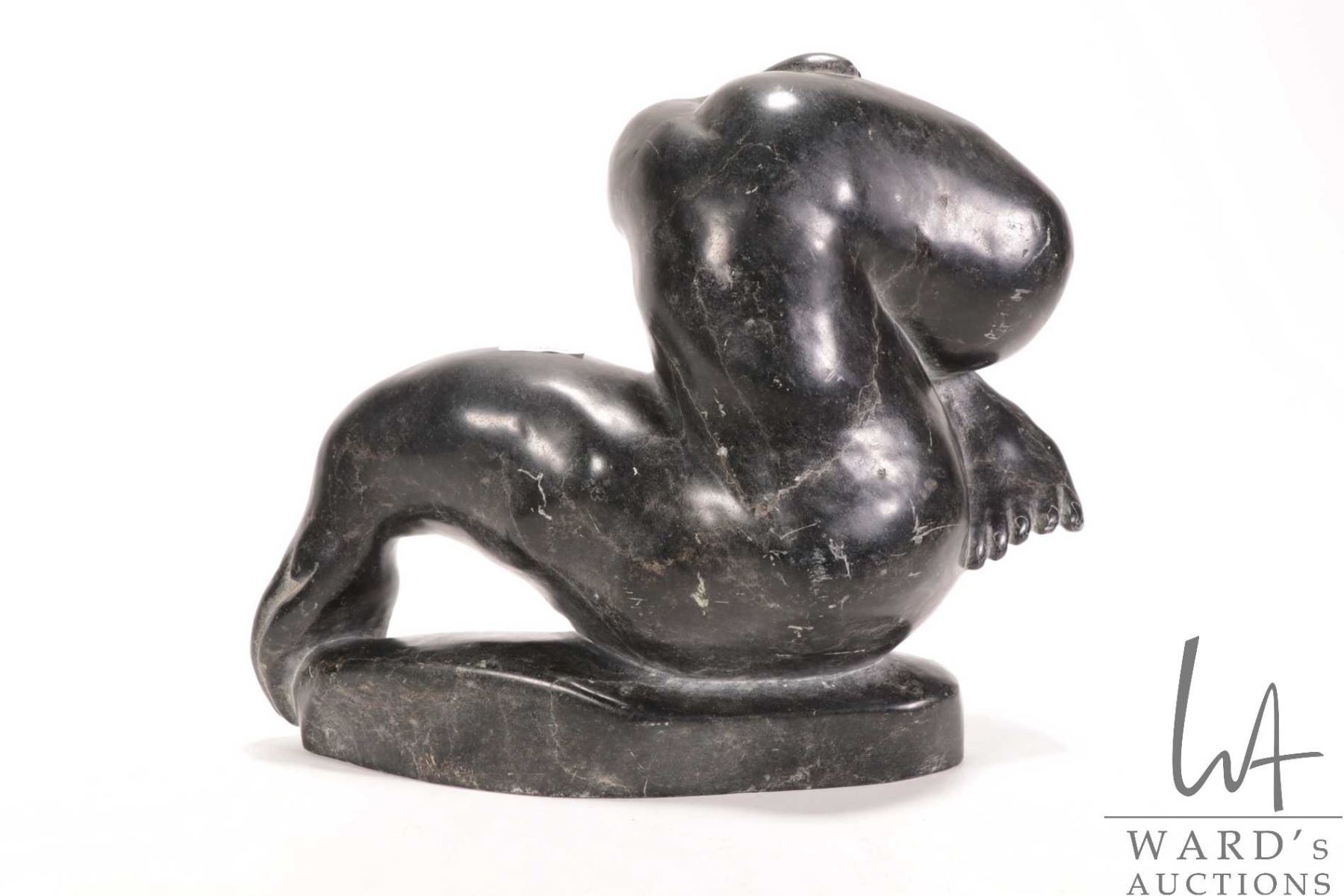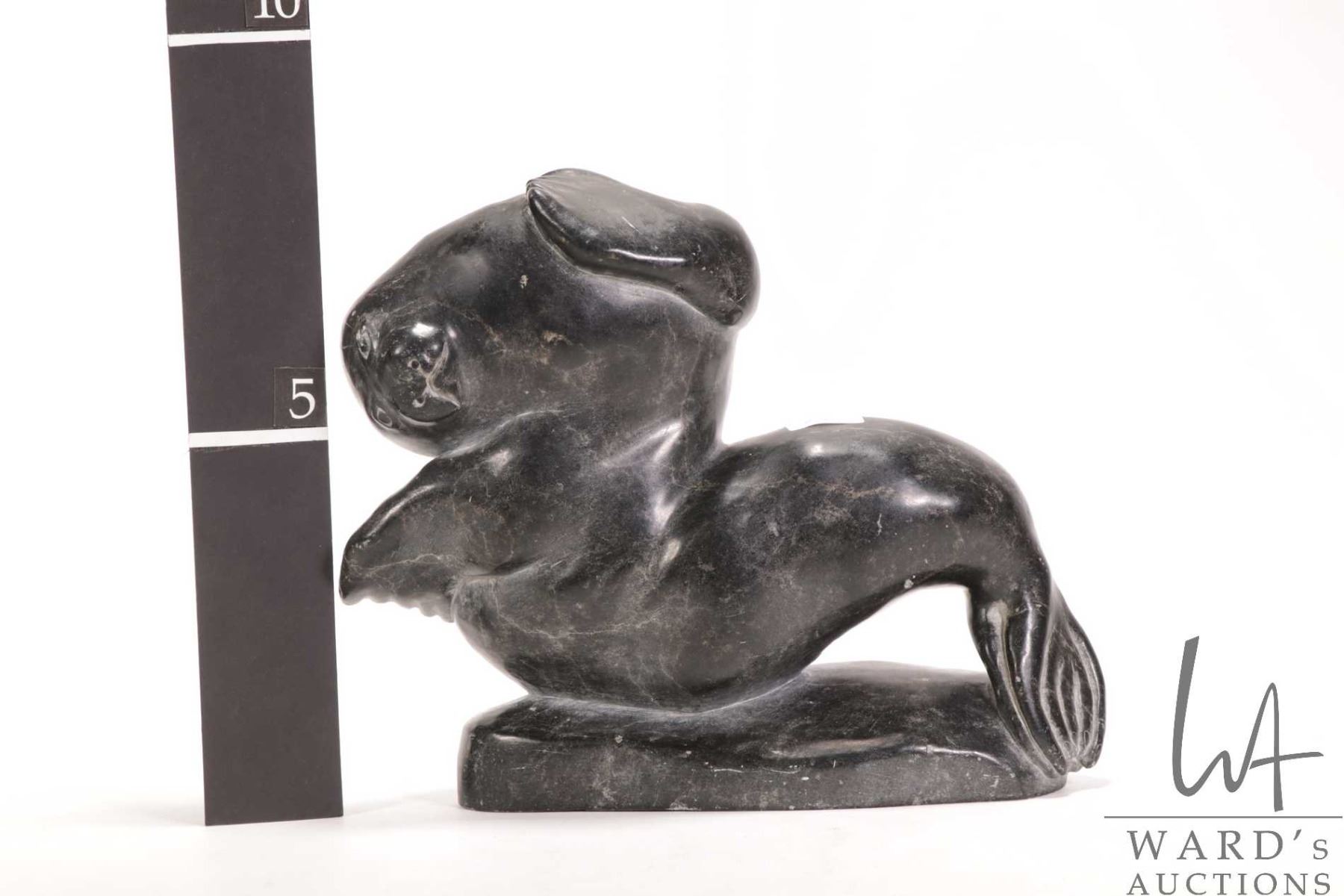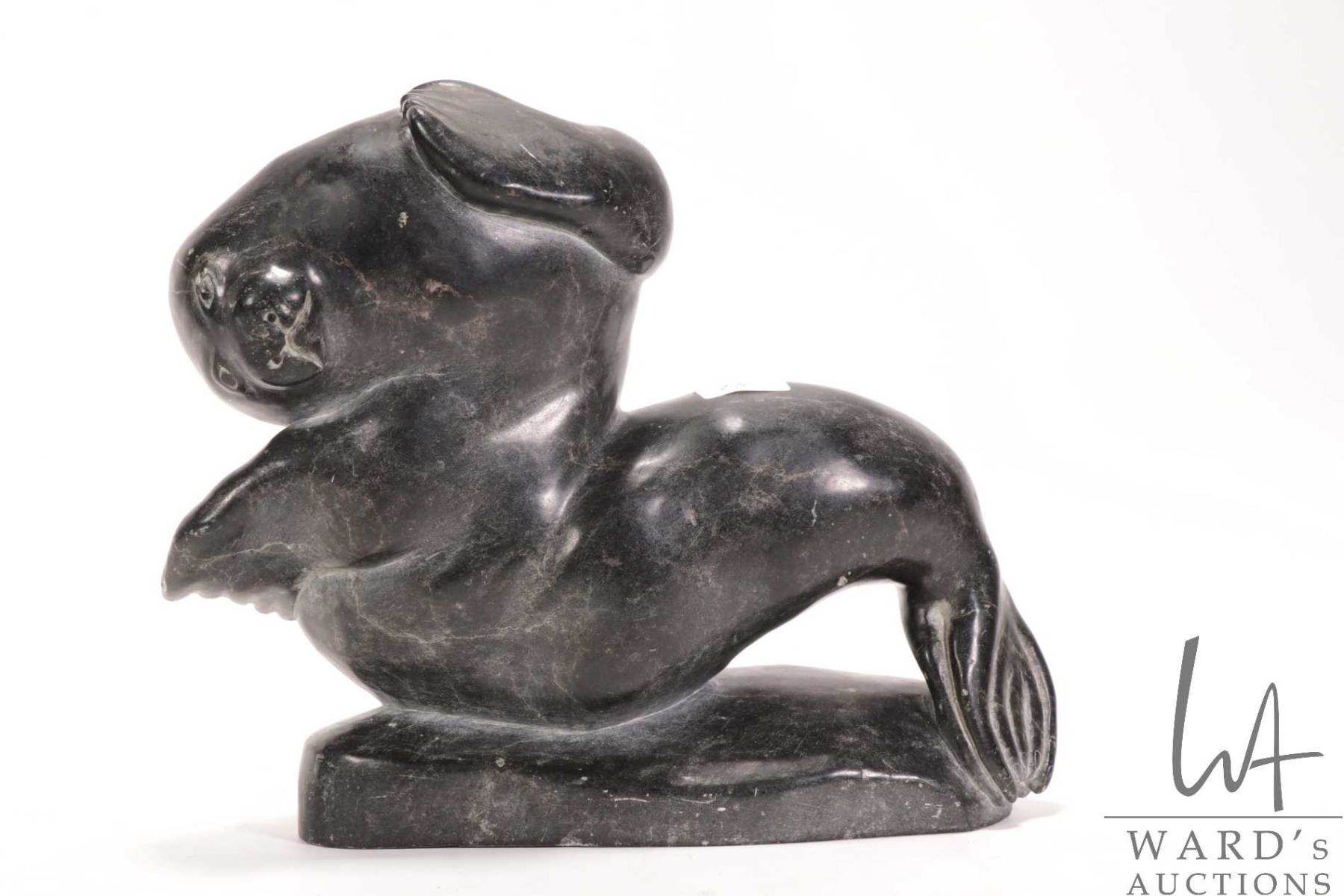 Inuit carved black soapstone seal, labeled Kanayook, 8 1/2" H X 9" L