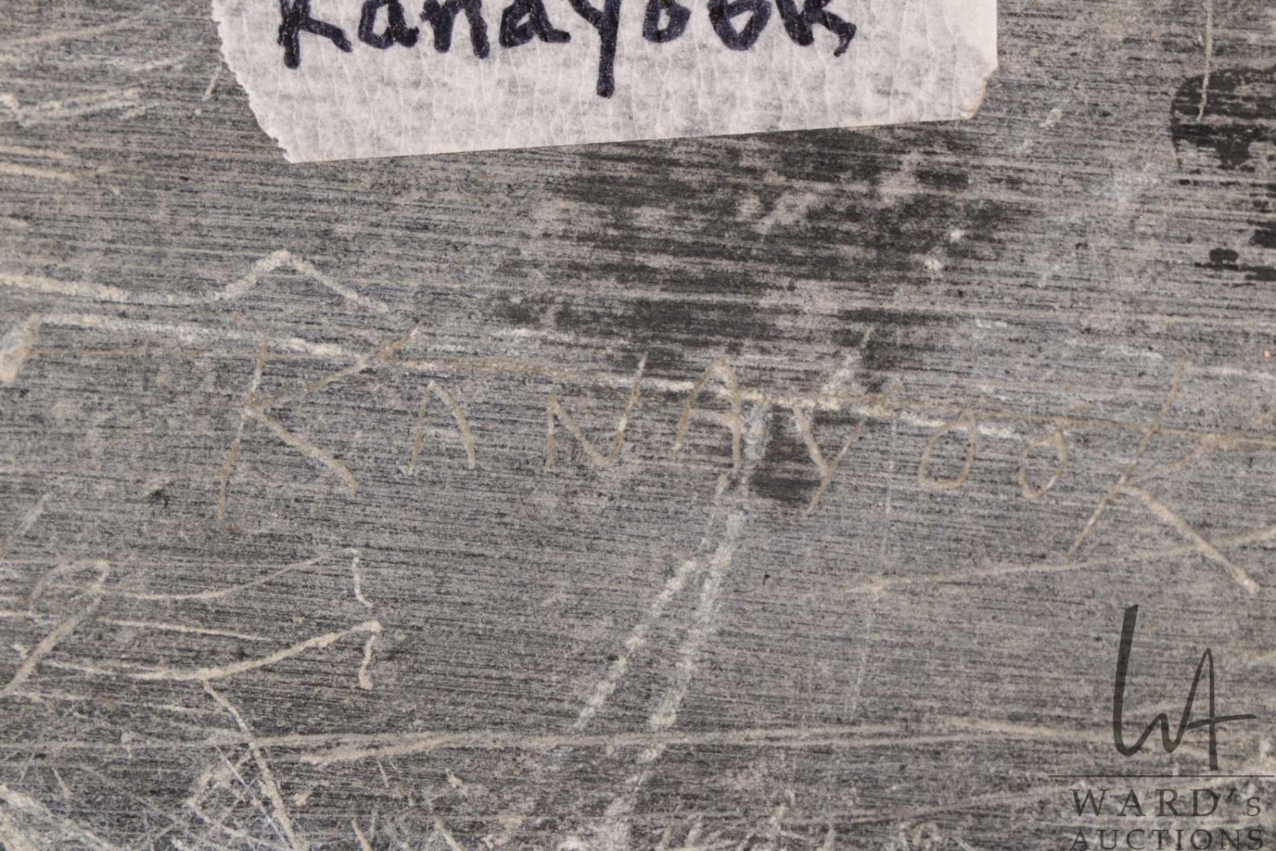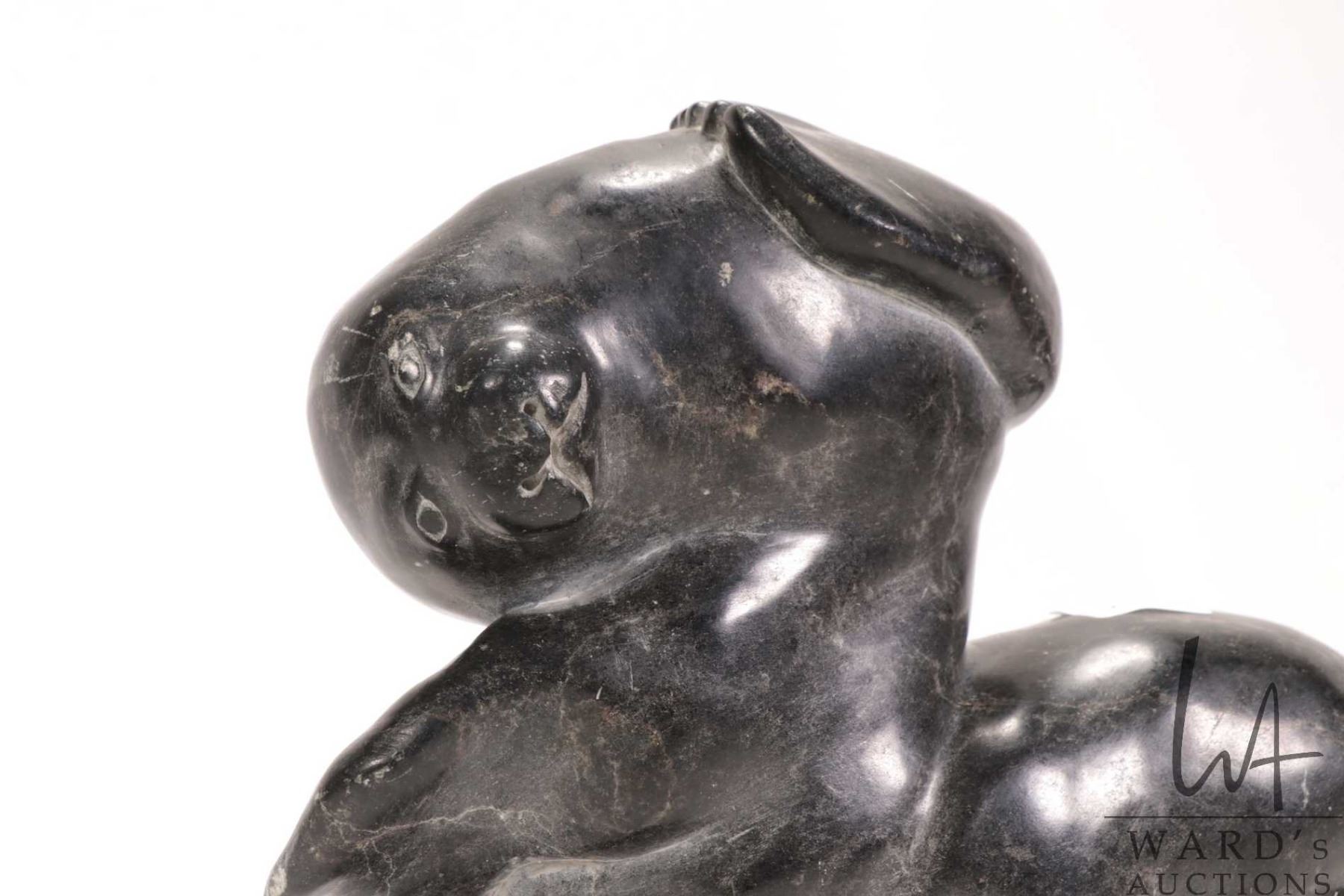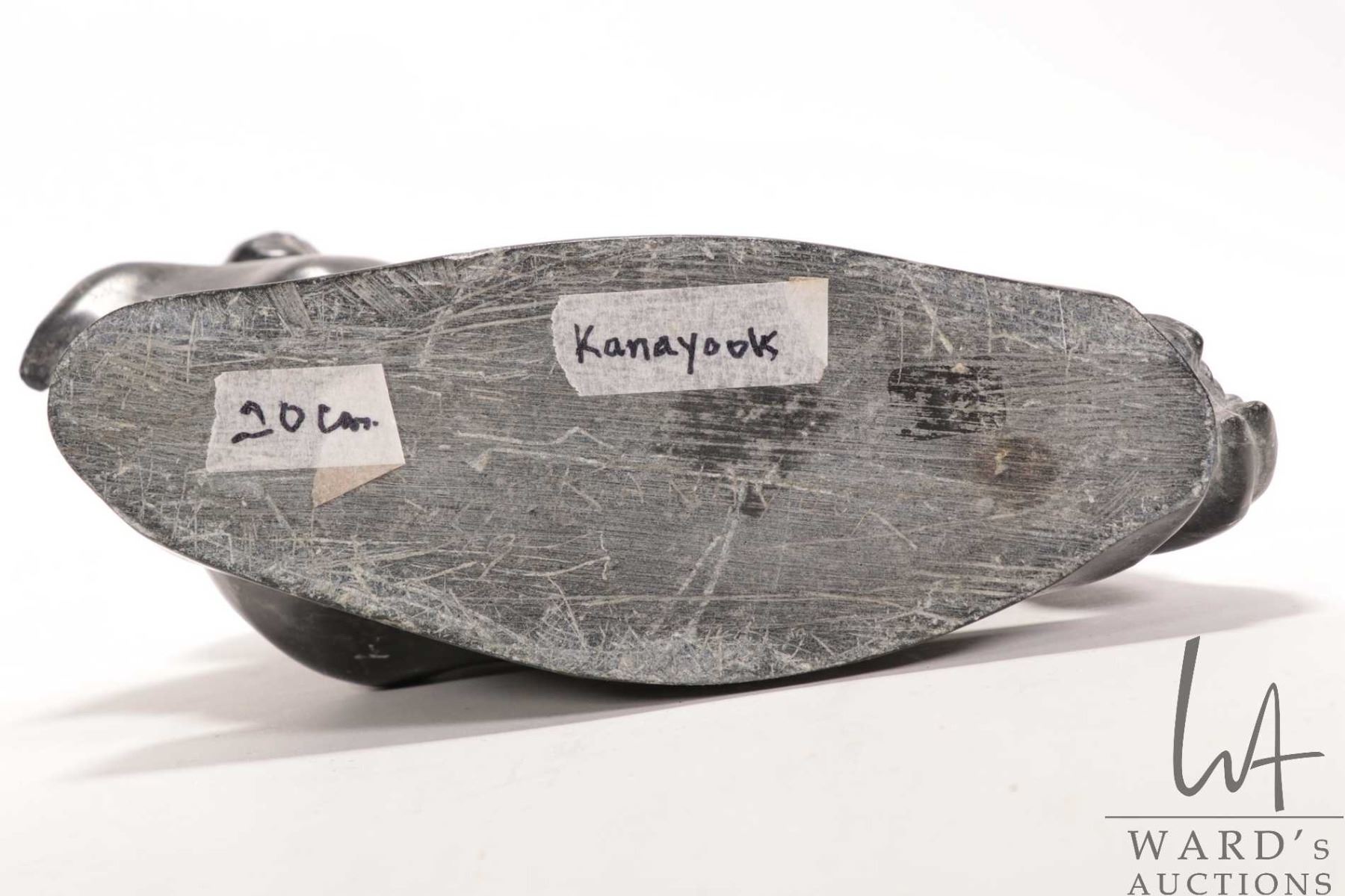 Inuit carved black soapstone seal, labeled Kanayook, 8 1/2" H X 9" L