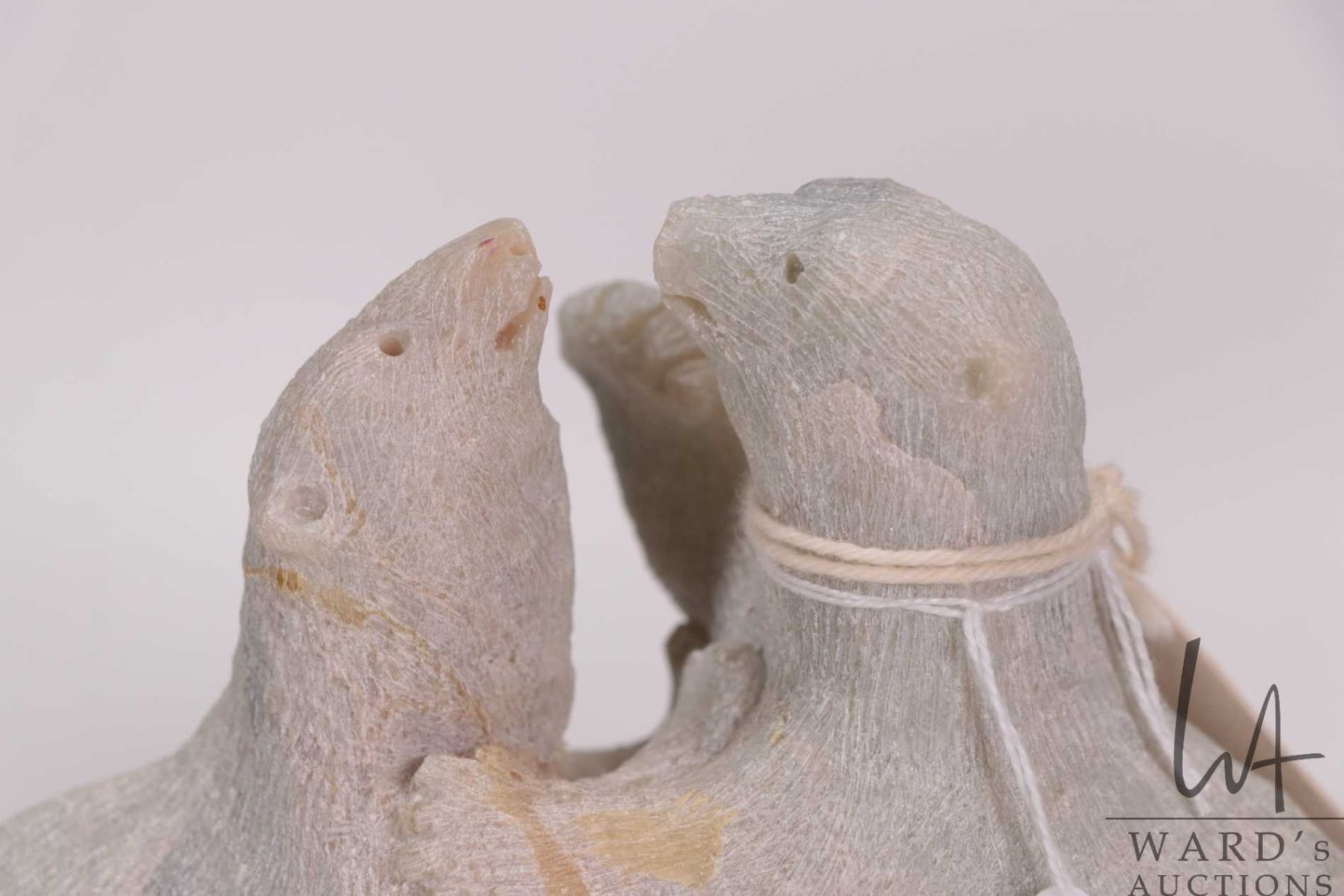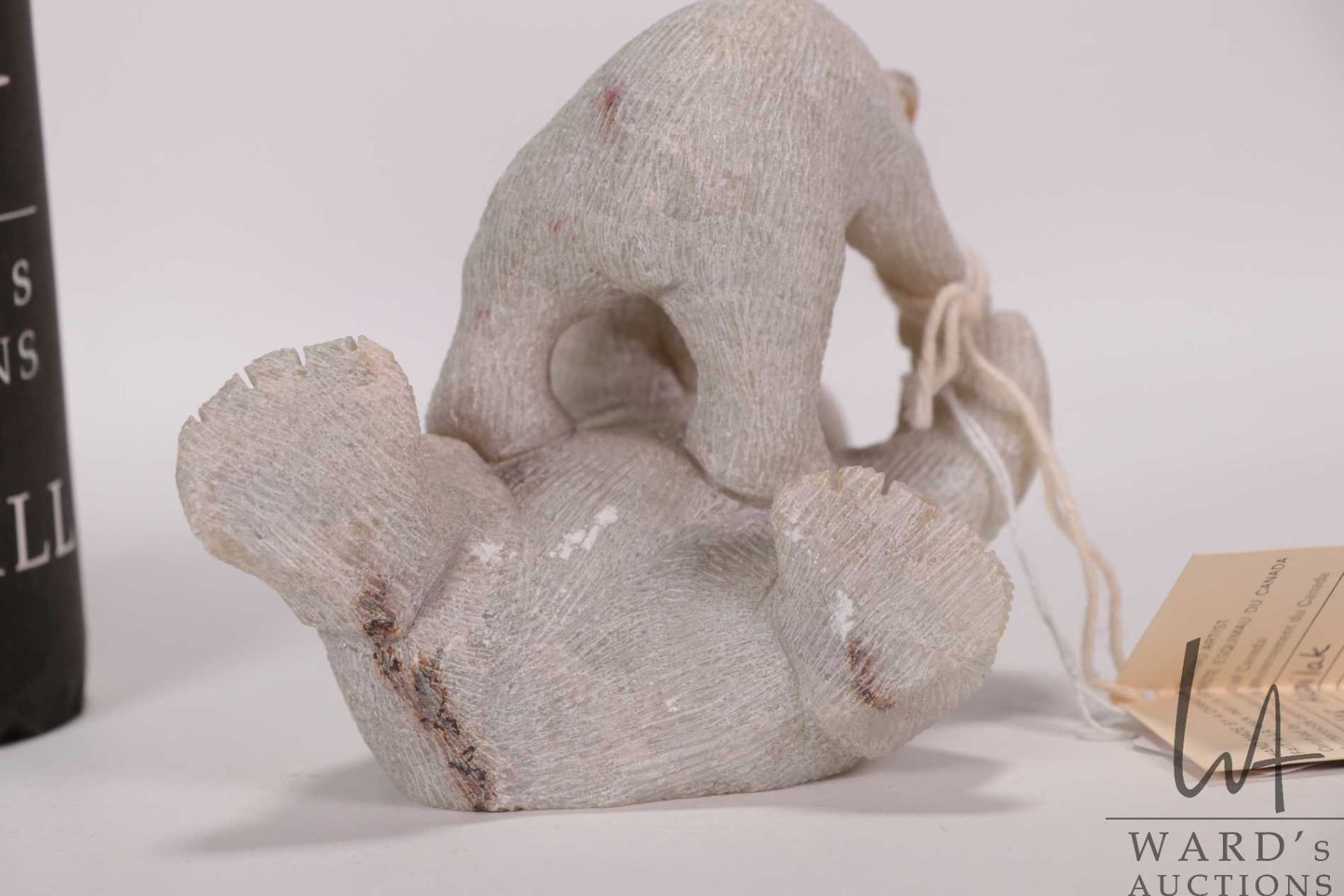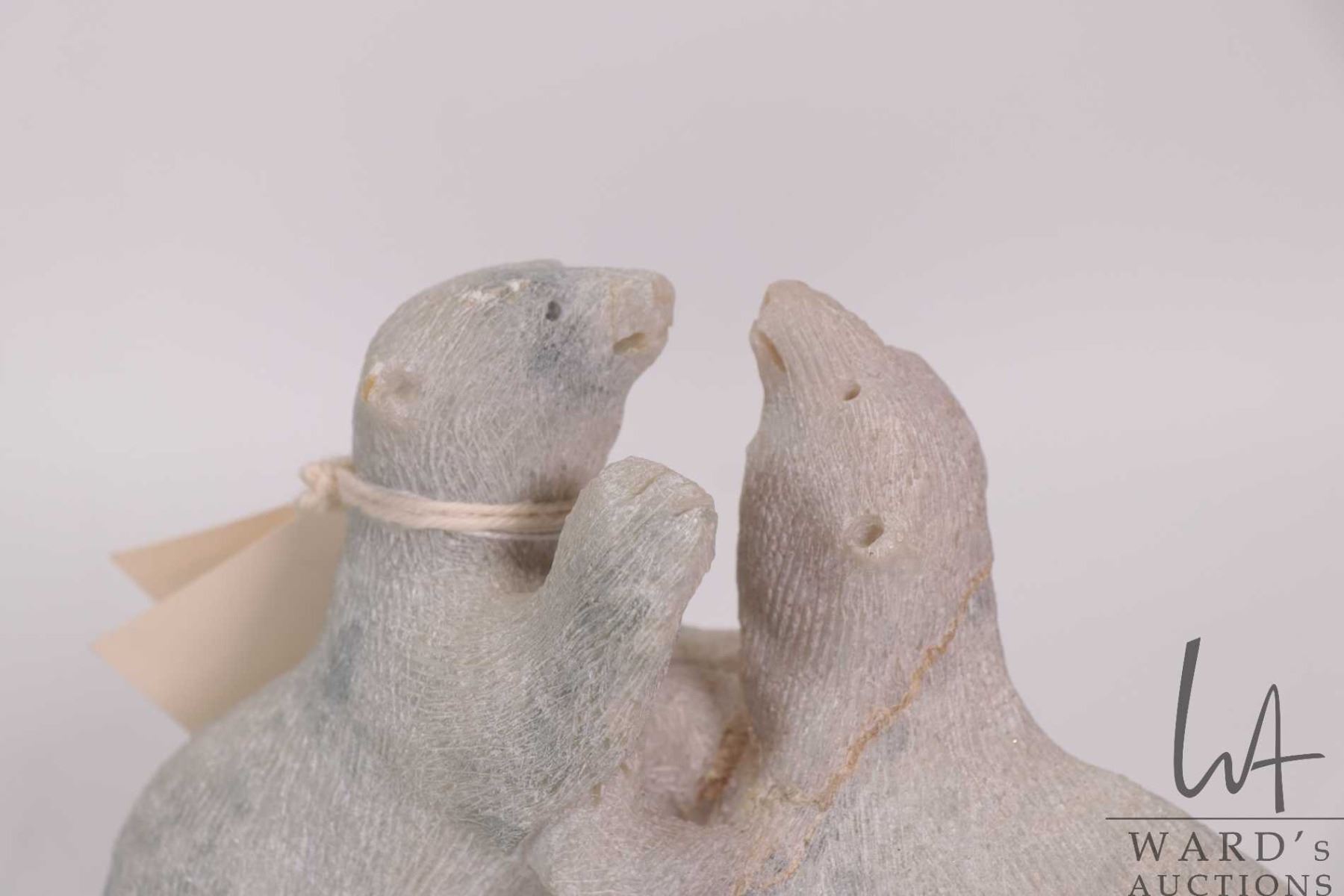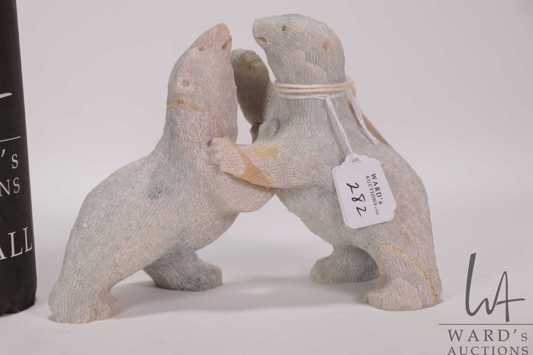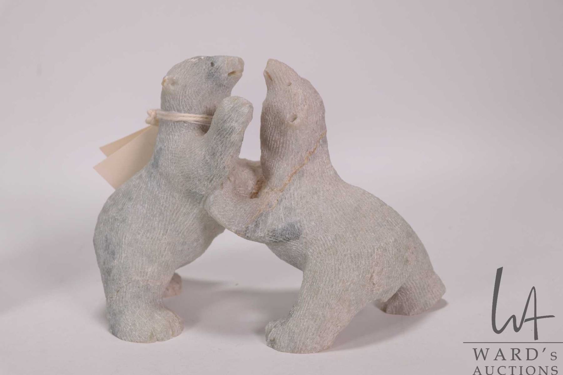Inuit carved soapstone sculpture Two Bears Playing by artist Douglas Akoilak, Nunavut, 1992, 5" X 6"