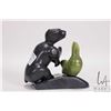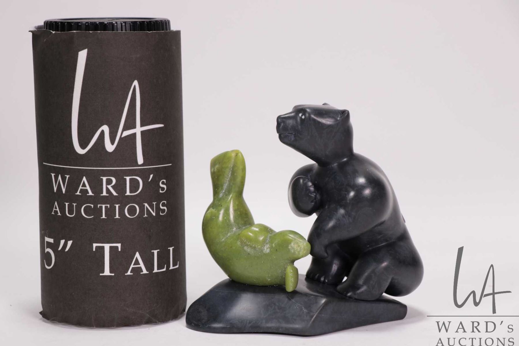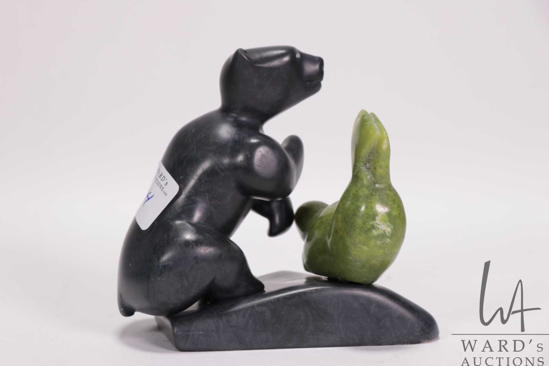 Inuit soapstone carved bear with green soapstone seal, 3 1/2" in height and signed by artist Adamie Amamtuak 2010