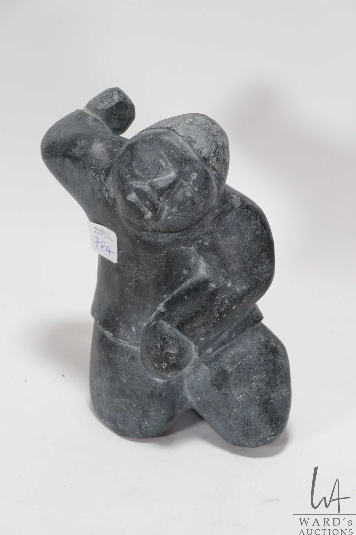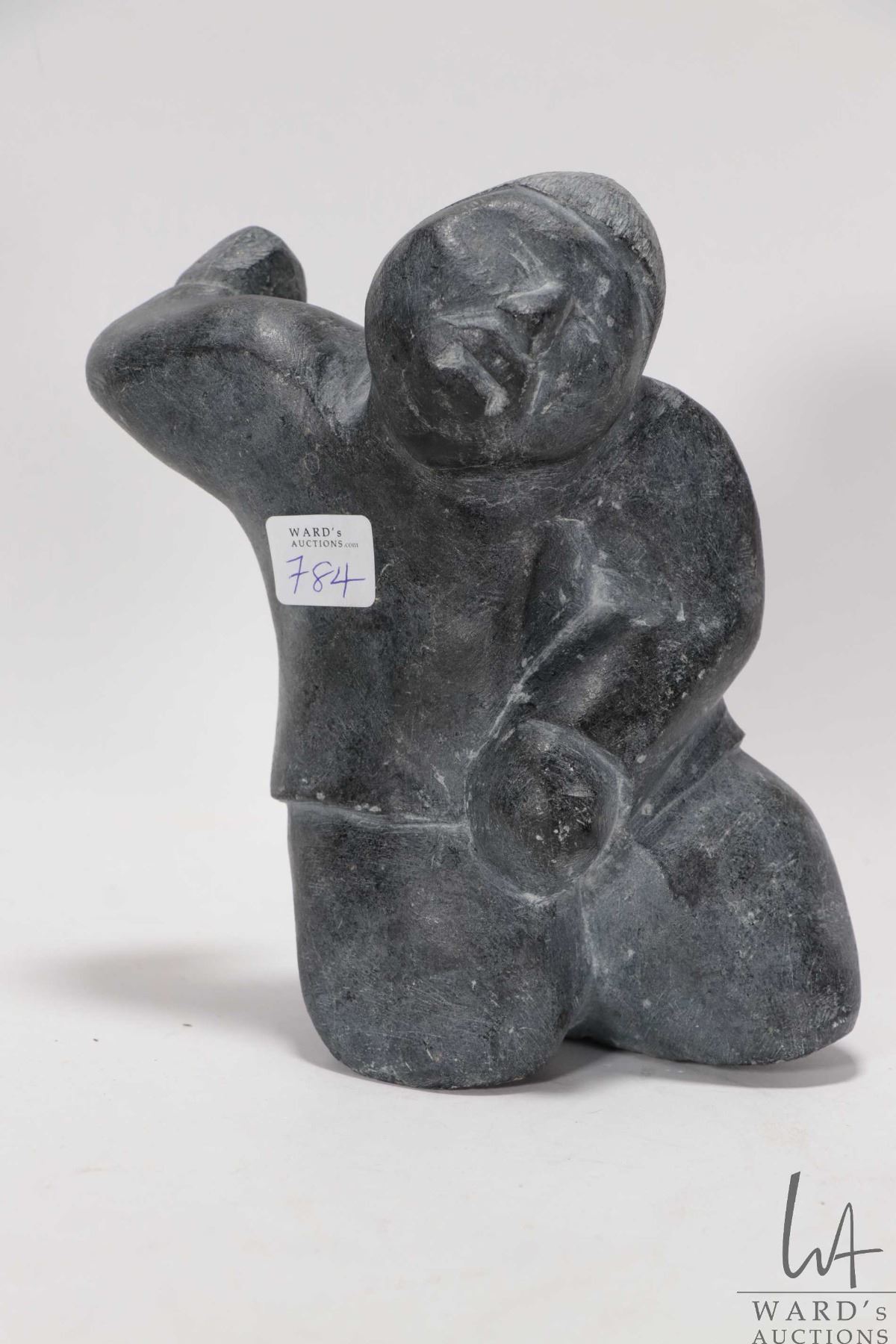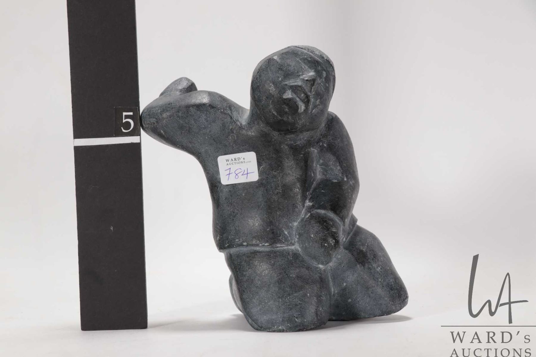 Inuit soapstone carved figure of a man, signed in syllabics, 7 1/2" in height