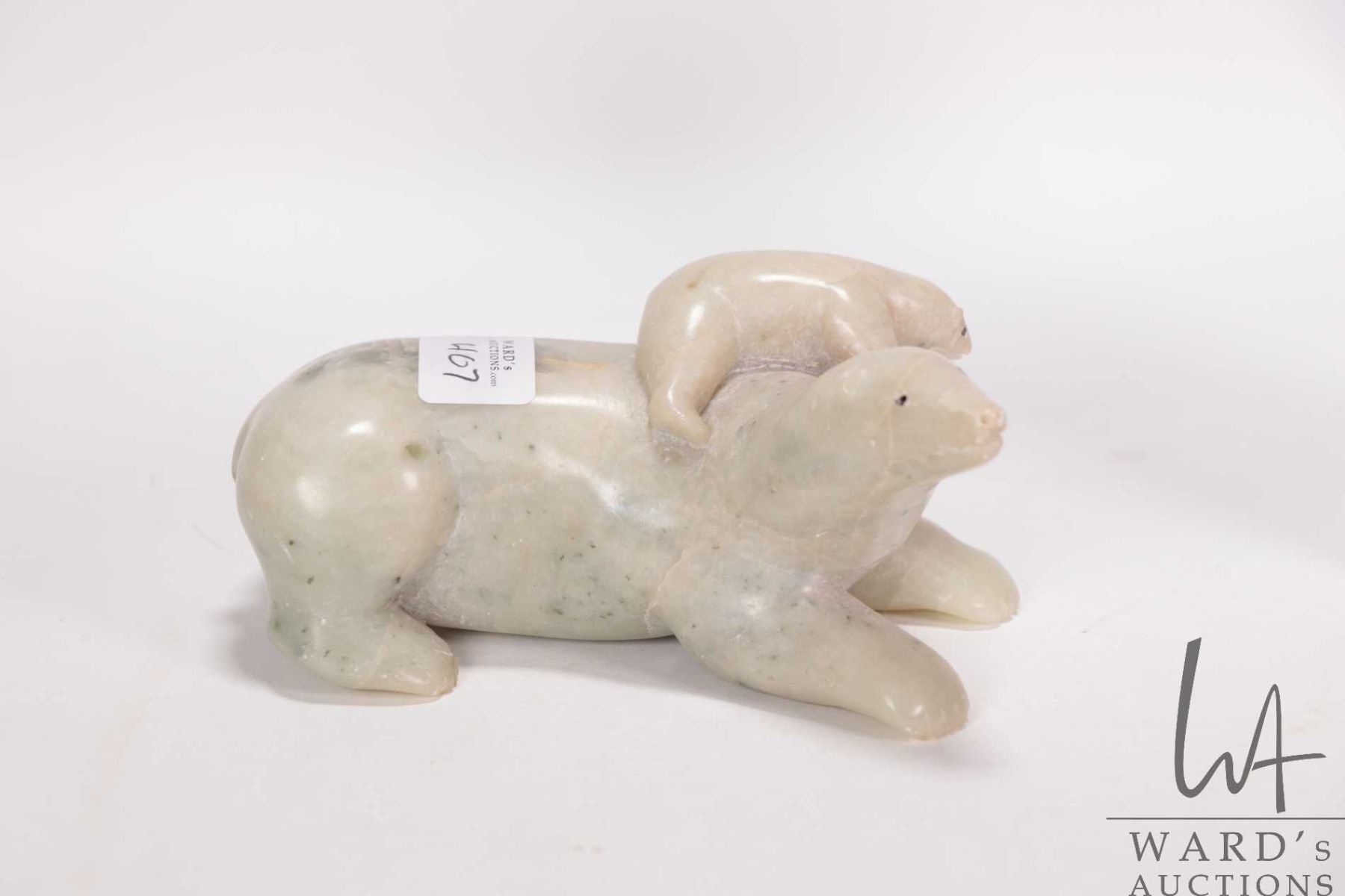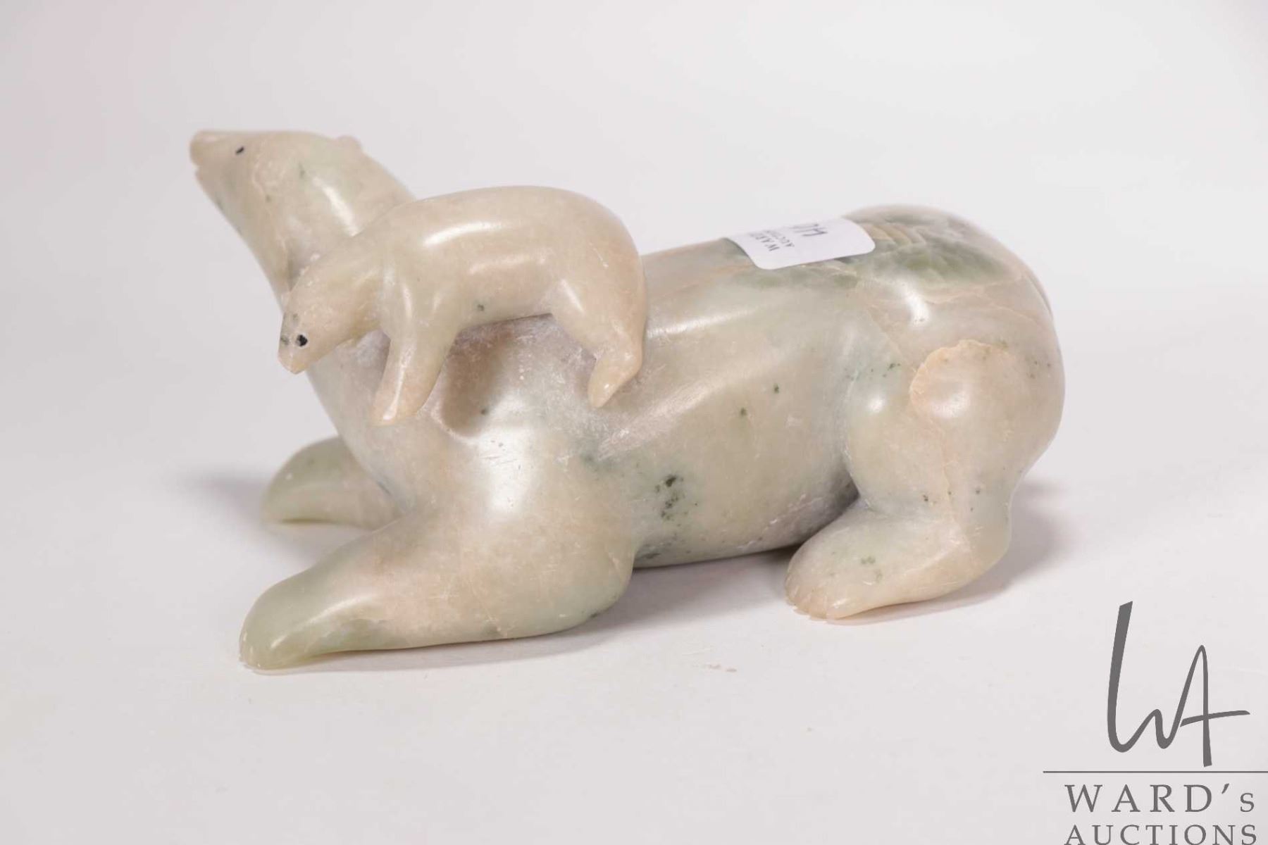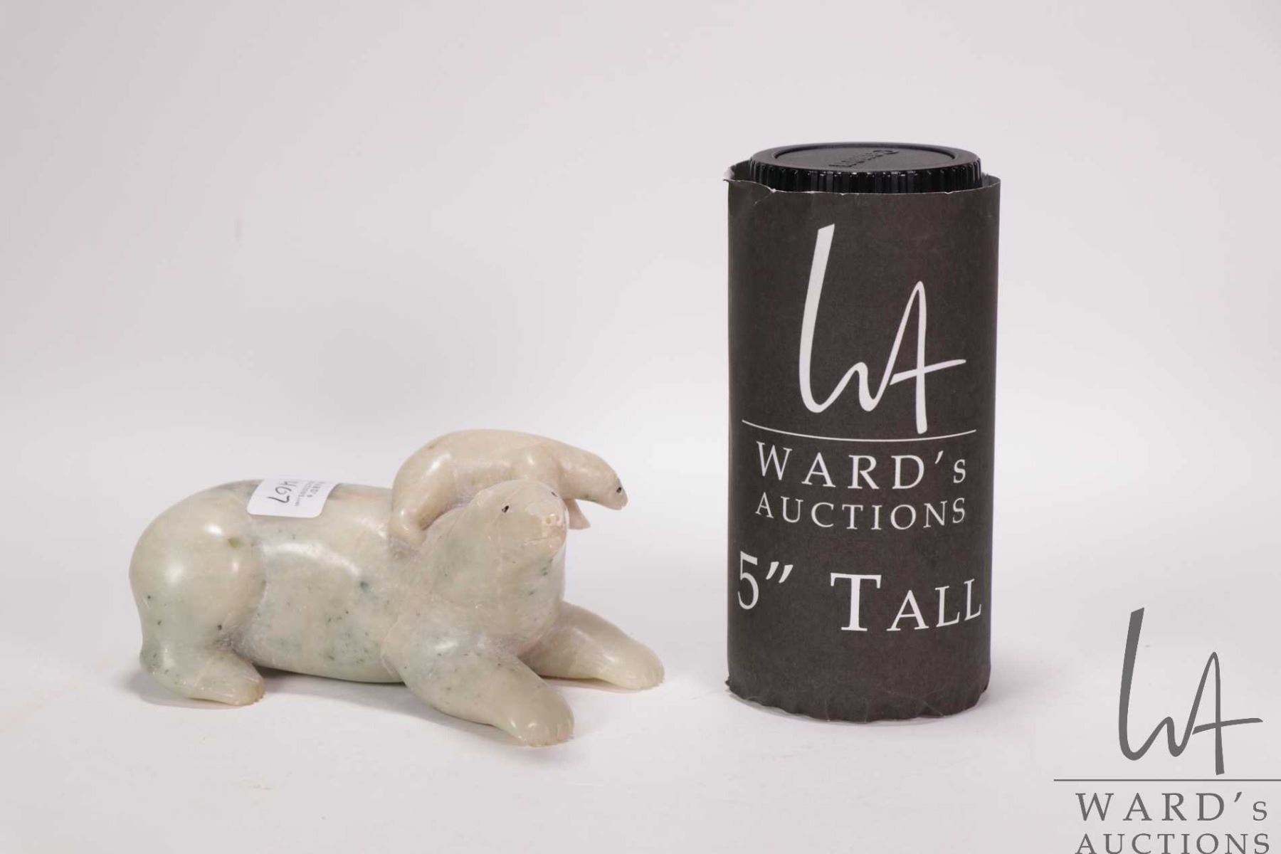 Inuit soapstone carving - Momma ear carrying baby bear, 5" long X 2 1/2"
