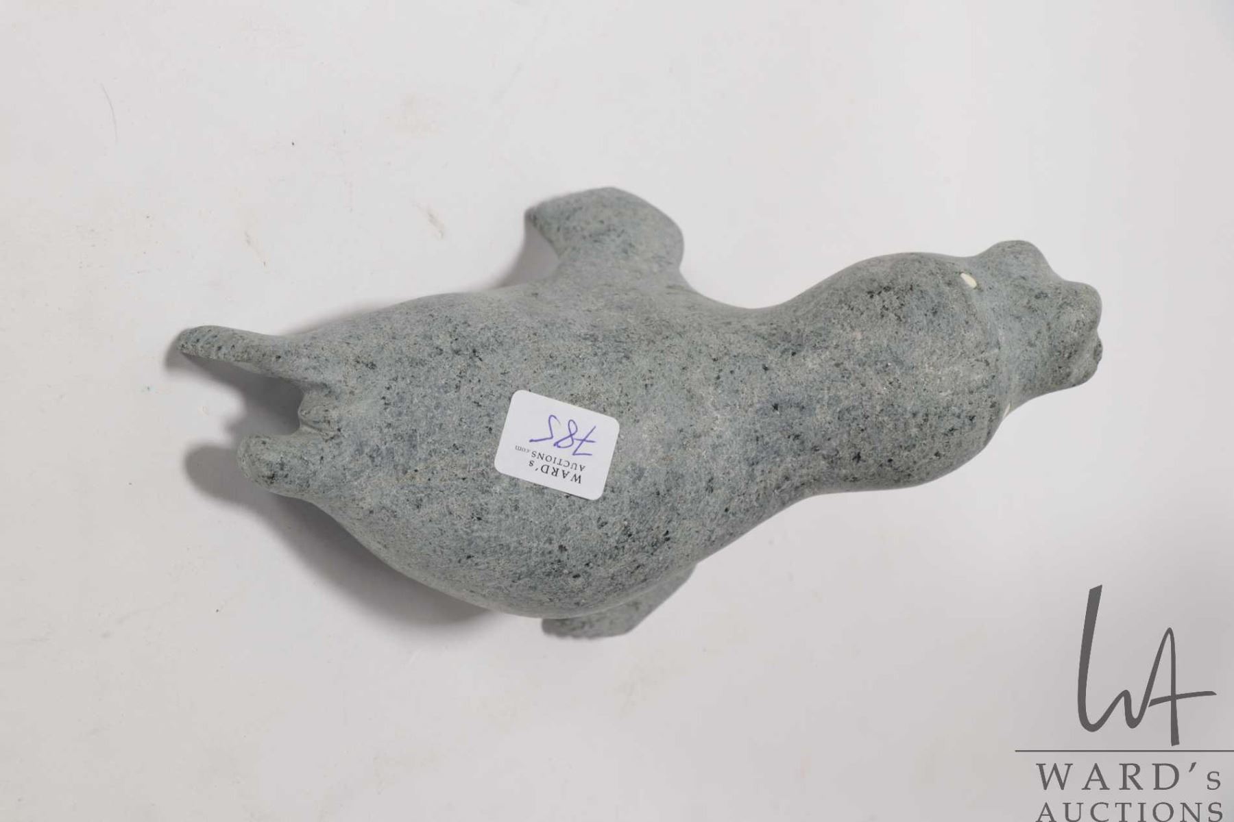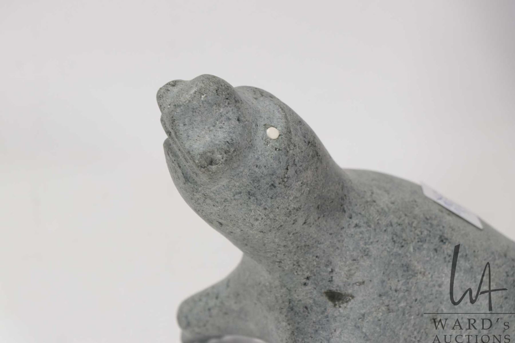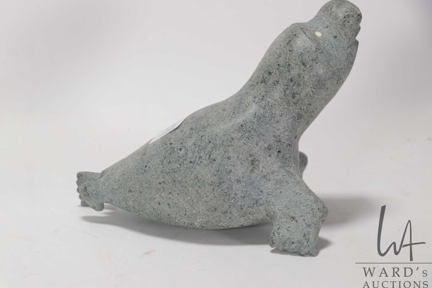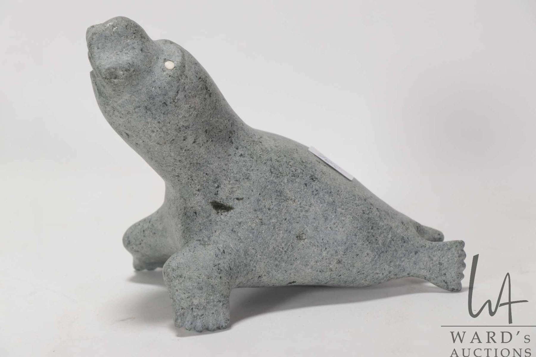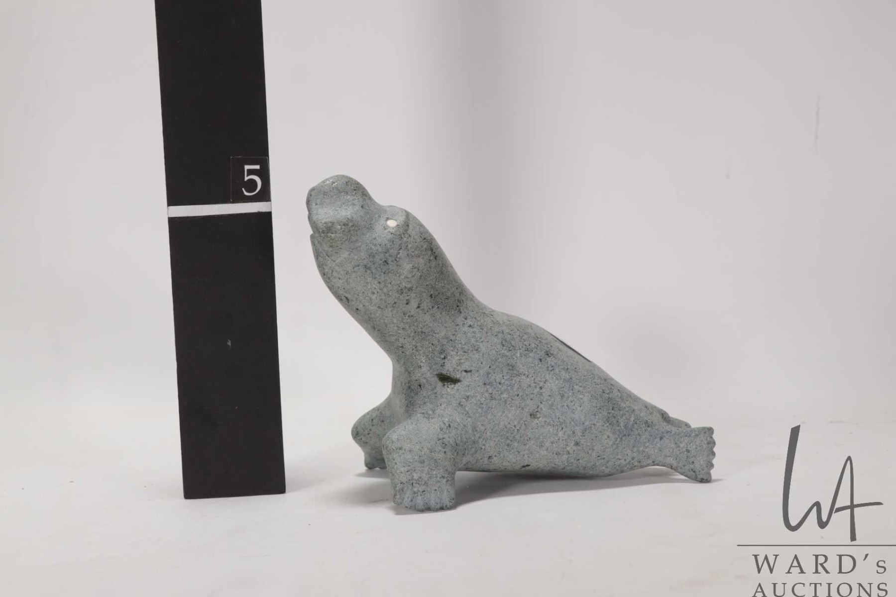 Inuit soapstone carving of a seal with inlaid bone eyes, no artist signature seen, 5 3/4" in height