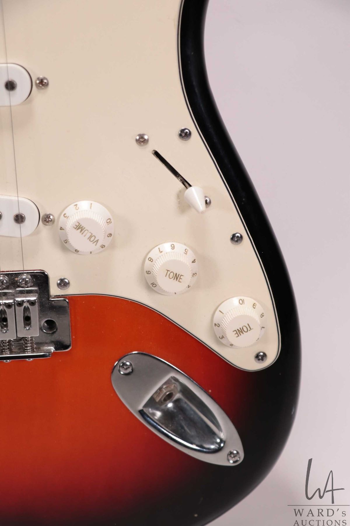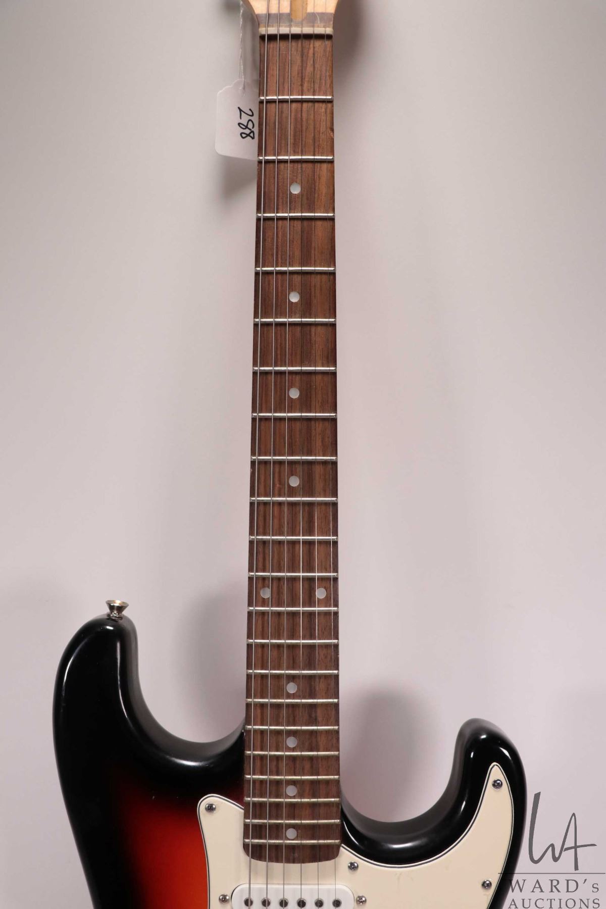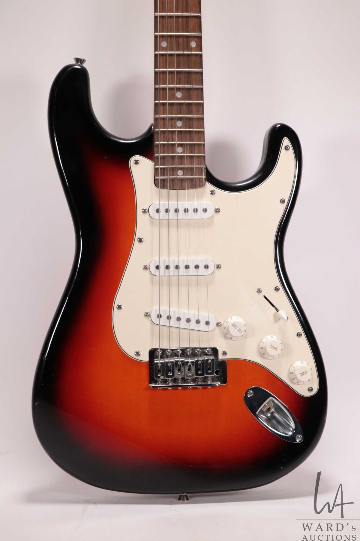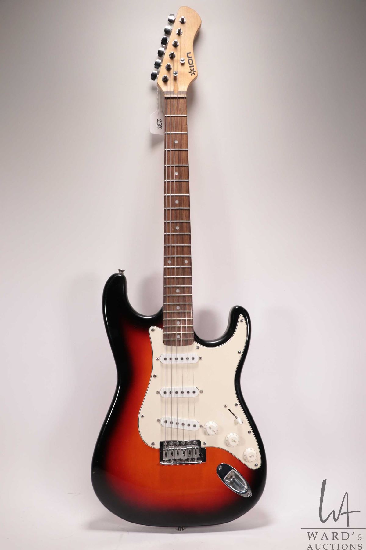 Ion Strat style guitar with pearloid dot neck, SSS pickup configuration, five way switch and three controls