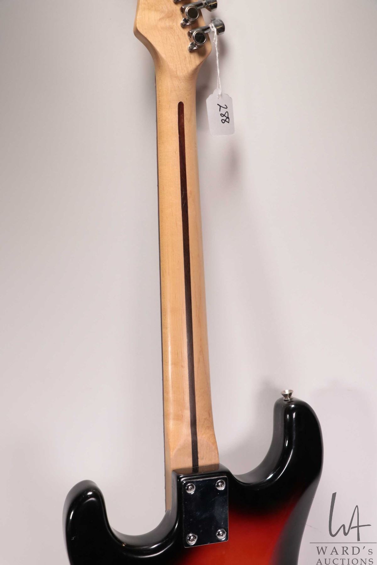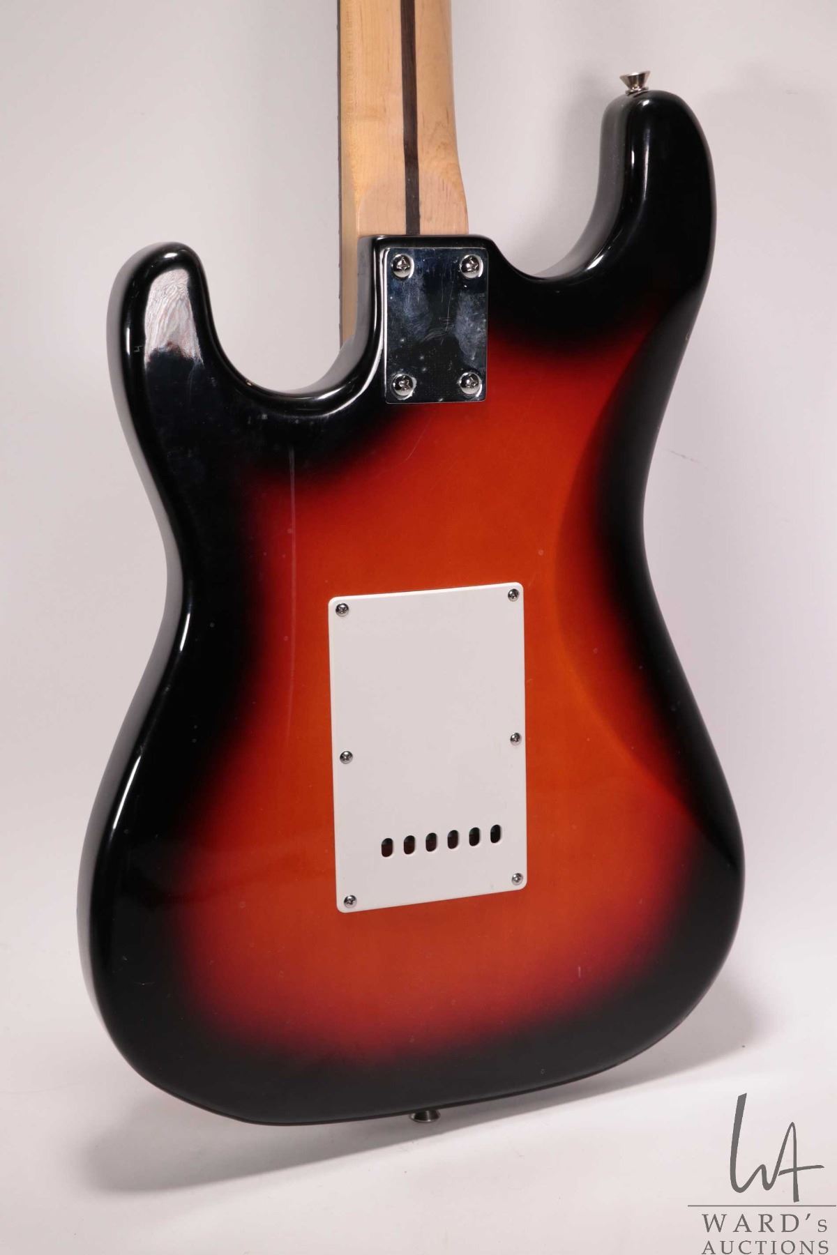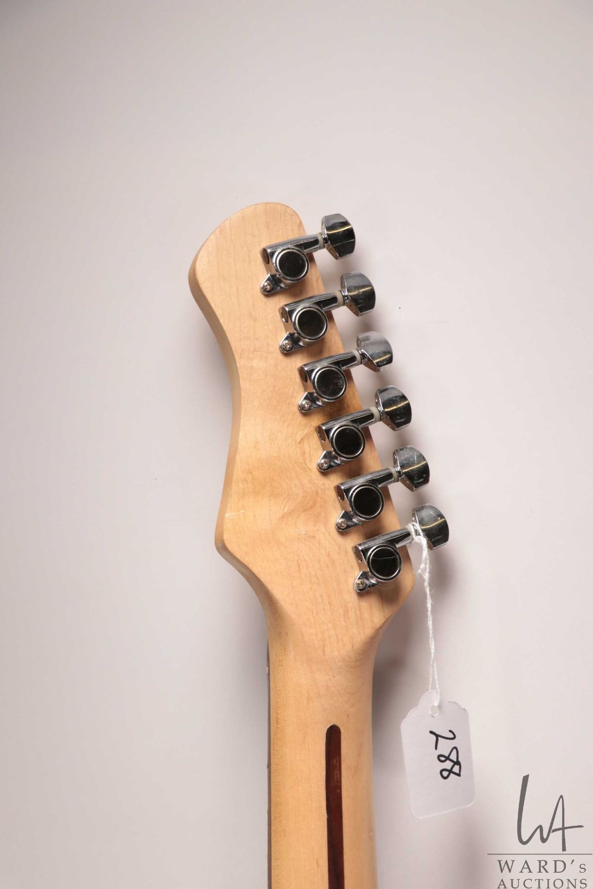 Ion Strat style guitar with pearloid dot neck, SSS pickup configuration, five way switch and three c