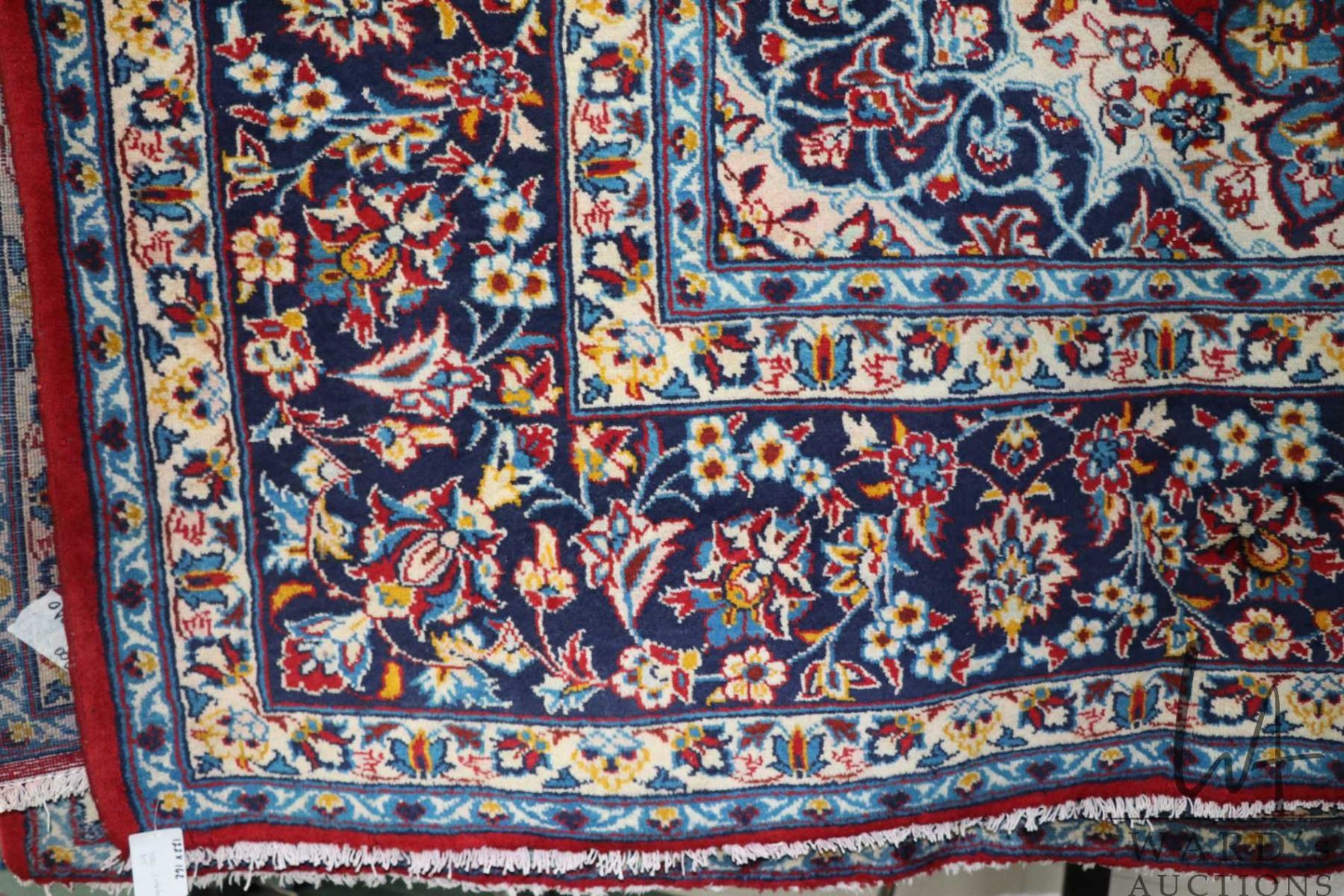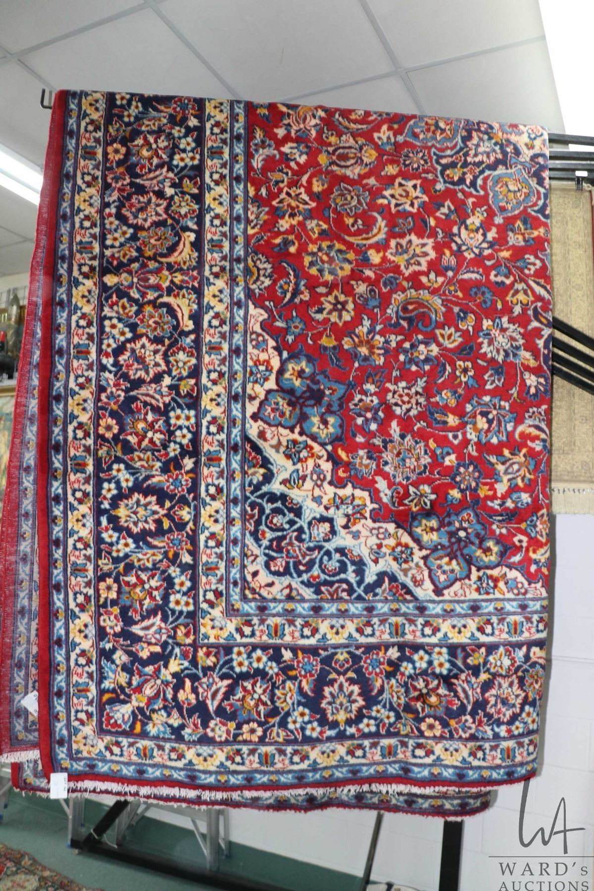Iranian wool carpet "Esfahan" with center medallion, red background, overall floral design and highlights of blues, cream and orange, 122" X 162"