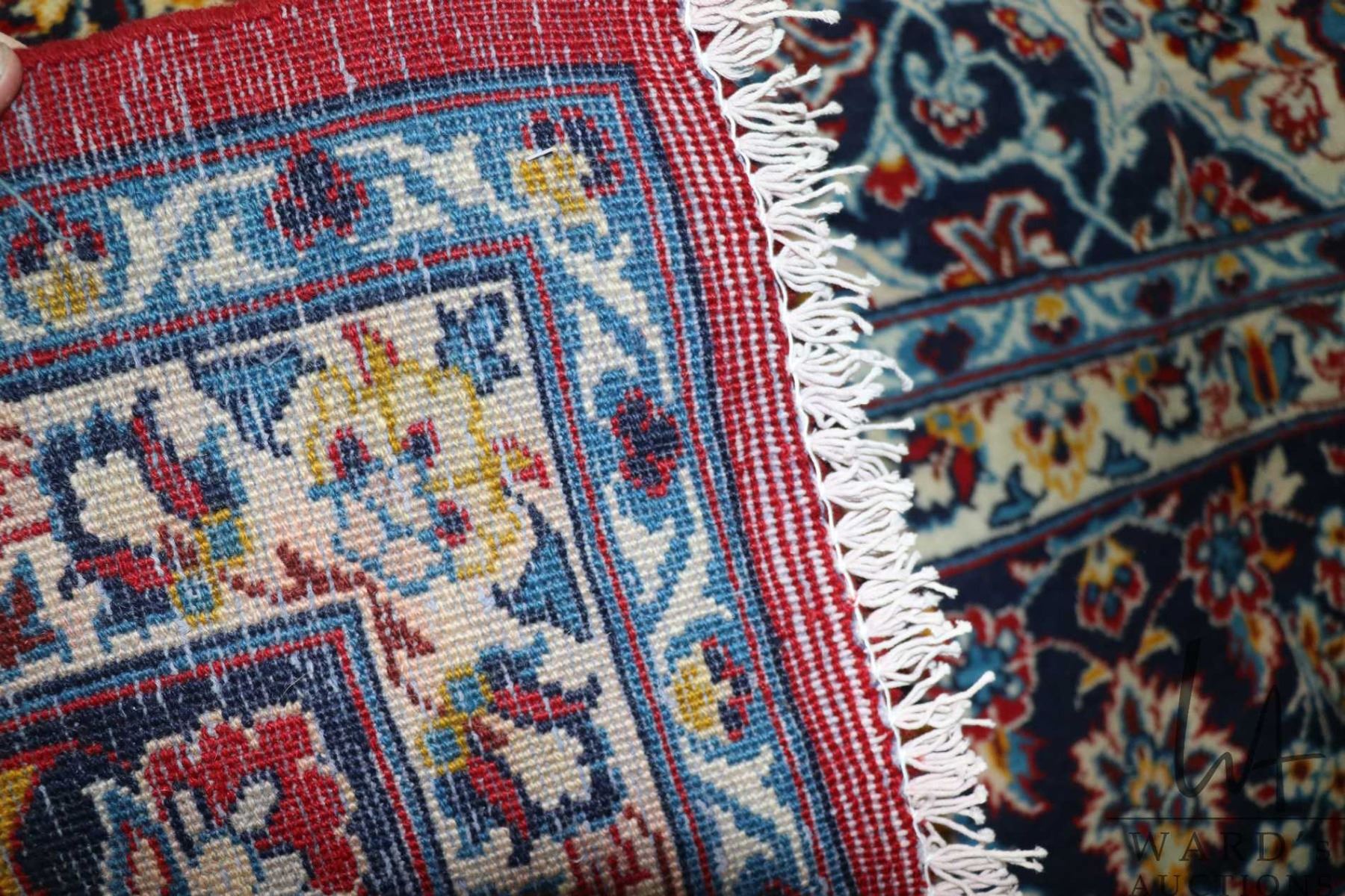 Iranian wool carpet "Esfahan" with center medallion, red background, overall floral design and highl
