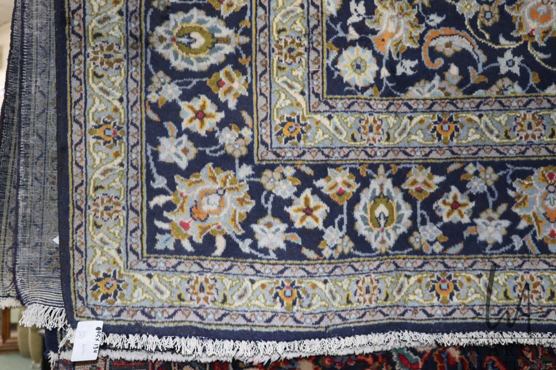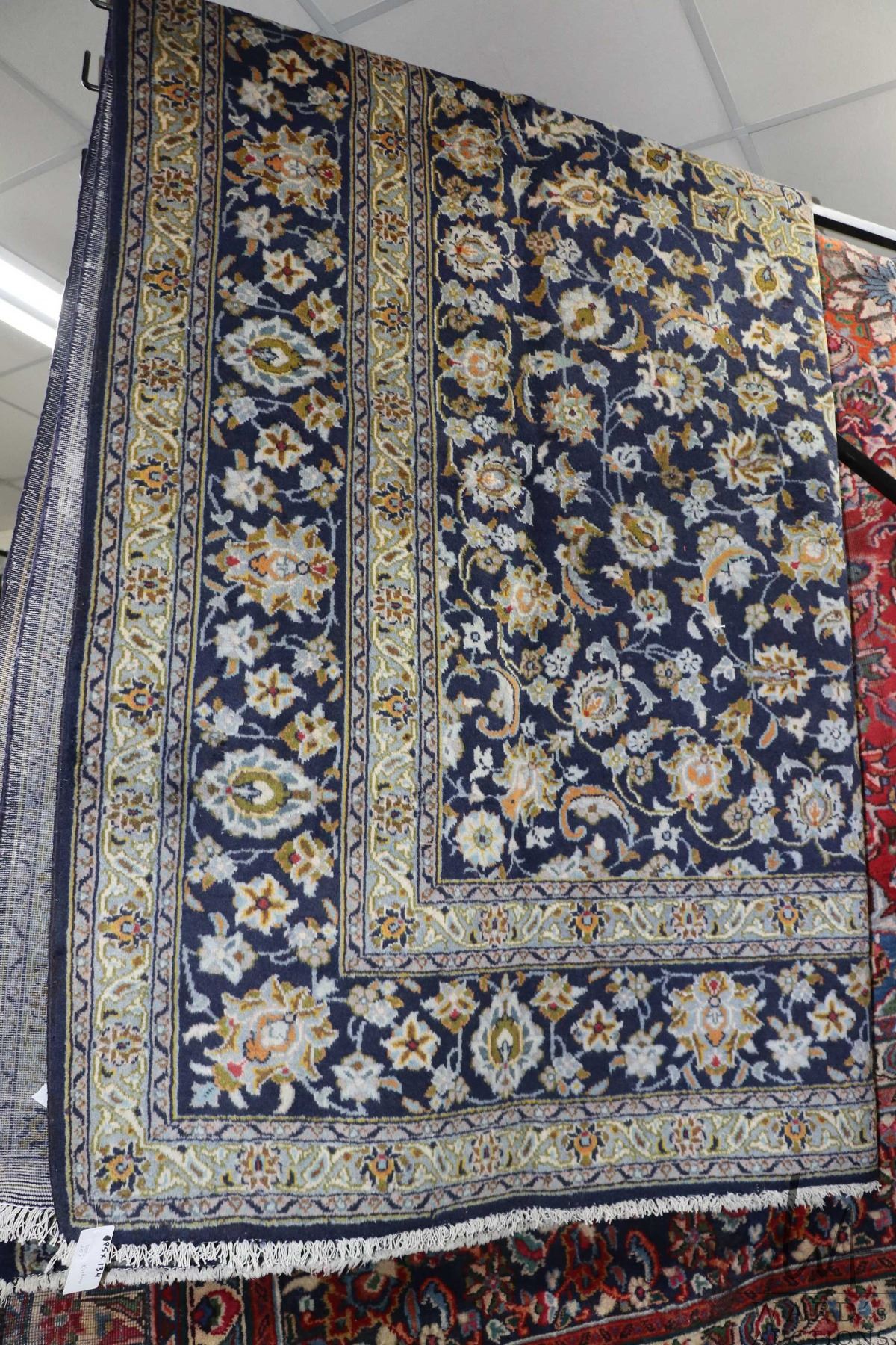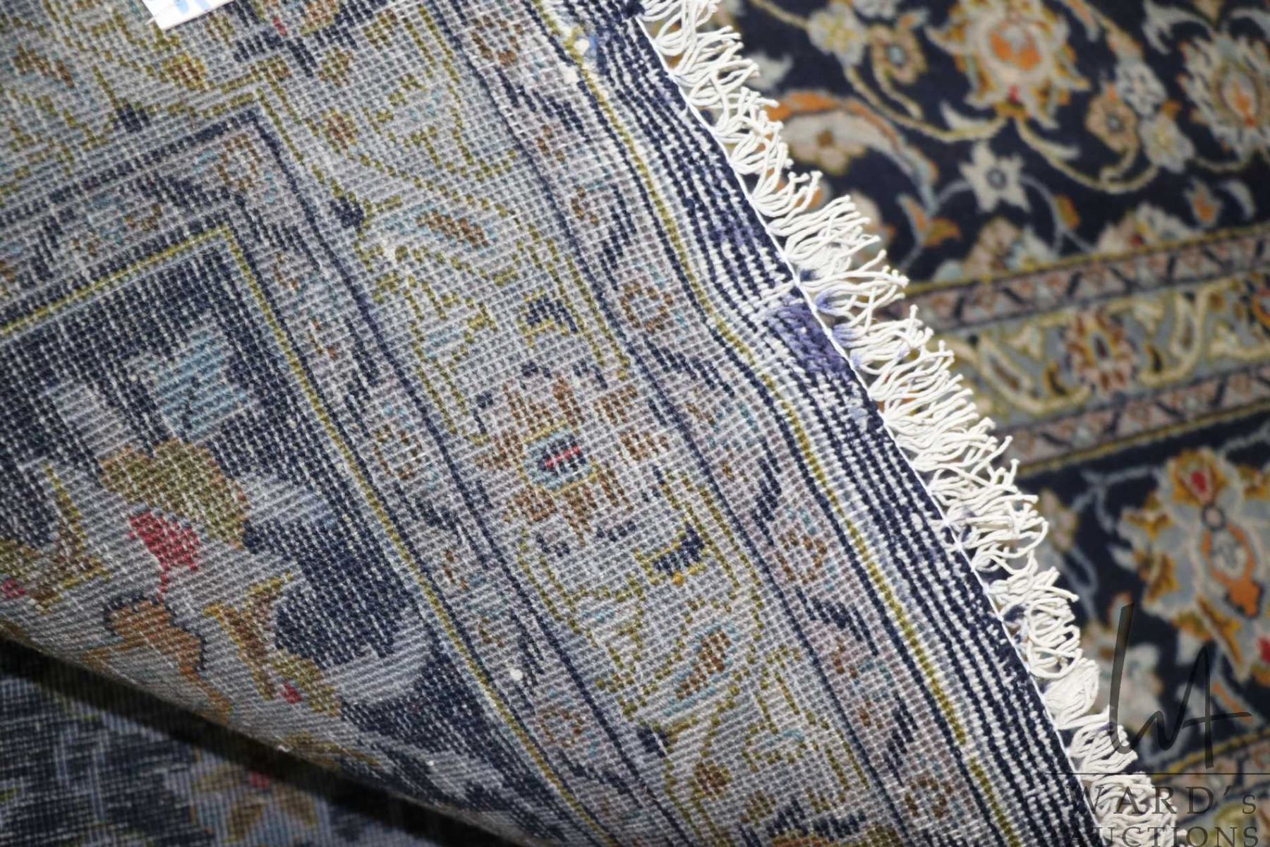 Iranian wool carpet "Kashan" with center medallion on blue background with overall floral design and