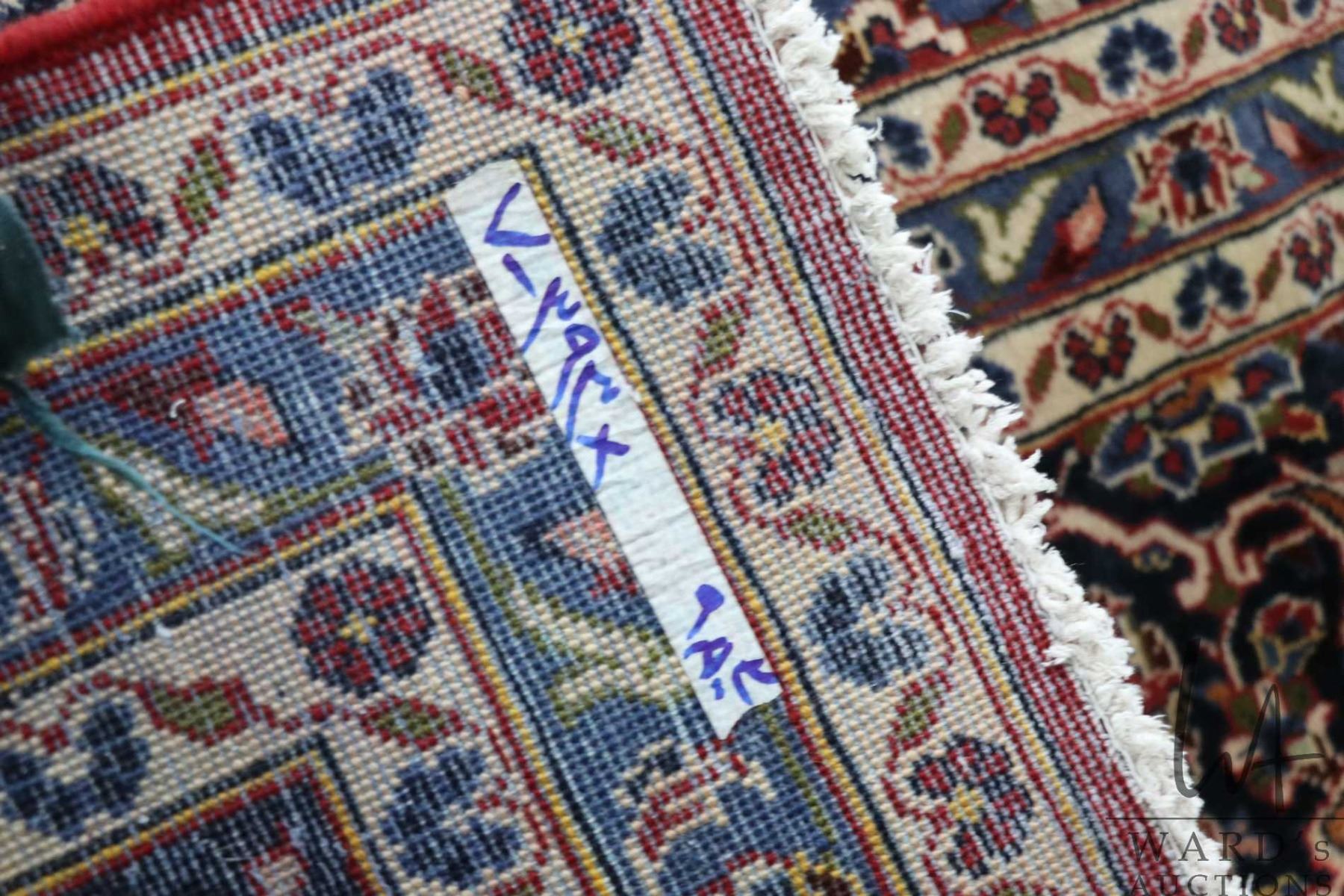Iranian wool carpet "Kashan" with center medallion, red background, overall floral design and highlights of blue, cream and brick, 116" X 158"
