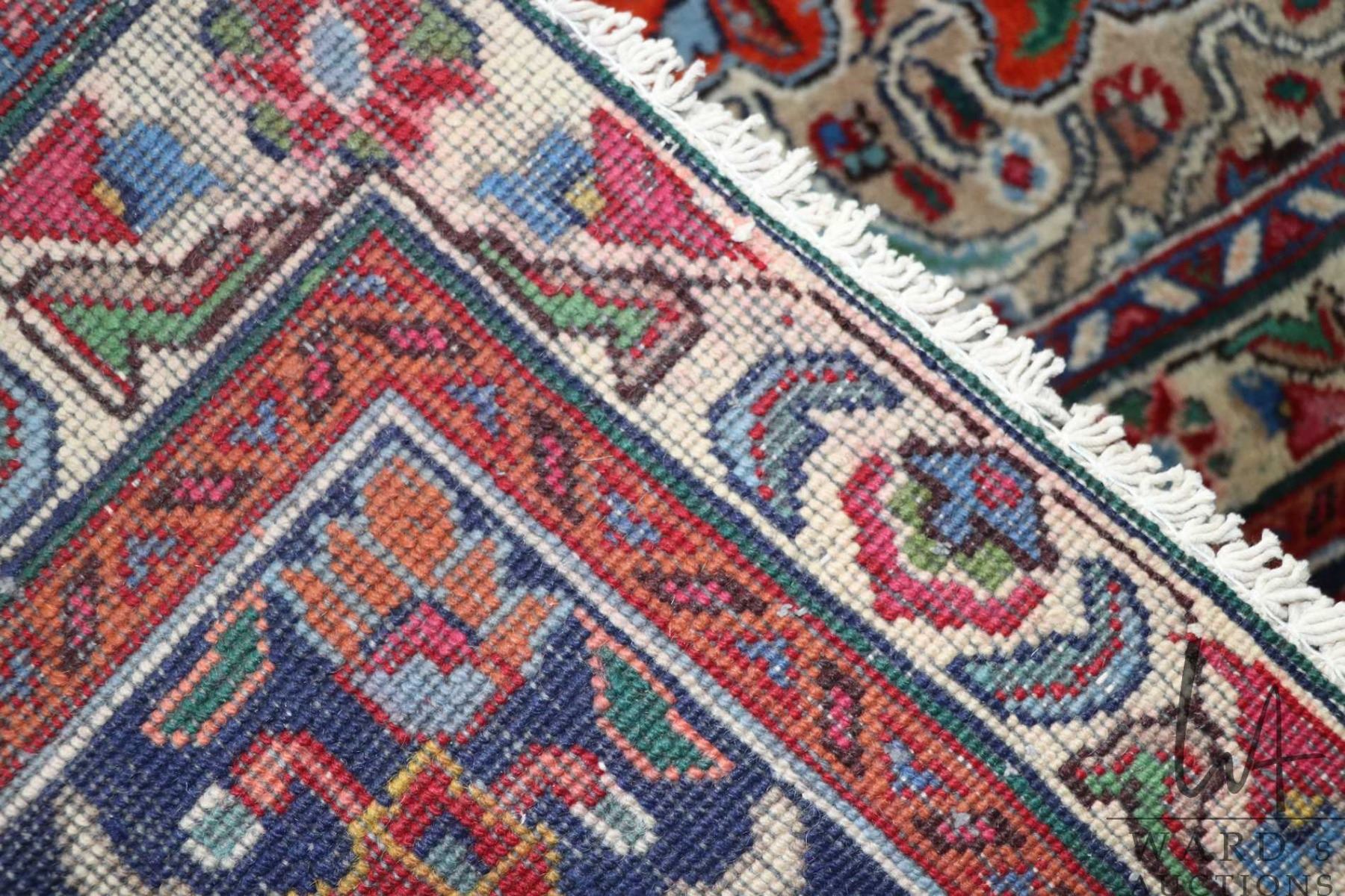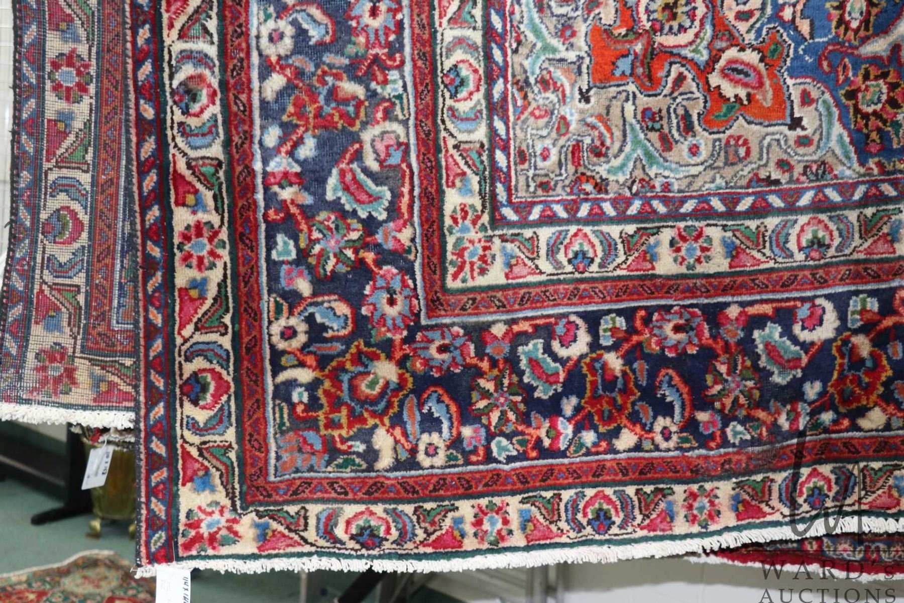 Iranian wool carpet "Mashad" with center medallion on red background and highlights of blues, taupe, cream etc. 114" X 144"