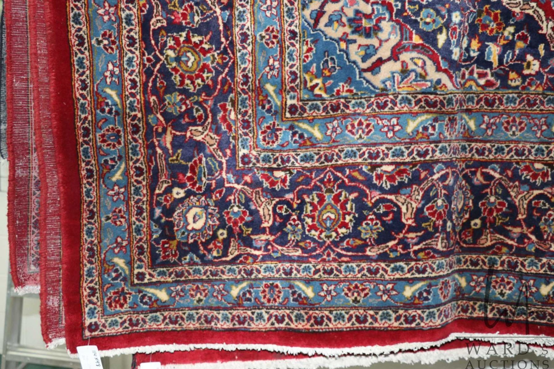 Iranian wool carpet "Mashad" with center medallion on red background, overall floral design and highlights of blues, sage, cream etc.. 114" X 158"