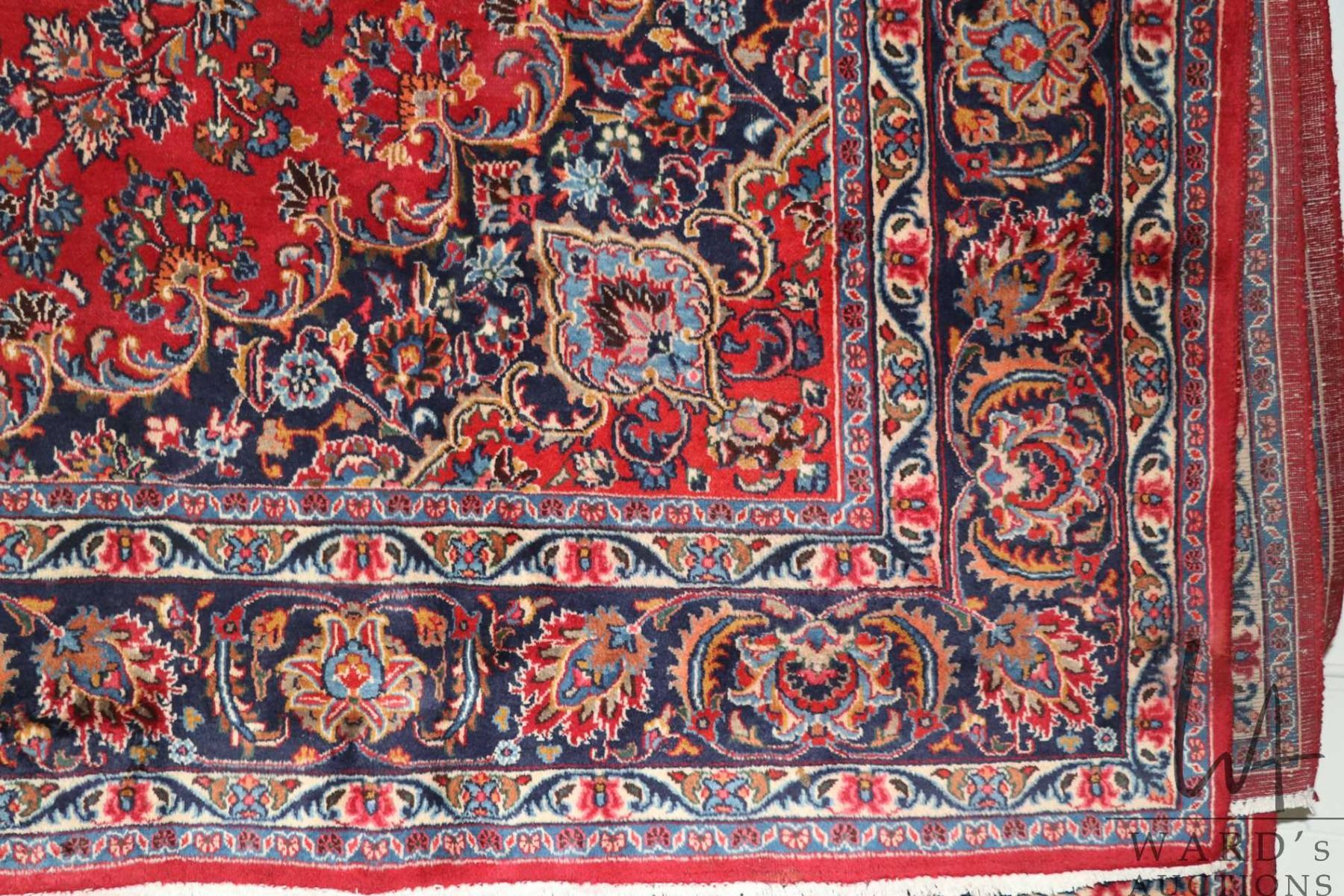 Iranian wool carpet "Mashad" with center medallion on red background with overall floral design and highlights of blues, orange, pink etc. 114" X 150"
